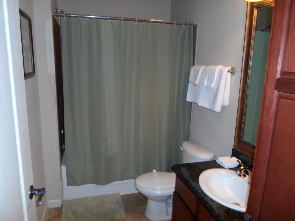 The master bedroom has a king-size bed with a grand wooden headboard. It has dressers, side tables, and a large mirrored sliding closet that gives the illusion of even more space. It boasts a beautiful marble en-suite bathroom where you can relax in the tub or have a shower in the separate walk-in cubicle. Thesecond master bedroom has a comfy queen sized bed and matching furniture. This room also has its own private bathroom. The third bedroom, which is ideal for children, has 2 twin beds and shares a communal bathroom that can be found on the hallway. Each room has its own ceiling fan to ensure that guests remain comfortable during the hot Florida months. For your convenience, you can do your own laundry in the condo’s washing machine and dryer.