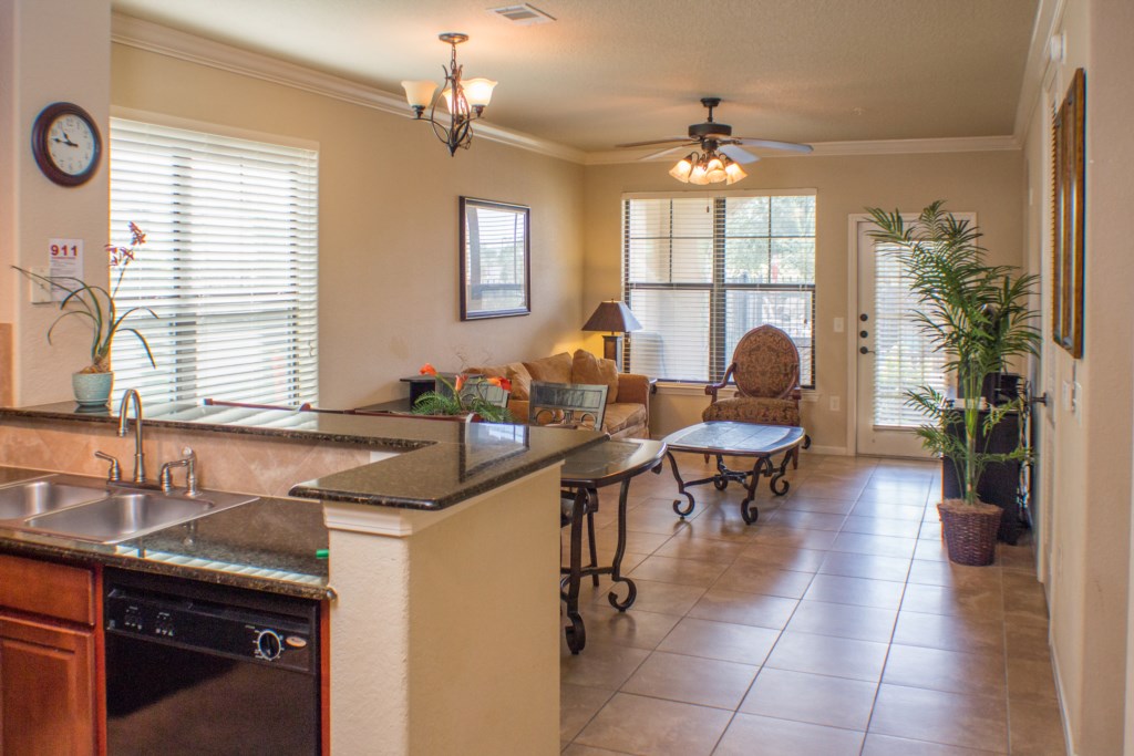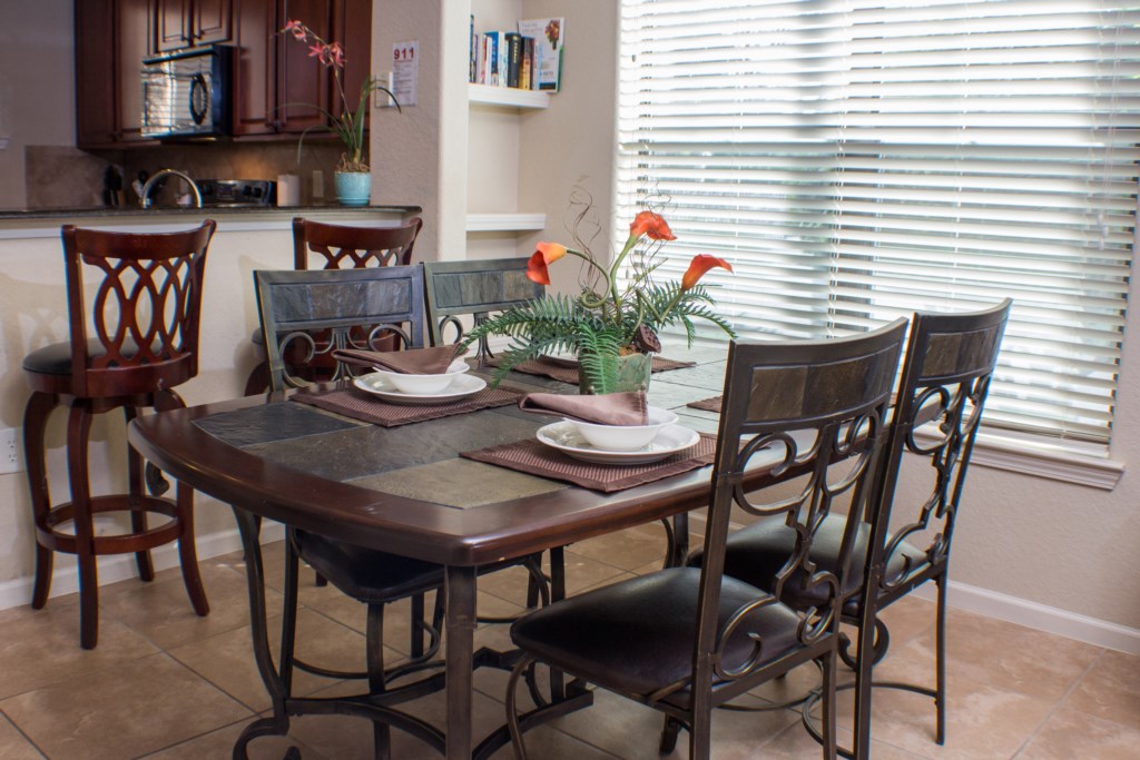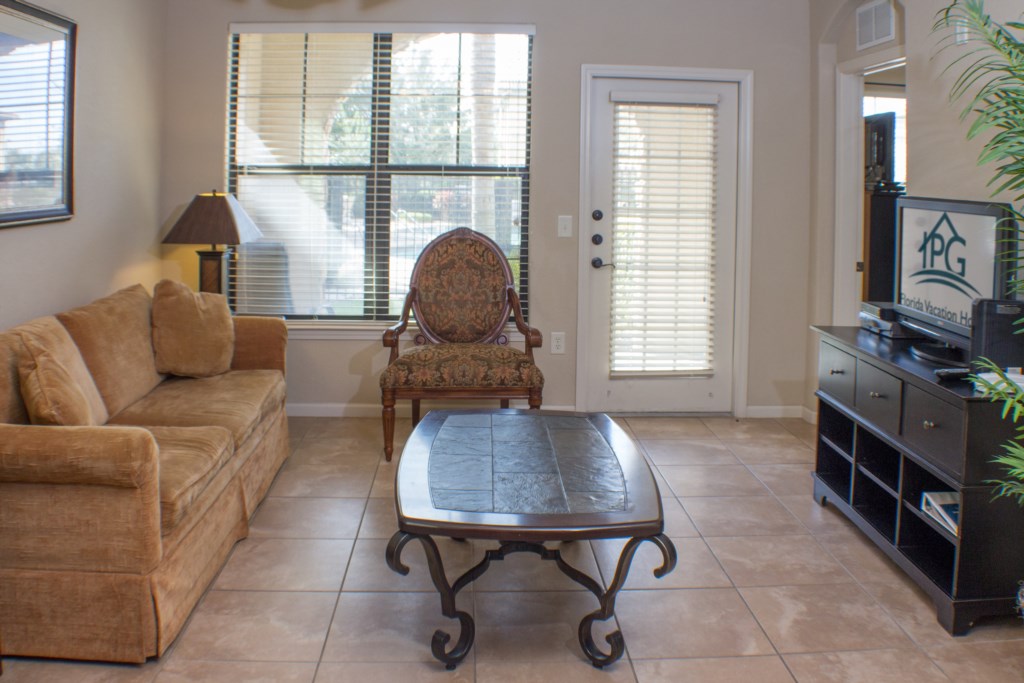 Its open plan living area with tiled floors gives the home a spacious and open feel. With large windows, this home gets a lot of natural sunlight, making it a pleasant stay for all. Its kitchen that’s decorated in wood with granite tops is fully-equipped and will serve all your cooking and self-catering needs. There’s a small breakfast bar area with 2 barstools, allowing you to grab a quick coffee or snack before you start your day of sightseeing in Florida. The connected formal dining area has a large wooden table that seats 4 guests. The rooms, decorated with palms and other pot plants, will make you feel like you’re in an exotic location.