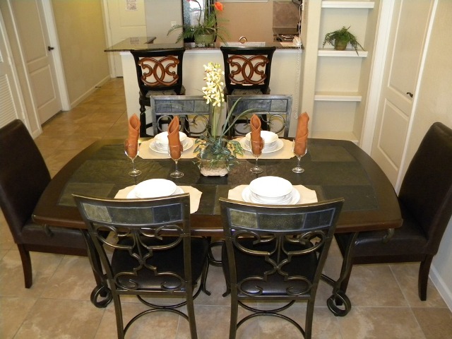 The newly refurbished kitchen is impressive with all of the latest kitchen technology and classic marble tops. With double sinks, a new oven, and an industrial sized fridge/freezer, you’ll feel right at home. The kitchen is well-lit and has spotlights hanging above it to ensure you can see well when preparing yourfood. Small pot plants add a little bit of color to the kitchen and give it a homely feel. If you feel like having a quick bite to eat or a coffee-on-the-go, you can opt to sit at the breakfast bar on one of the two cushioned stools provided. The formal dining room is classic and is directly attached to the kitchen for your convenience. The large wooden table with subtle carvings can seat 6 guests at a time.
