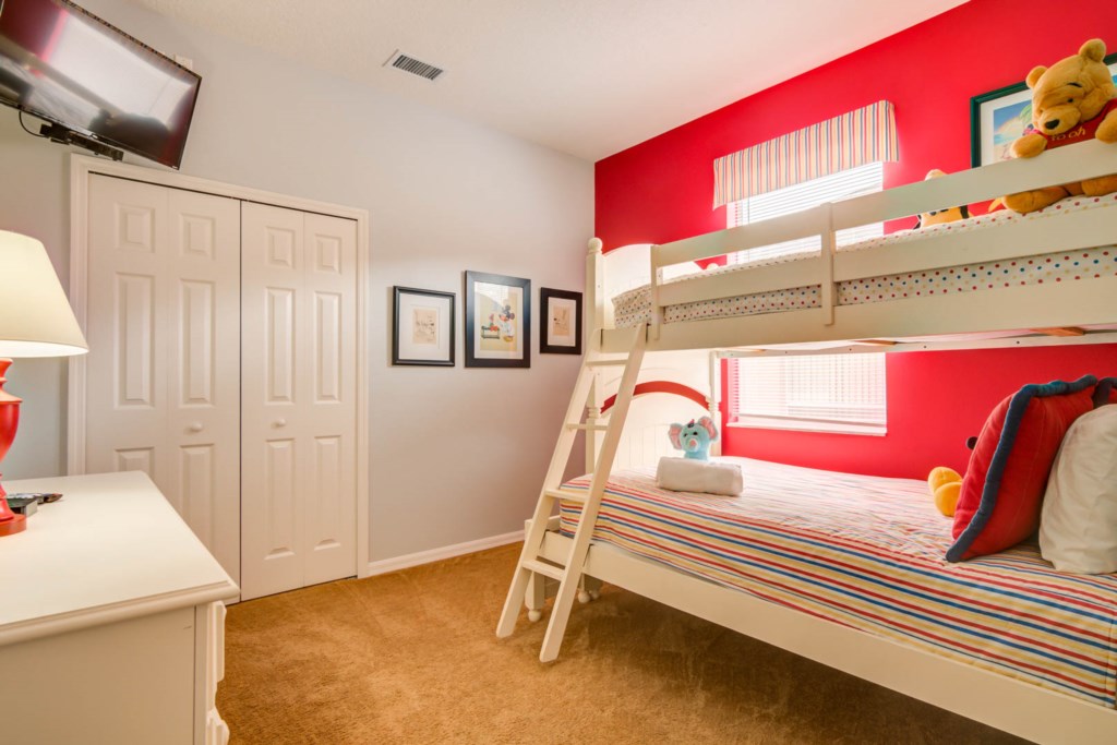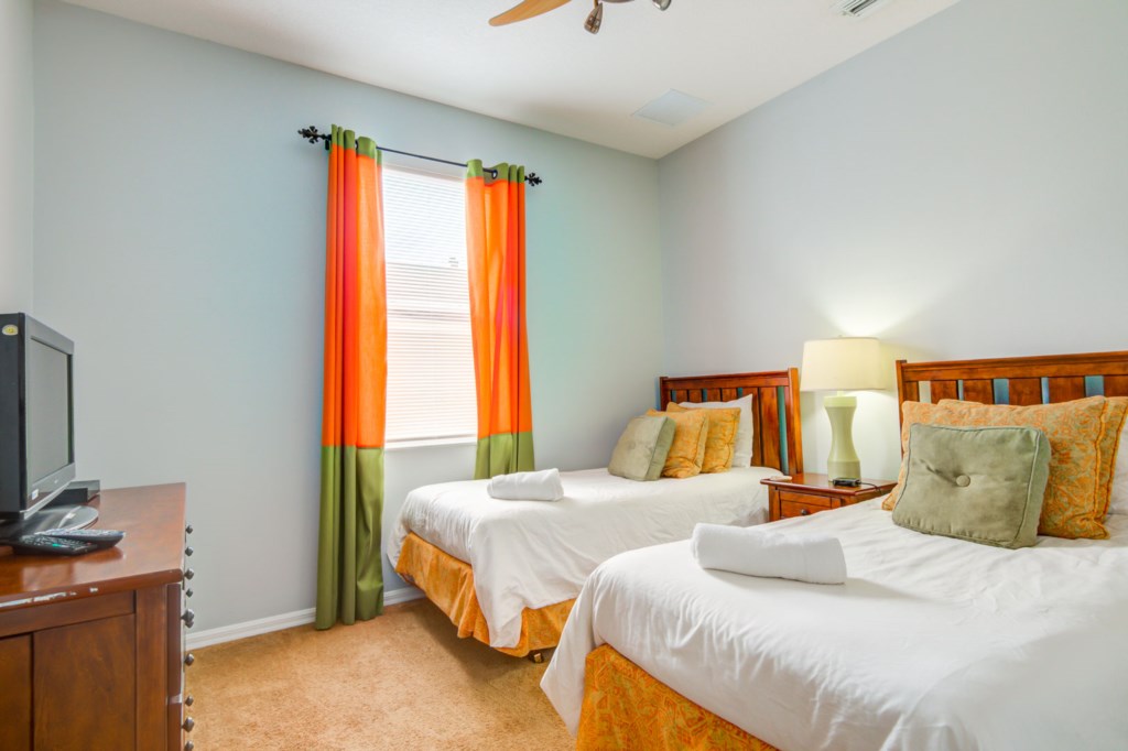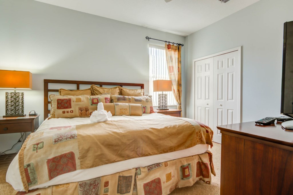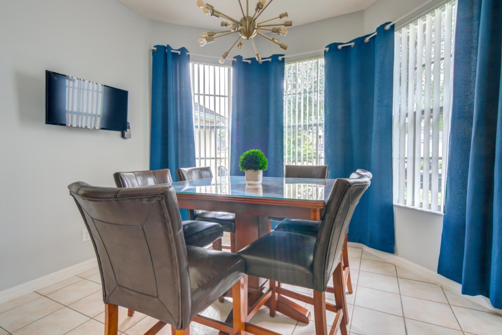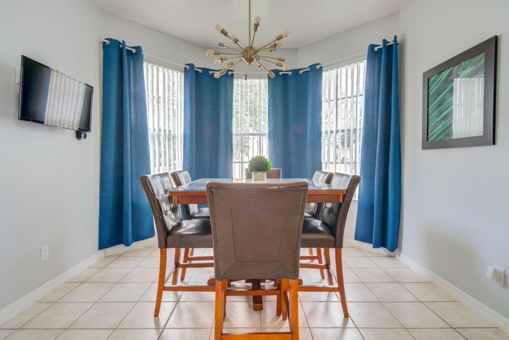 Let’s start at the kitchen. It’s large, has stainless steel appliances, and has granite countertops. It comes fully equipped with everything you’d need to whip up a home-cooked meal. The dining area is snazzy with its stylish table and 6 chairs, blue curtains, and flat screen TV for some entertainment during your meal. The living room is large and has vaulted ceilings. It has two large sofas, two blue armchairs, and a large flat screen TV mounted to the wall. There is also a patio door that lets light flood into the room and leads to the pool area. The living room is the perfect place to come back to after a long day out at the park. You’ll love relaxing in here.