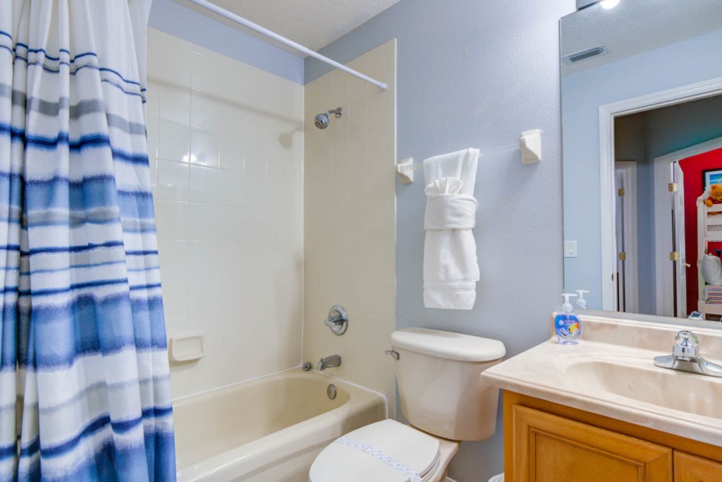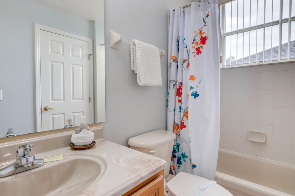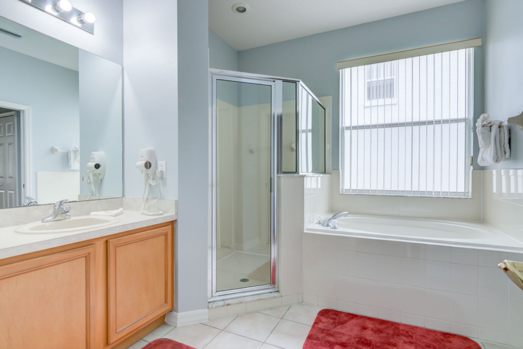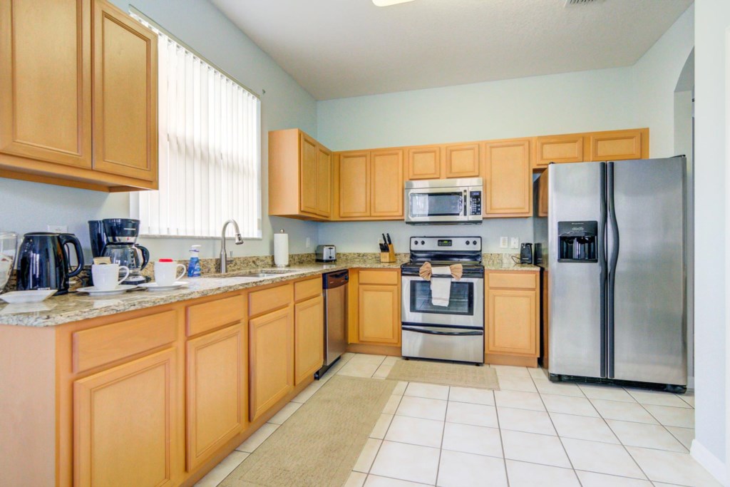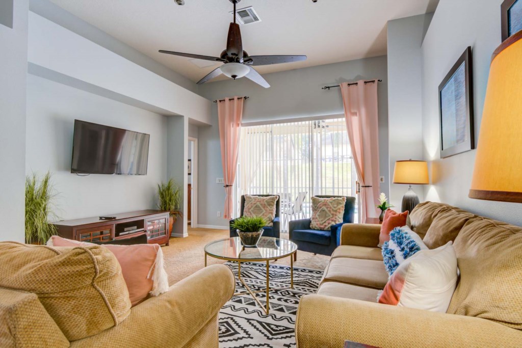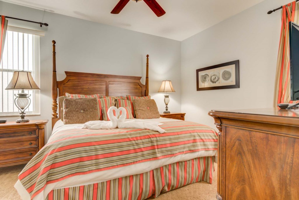 Let’s start at the kitchen. It’s large, has stainless steel appliances, and has granite countertops. It comes fully equipped with everything you’d need to whip up a home-cooked meal. The dining area is snazzy with its stylish table and 6 chairs, blue curtains, and flat screen TV for some entertainment during your meal. The living room is large and has vaulted ceilings. It has two large sofas, two blue armchairs, and a large flat screen TV mounted to the wall. There is also a patio door that lets light flood into the room and leads to the pool area. The living room is the perfect place to come back to after a long day out at the park. You’ll love relaxing in here.