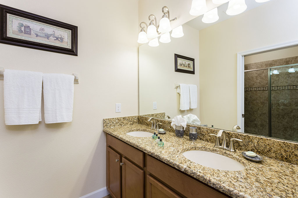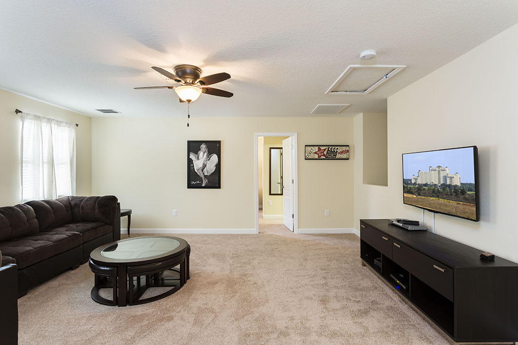 Upstairs the loft area has been furnished with a large sectional sofa, the perfect space for a family movie night, relaxation or entertainment with the large wall mounted TV, DVD and games console. Off this area is a queen size bedroom with ensuite bathroom, the second queen size bedroom, two bedrooms each having two twin beds and the family bathroom with twin vanities and a tub/shower combination. To the front of the home is the extremely spacious second king-size master suite, the bathroom having twin vanities, oval feature tub and walk in shower. All bedrooms have flat screen TV's and the home has WiFi