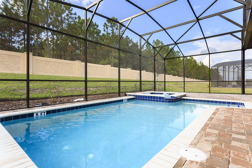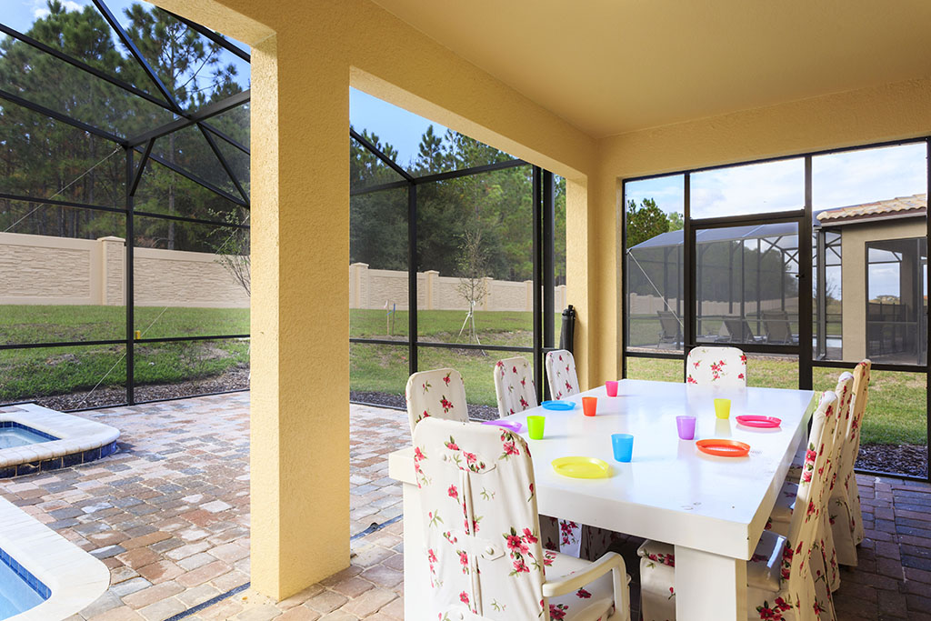 Outside the pool area is screened with a heated pool, covered dining area and ample lounging space. Outside the screen there is a privacy wall.