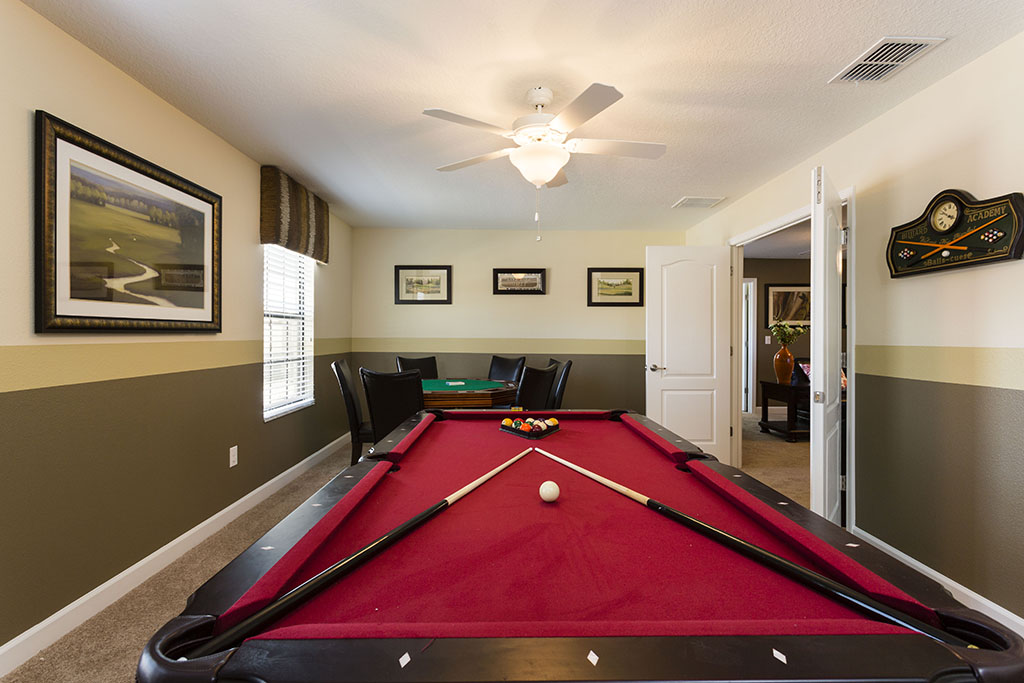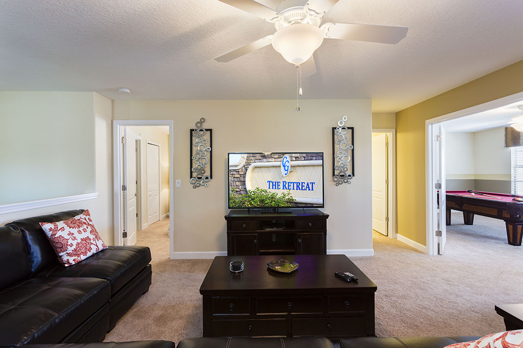 Upstairs is a loft area which provides a second seating space with a 60" TV perfect for enjoying sports events. The loft is surrounded by six more bedrooms, three king-size, two with two twin size beds and the sixth having two queen size beds, these bedrooms are served by three full bathrooms. There is a media room with a large wall mounted screen, pool table and card table providing a great space for both adults and families to enjoy.