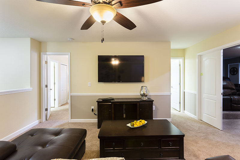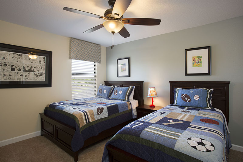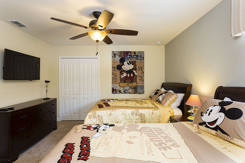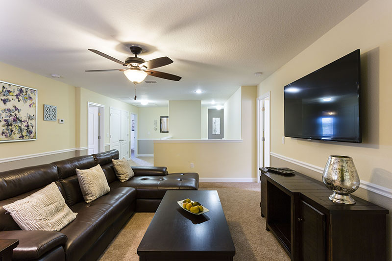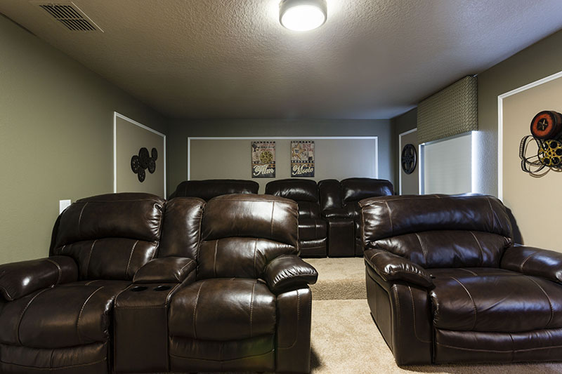 Upstairs is a loft area which provides a second seating space with a large flat screen TV. The loft is surrounded by six more bedrooms, The first bedroom having a full size and twin bed, the second 2 queen size beds and the third a king-size all served by the large family bathroom which has twin vanities and a walk in shower. The fourth and fifth bedrooms, one a king-size and the other with a full size and a twin have a jack and jill style bathroom with walk in shower and twin vanities. The sixth bedroom is a king-size and has access to a bathroom with a shower/tub combination. There is a movie room complete with over-sized leather seating on tiered levels and a huge wall mounted screen and blu-ray.