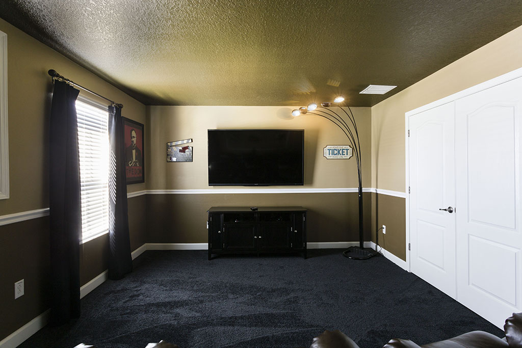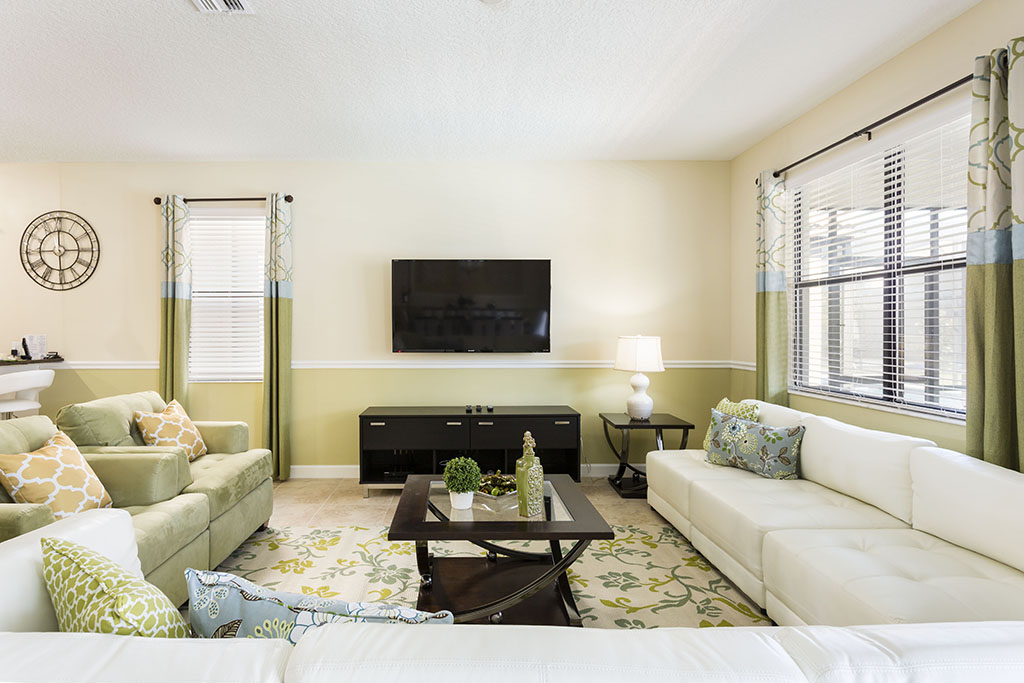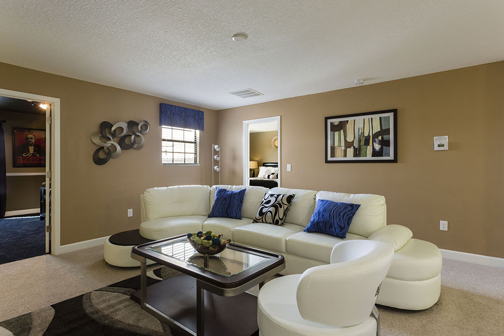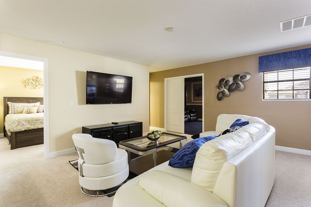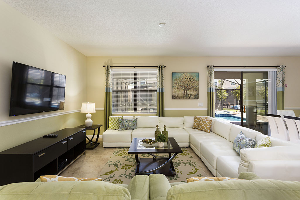 Towards the rear of the home, with views out onto the pool through the glazed sliding doors, your family can sit back, relax, watch TV or dine in style while they enjoy their favorite TV shows and snacks as you plan the rest of your vacation!