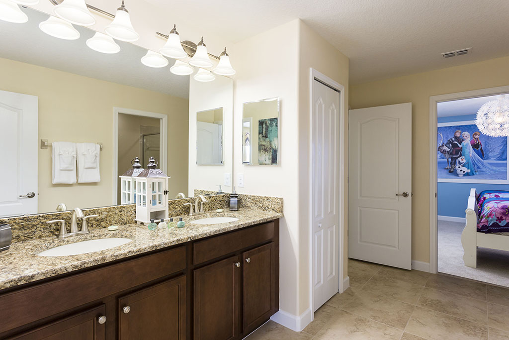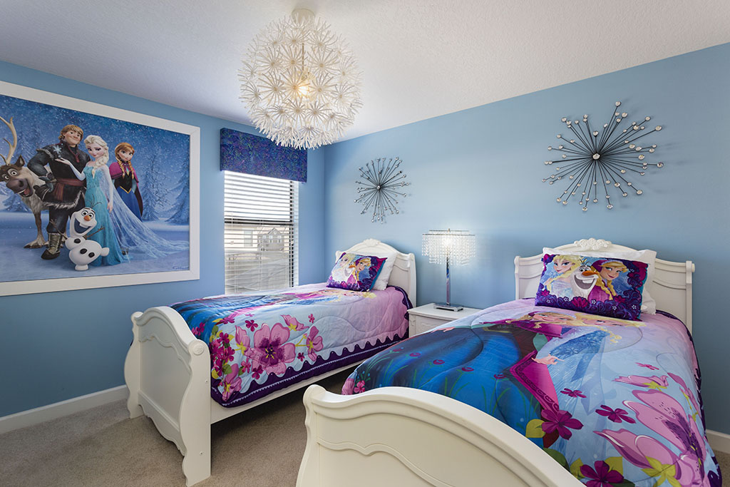 A Frozen themed room includes two twin sized beds and shares a Jack & Jill style bathroom with a king sized room.