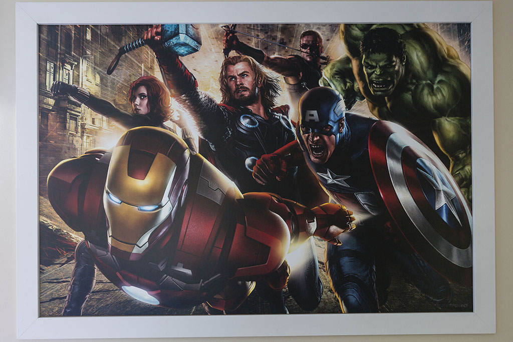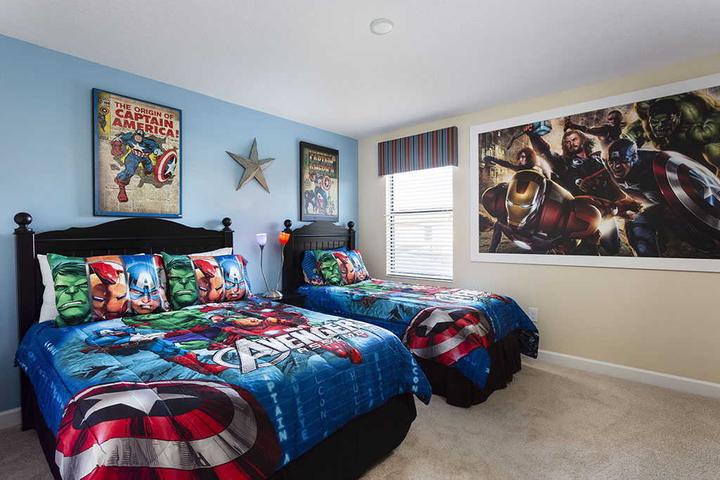 A Marvel themed bedroom includes a full sized bed and a twin sized bed and shares a Jack and Jill style en suite with a king sized room.