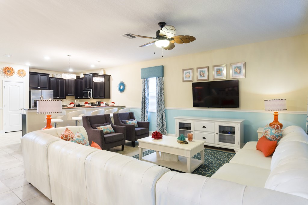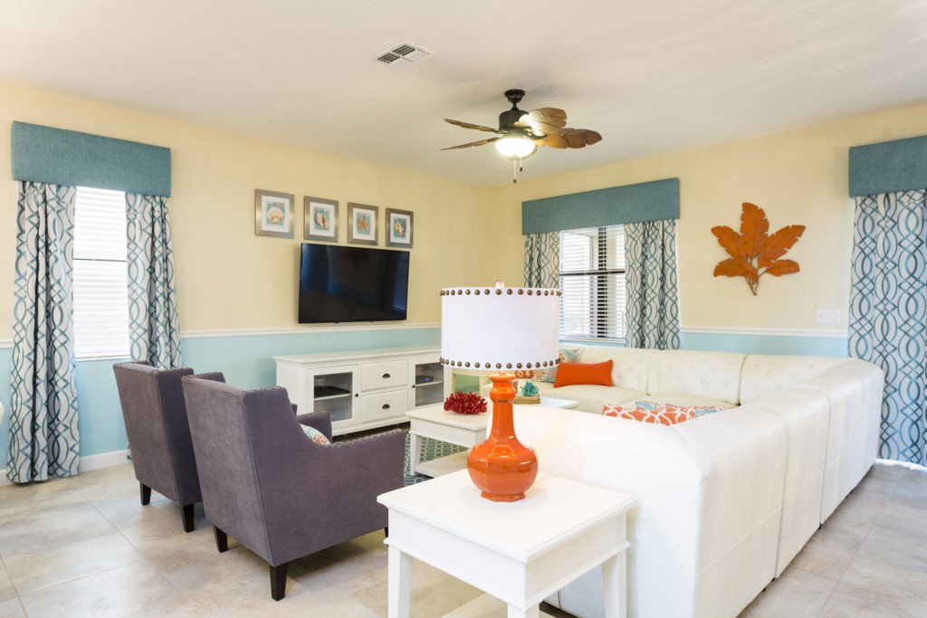 A comfortable family living area is located to the ground floor and includes sectional sofa, and two accent chairs overlooking the wall mounted TV.