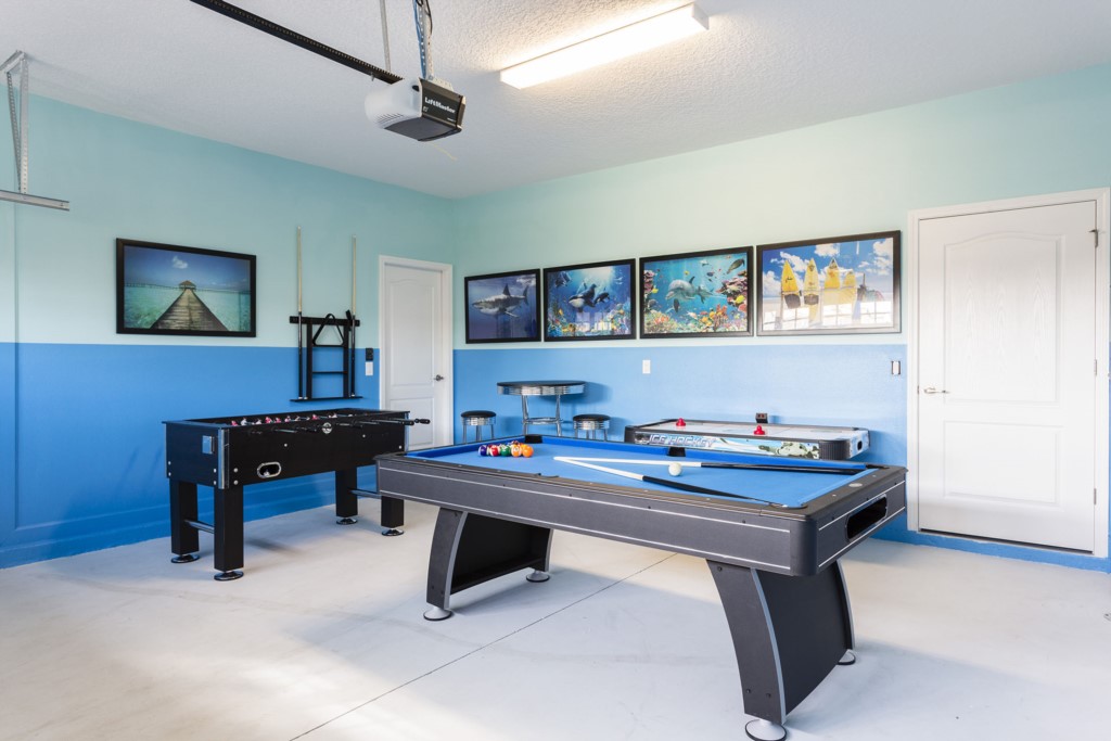 A games room with pool table foosball and air hockey.