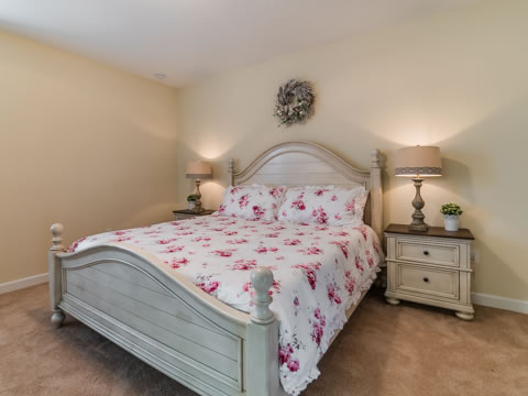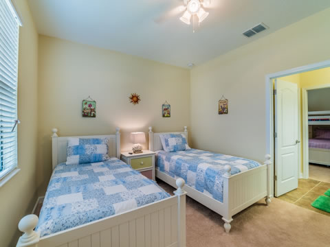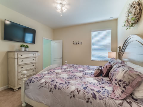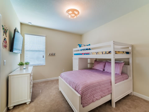 The bedroom configurations are one king bedroom, one queen bedroom, one bedroom with 2 twin beds and then one bedroom with bunkbeds (twin over full). Each bedroom is also outfitted with a flat screen TV so you can catch up on the latest TV shows on your vacation.
