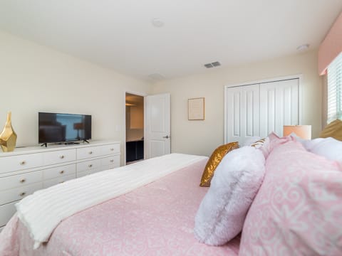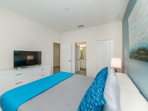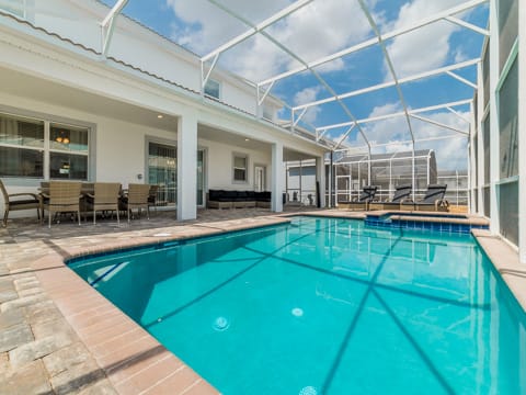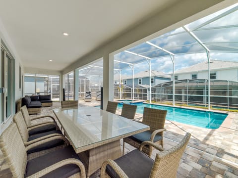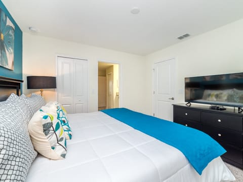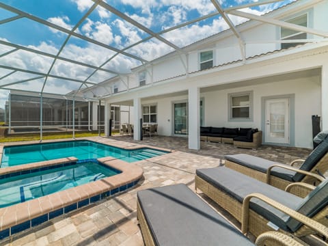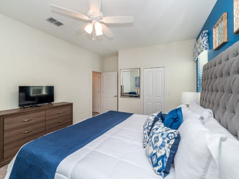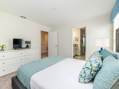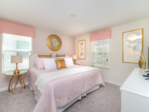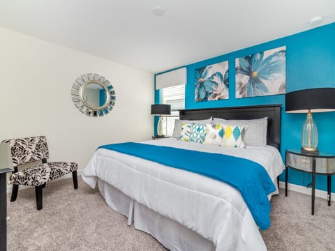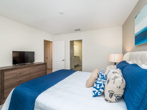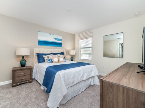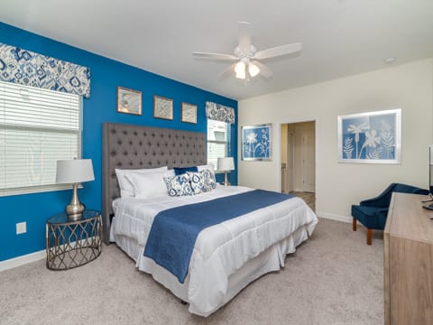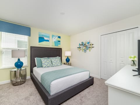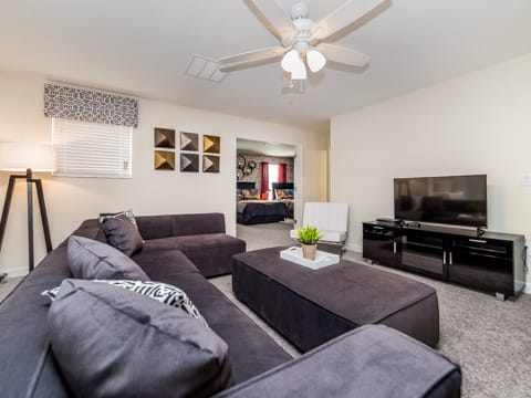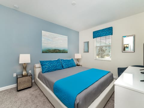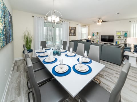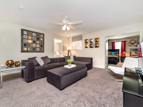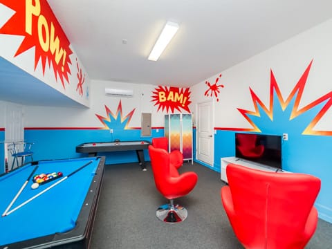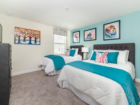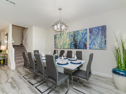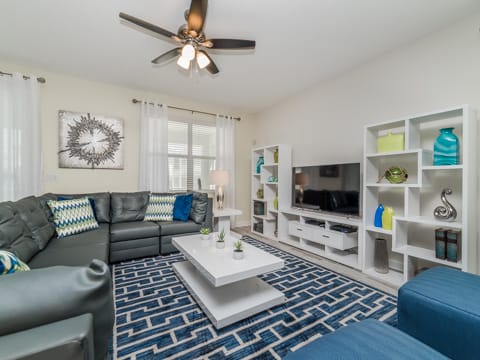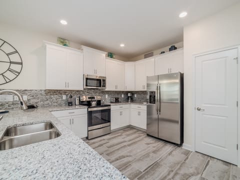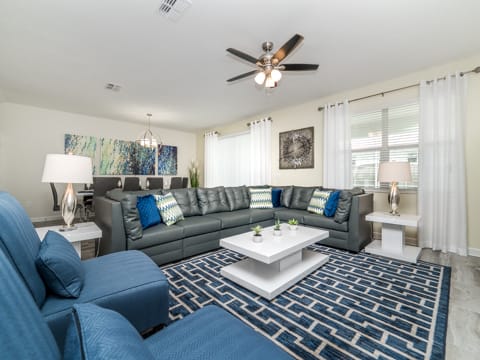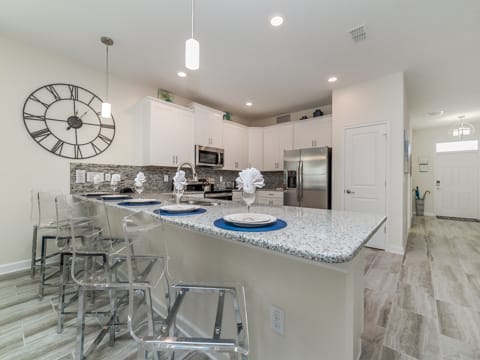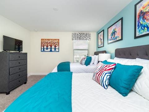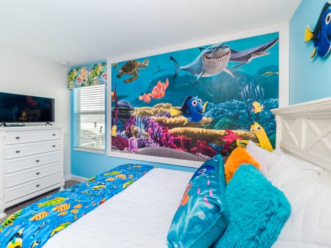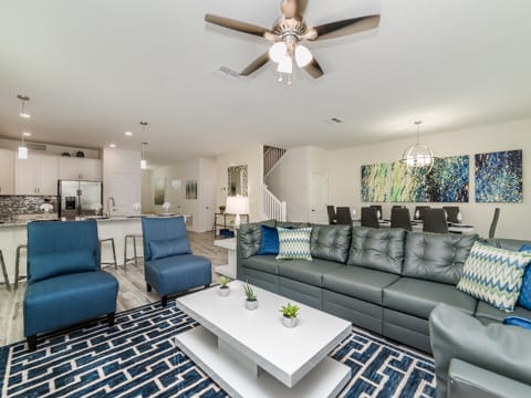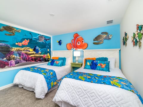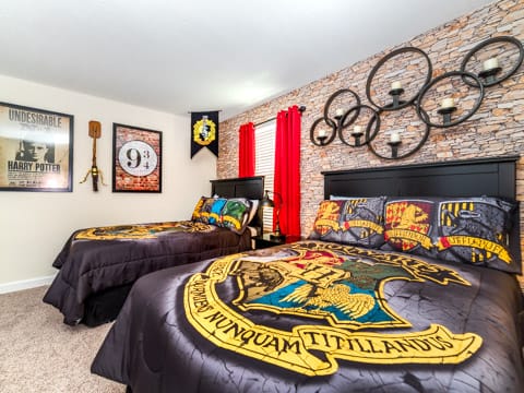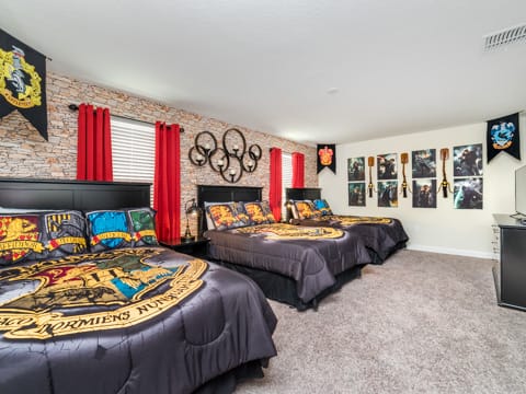 On your next vacation to sunny Florida, you have to stay at this gorgeous home located in the resort community of Champions Gate. This home screams luxury from the moment you walk in. From the white exterior, stone walls and blue accents, to the gorgeous living space on the interior, this home is sure to please. This Grand Collection home, meaning it is expertly decorated and professionally furnished, is the way to go when visiting central Florida. The large living room downstairs, boasting a wraparound couch and 55” flat screen TV is the perfect place to gather after a long day at the parks. With this open concept home, the kitchen overlooks everything. With upgraded appliances, granite countertops and white wood cabinetry, this modern designed kitchen is incredible. The breakfast bar and dining room are not far away and the perfect place to gather for meals. Whip up some snacks or a huge feast in this stylish and functional kitchen. With 9 bedrooms and 5 bathrooms, there is no shortage of space in this home. Sleeping up to 25, everyone will have their own slice of heaven to call home. With 4 king bedrooms, 2 queen bedrooms and a bedroom with 2 doubles, everyone can have their own bed. There is also a room with 3 doubles and a room with a double and a twin. Sleeping 25 is no problem here! The Harry Potter themed room, decked out with the perfect bedding and wall decor will be the perfect place for your wizard in training. For the little ones (and the little ones at heart) the Finding Nemo room is also very popular. The upstairs living room, with a 43” TV, is also a great place to catch up on your favorite TV shows. Head back downstairs to the amazing game room! With billiards, air hockey and the ever important A/C, this will be the perfect place to spend your nights. Do not forget to head out back for some outdoor time! The pool and spa, padded sun chairs and outdoor dining set are the best spots to enjoy your day in the sun. This home also comes with a washer and dryer as well as free WiFi for you to use. Do not forget about Champions Gate’s huge clubhouse! With a gym, restaurant and more, everything is right there for you! Book today and vacation away!