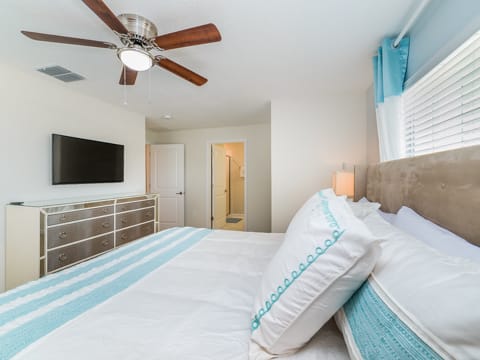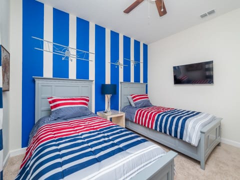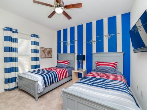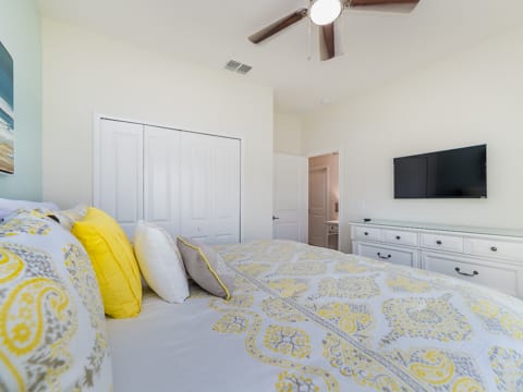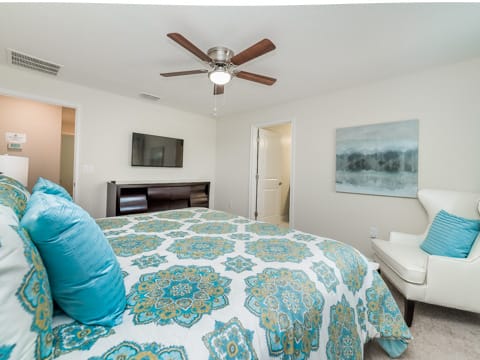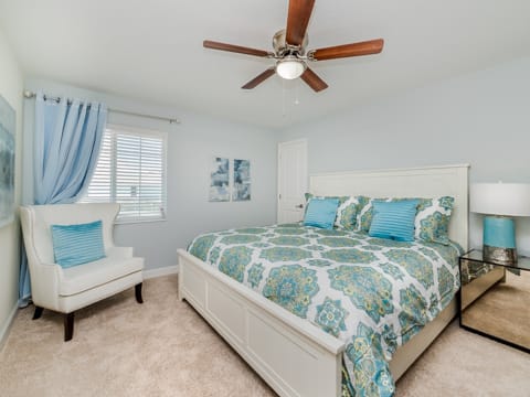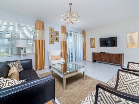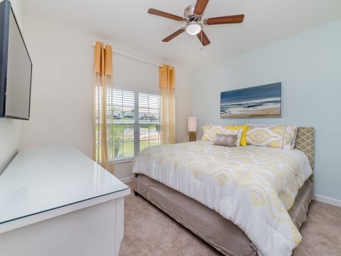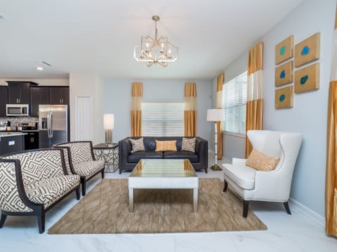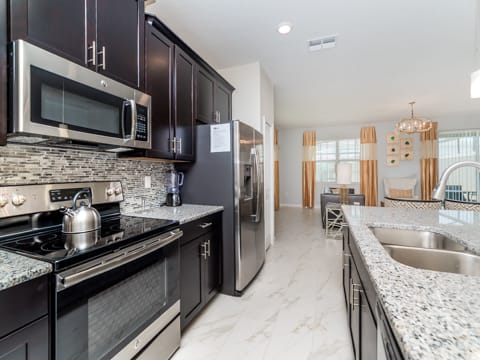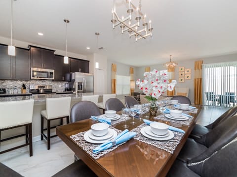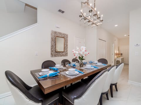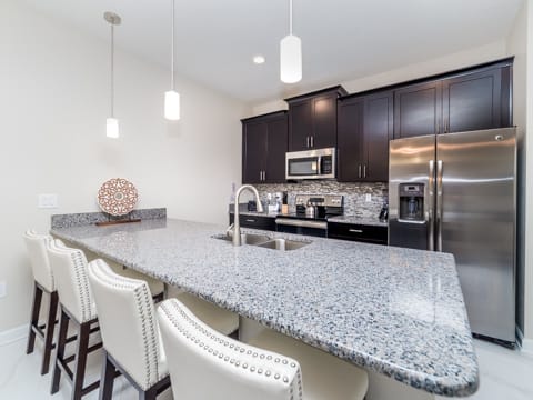 You can be on your way to staying in this gorgeous townhome located in the resort community of Champions Gate. This home's bright and airy design makes it feel large and spacious. The living room surrounds a 48-inch flat screen while overlooking the pool deck. With cozy furnishings, you can relax all day here. Overlooking the living room is the upgraded kitchen. Dark wood cabinetry, granite countertops, stainless steel appliances and a breakfast bar are all features. Cooking up meals are a breeze in this chef’s kitchen. Enjoy all of your home cooked meals at the 8-person dining table located near both the living room and kitchen. This home has 5 bedrooms and 4 bathrooms. With 3 bedrooms having king beds and 2 bedrooms having 2 twin beds, this rental sleeps up to 10 guests. The flat screen TV’s in all bedrooms allow you to catch up on your favorite TV shows and relax. Do not forget about the washer and dryer for you to use at your convenience. The free WIFI is also a major bonus. This home also has its very own splash pool. An outdoor dining set and pool chairs finish off this home making it the perfect vacation getaway.