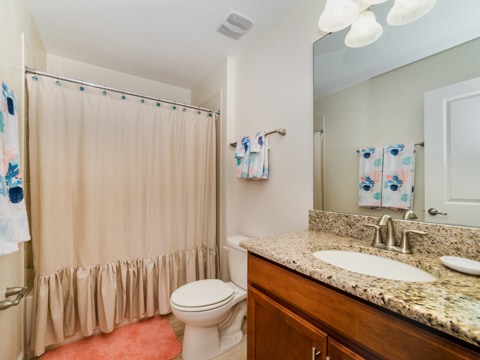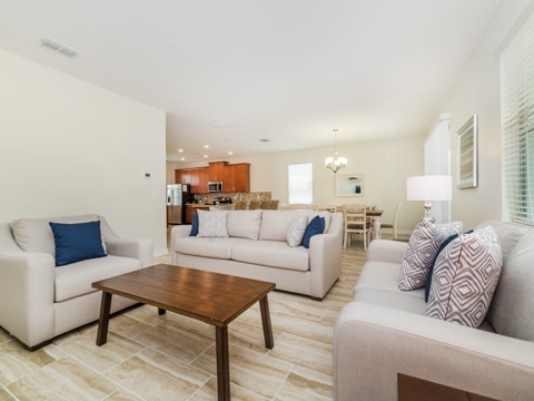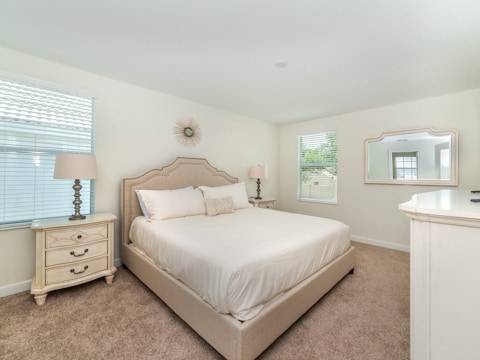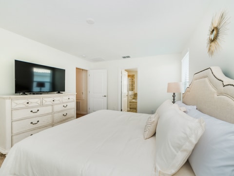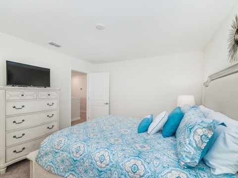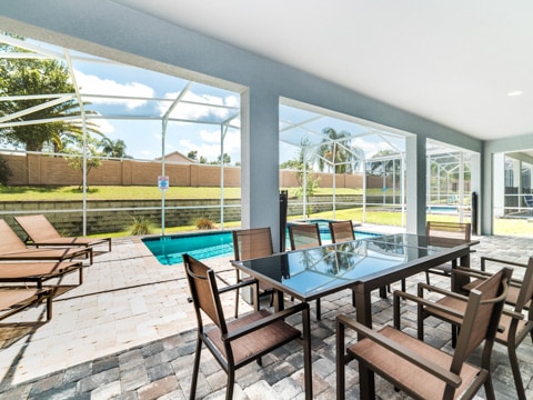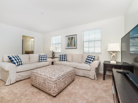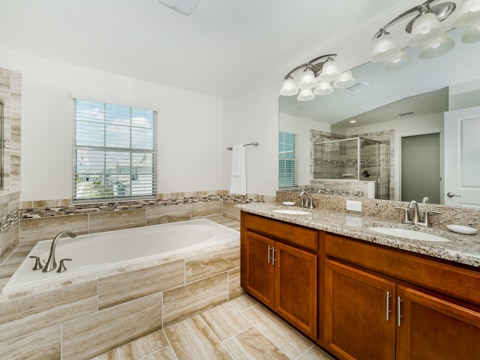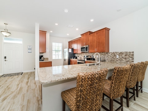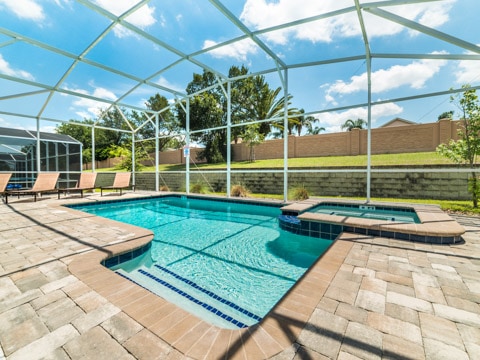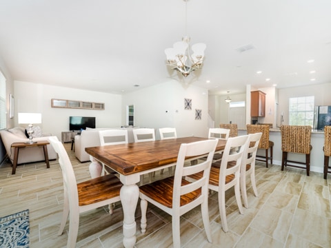 Welcome to ChampionsGate Resort and this 5 bedroom, 4.5 bathroom vacation home. Not only is ChampionsGate popular for its beautiful vacation homes but the clubhouse is spectacular. For those water enthusiasts, enjoy the huge gradual entry pool, water slides, lazy river and kids splash park. If cardio activity is more to your liking, how about some tennis, golf, volleyball or working-out in the fitness center. And, last but not least, the movie theater and games room are fabulous. Accommodations in this home sleeps 10 comfortably with 2 king bedrooms, 1 queen bedroom and 2 twin bedrooms - each having their own TV. If you are looking to dine in, spacious seating allows dining for 12 easily with 4 bar stools at the kitchen bar and 8 chairs at the dining room table. The fine furnishings in this home feature both a 55-inch TV in the lower and upper level living rooms. Your very own pool and spa is available to enjoy to your hearts content. The pool faces south for all-day sun exposure. And, there is plenty of seating poolside for dining along with loungers for relaxing in the sun. Call us today for your next trip to the Orlando area. Your perfect accommodations are waiting just for you