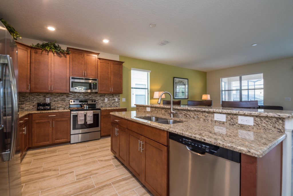 There is a table and chairs for poolside dining, along with plenty of seating at the formal dining room and kitchen bar. Speaking of kitchen, this area features upgraded tile and cabinetry along with stainless steel appliances and granite counter tops. For your convenience, there is FREE wifi along with a washer and Dryer