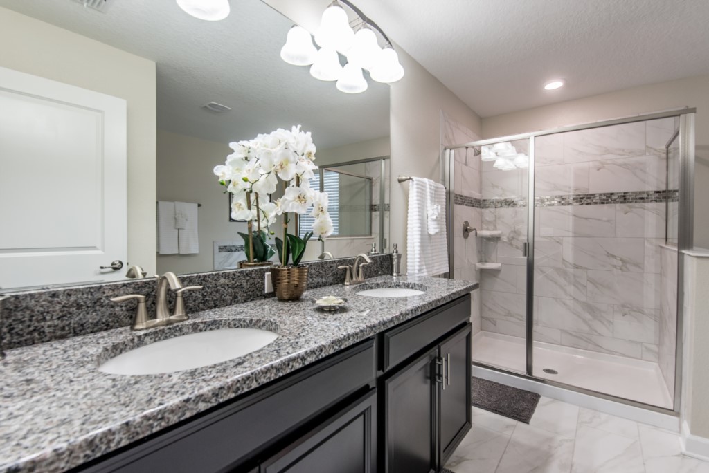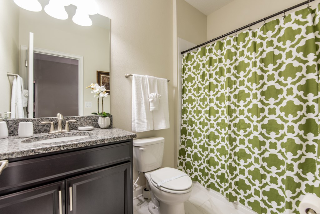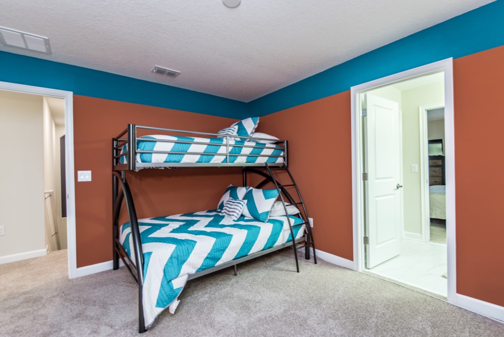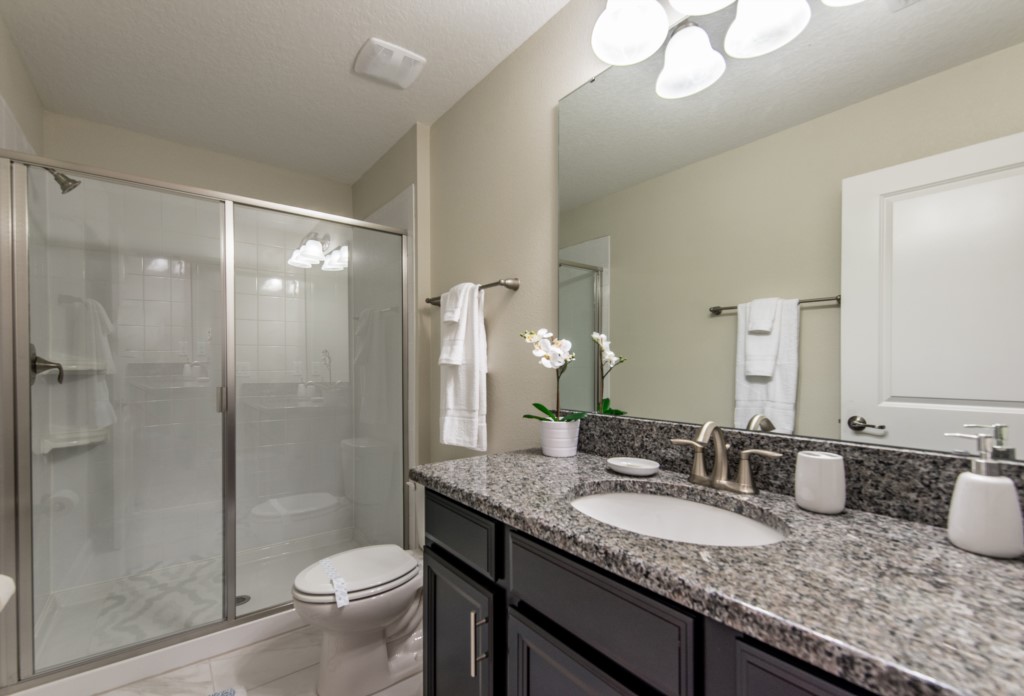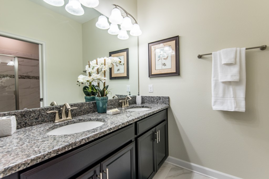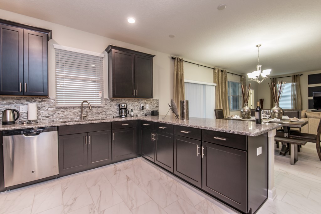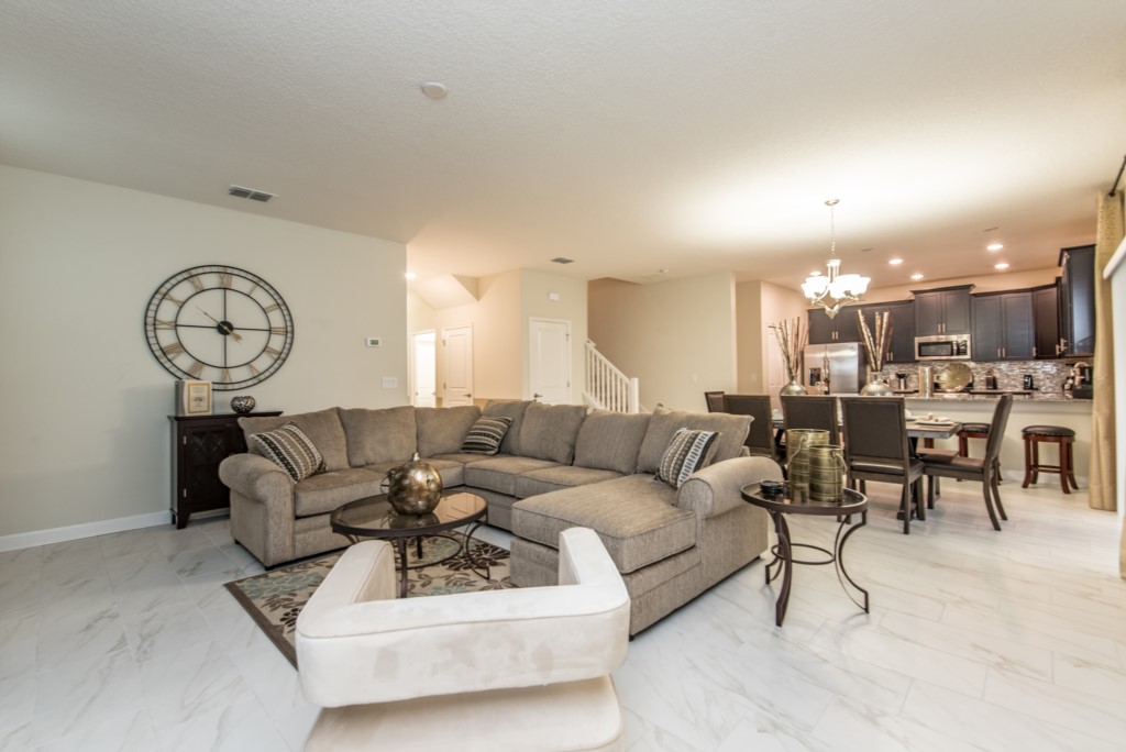 This home boasts over 3,000+ sq ft for you and your family to relax and unwind from long days at the park. This home has a large open floor plan easy for entertaining large families, and groups. The living area features plenty of seating around the large LCD TV, and adjacent is the dining area with seating for 8, and the kitchen, which is fully equipped, and fitted with granite countertops and stainless steel appliances.