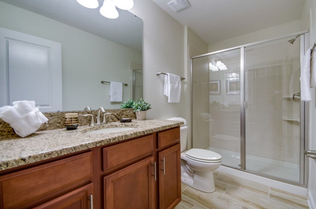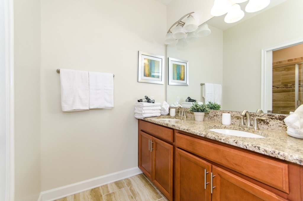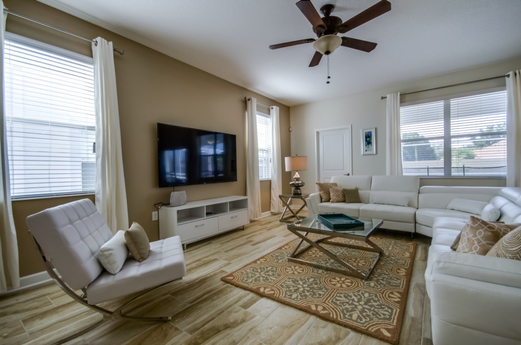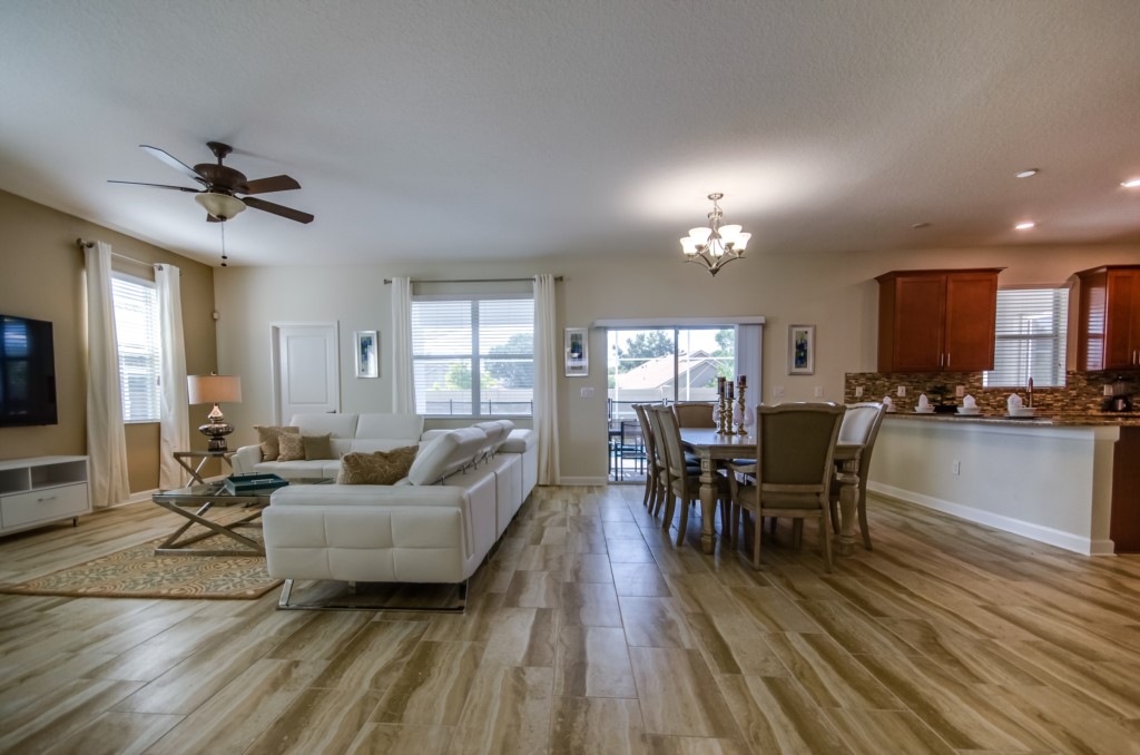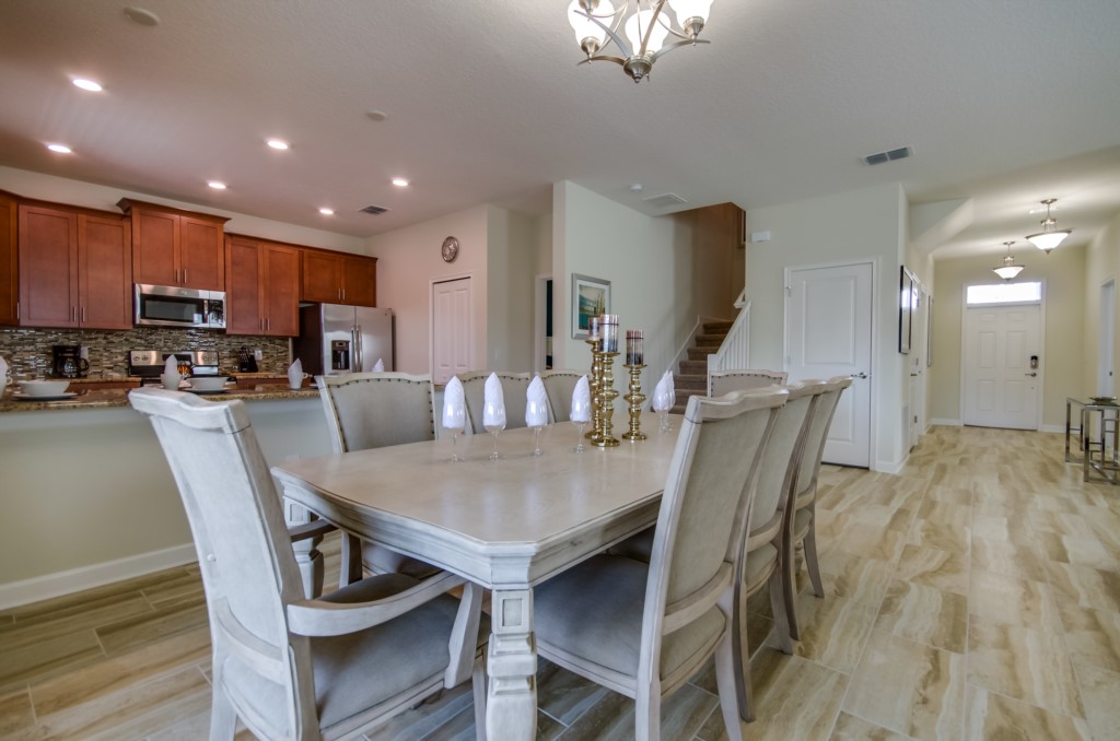 This home boasts over 3,000+ sq ft for you and your family to relax and unwind from long days at the park. This home has a large open floor plan easy for entertaining large families, and groups. The living area features plenty of seating around the large LCD TV, and adjacent is the dining area with seating for 8, and the kitchen, which is fully equipped, and fitted with granite countertops and stainless steel appliances.