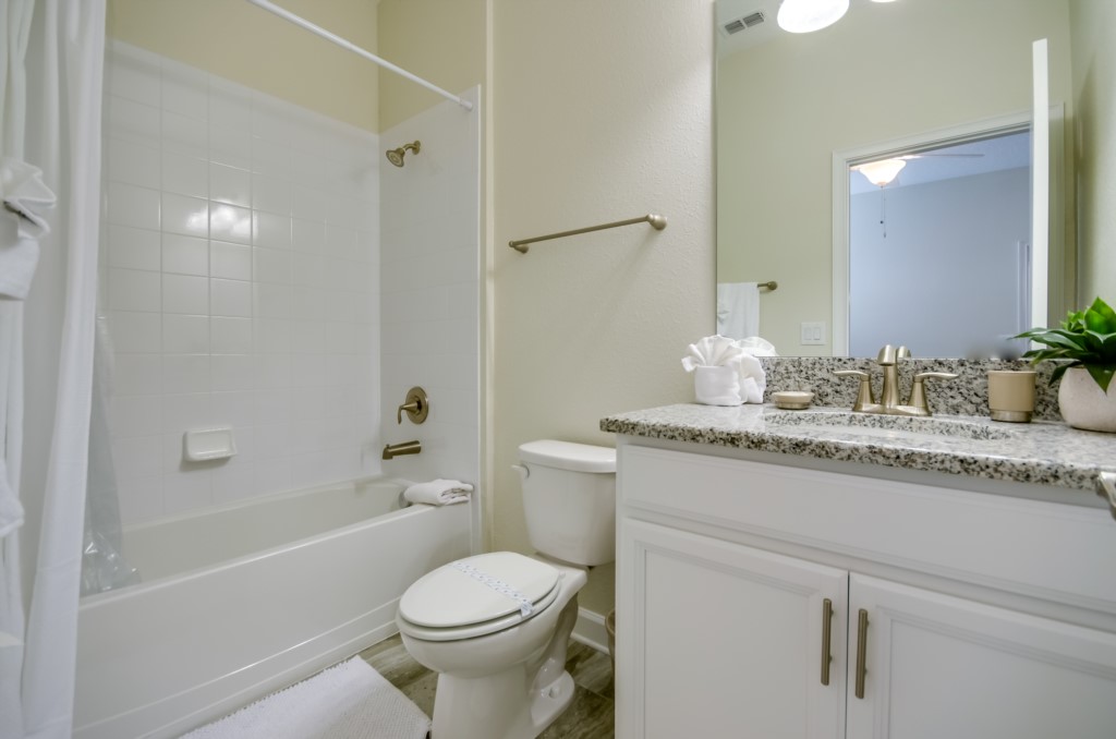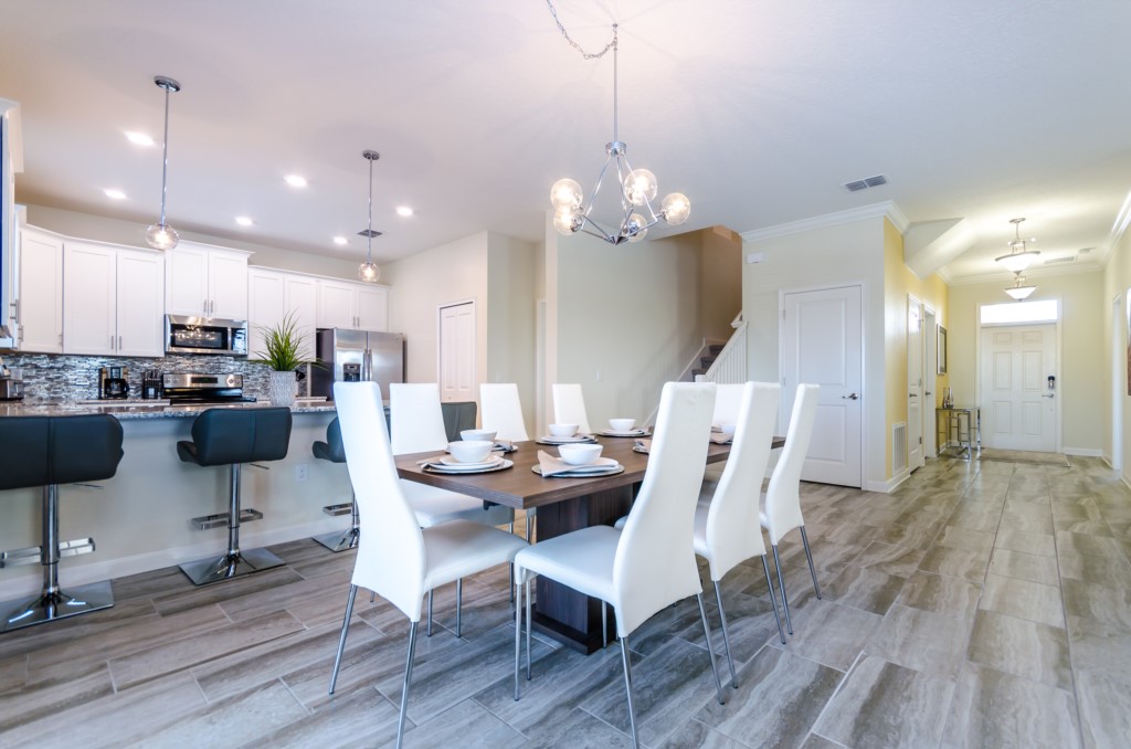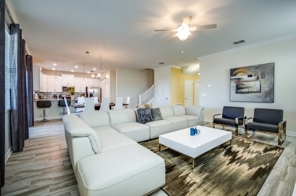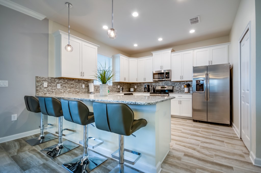 This home boasts over 3,000+ sq ft for you and your family to relax and unwind from long days at the park. This home has a large open floor plan easy for entertaining large families, and groups. The living area features plenty of seating around the large LCD TV, and adjacent is the dining area with seating for 8, and the kitchen, which is fully equipped, and fitted with granite countertops and stainless steel appliances.