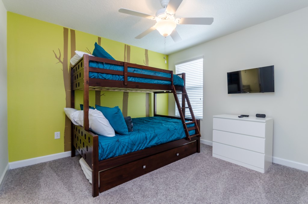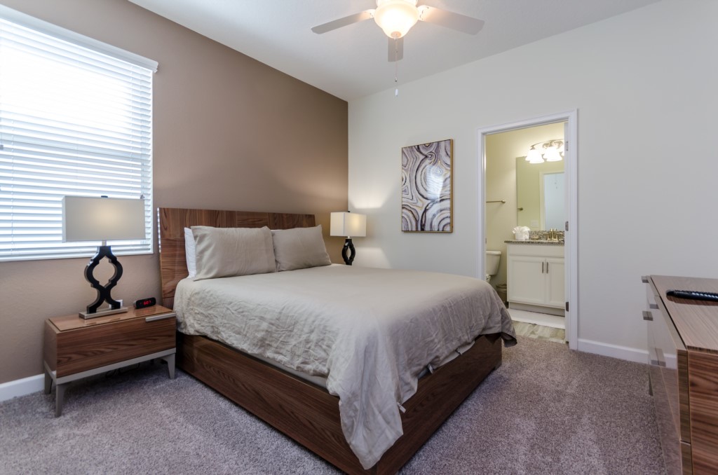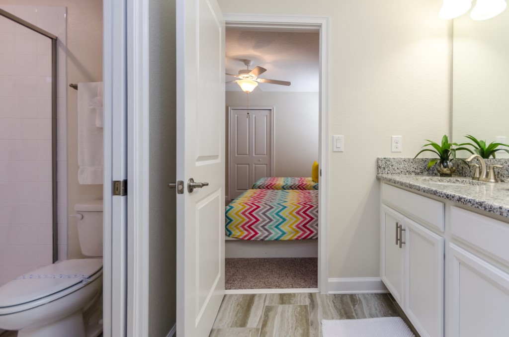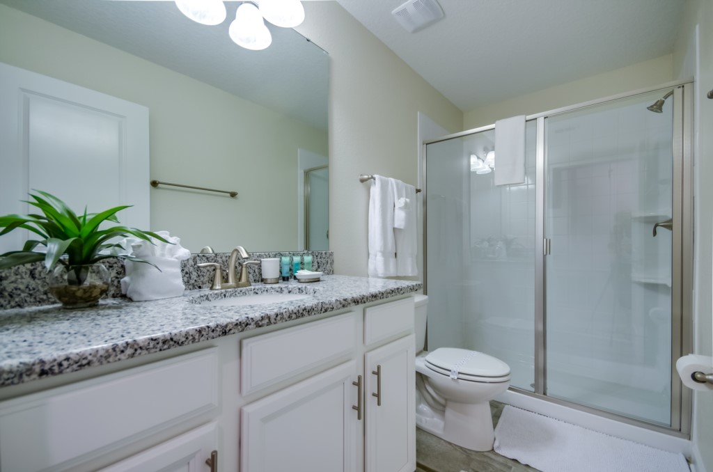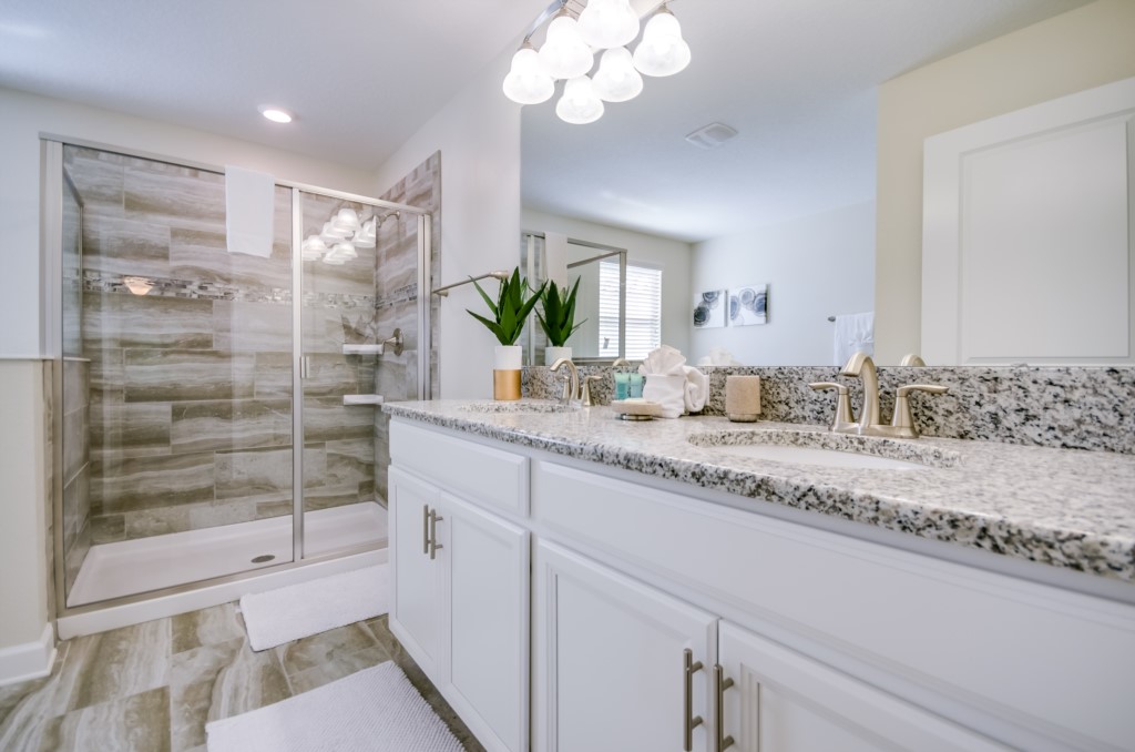 This home boasts over 3,000+ sq ft for you and your family to relax and unwind from long days at the park. This home has a large open floor plan easy for entertaining large families, and groups. The living area features plenty of seating around the large LCD TV, and adjacent is the dining area with seating for 8, and the kitchen, which is fully equipped, and fitted with granite countertops and stainless steel appliances.