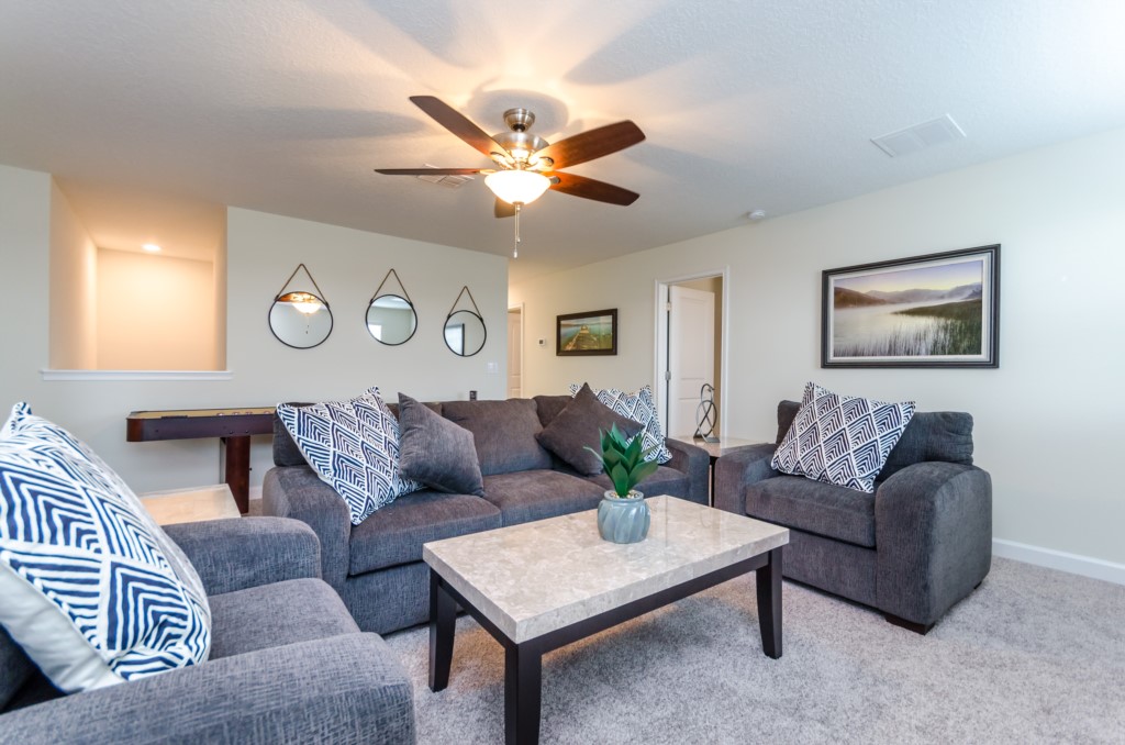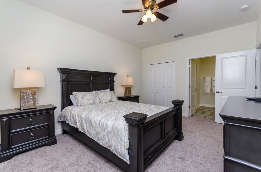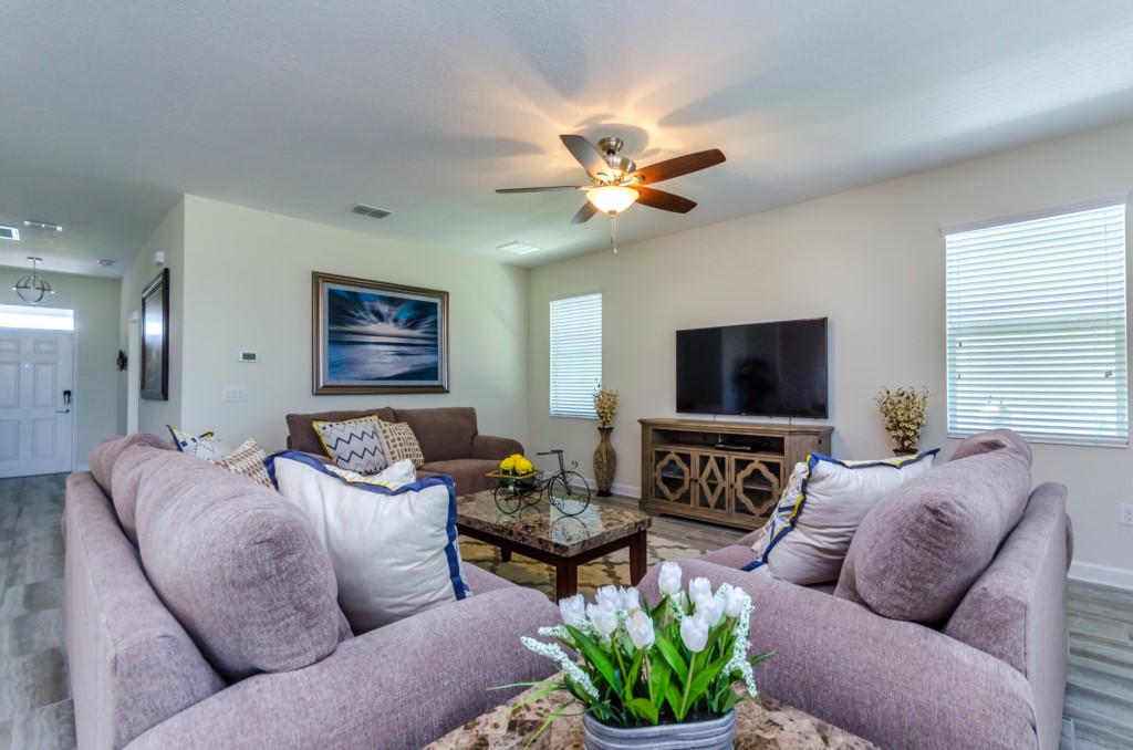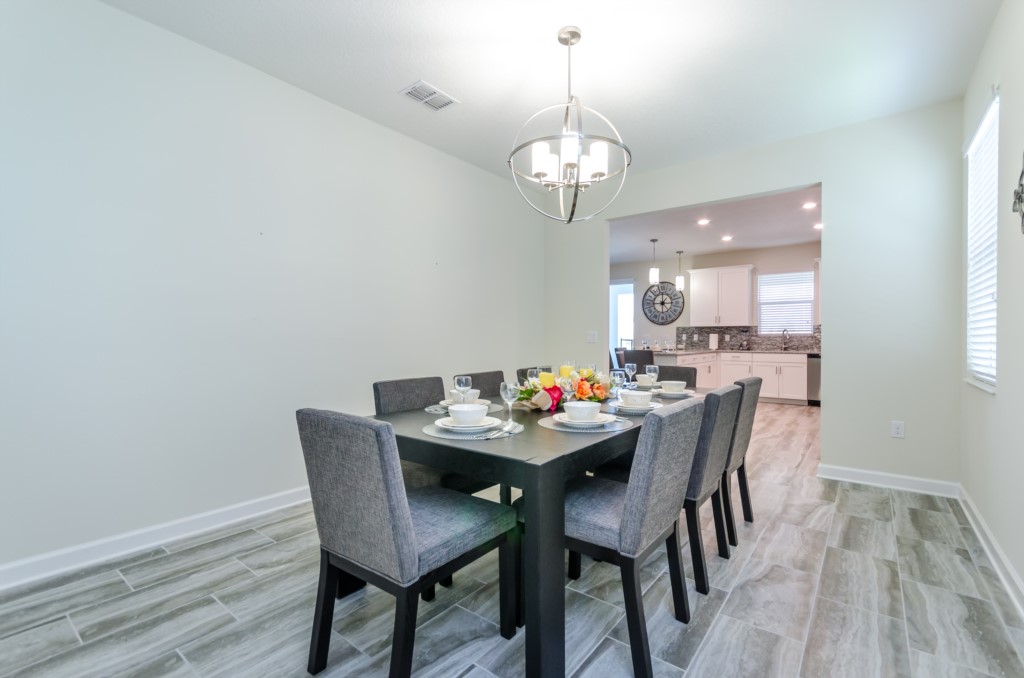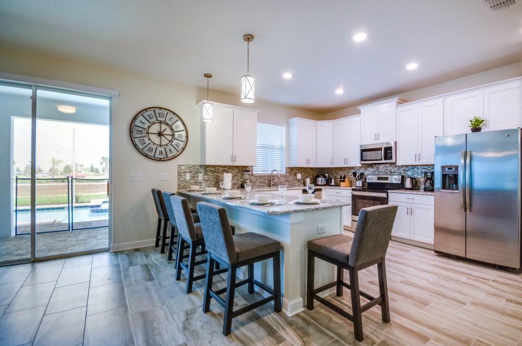 This home boasts over 3,000+ sq ft for you and your family to relax and unwind from long days at the park. This home has a large open floor plan easy for entertaining large families, and groups. The living area features plenty of seating around the large LCD TV, and adjacent is the dining area with seating for 8, and the kitchen, which is fully equipped, and fitted with granite countertops and stainless steel appliances.