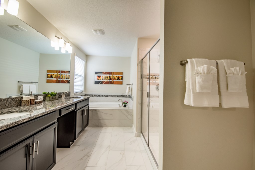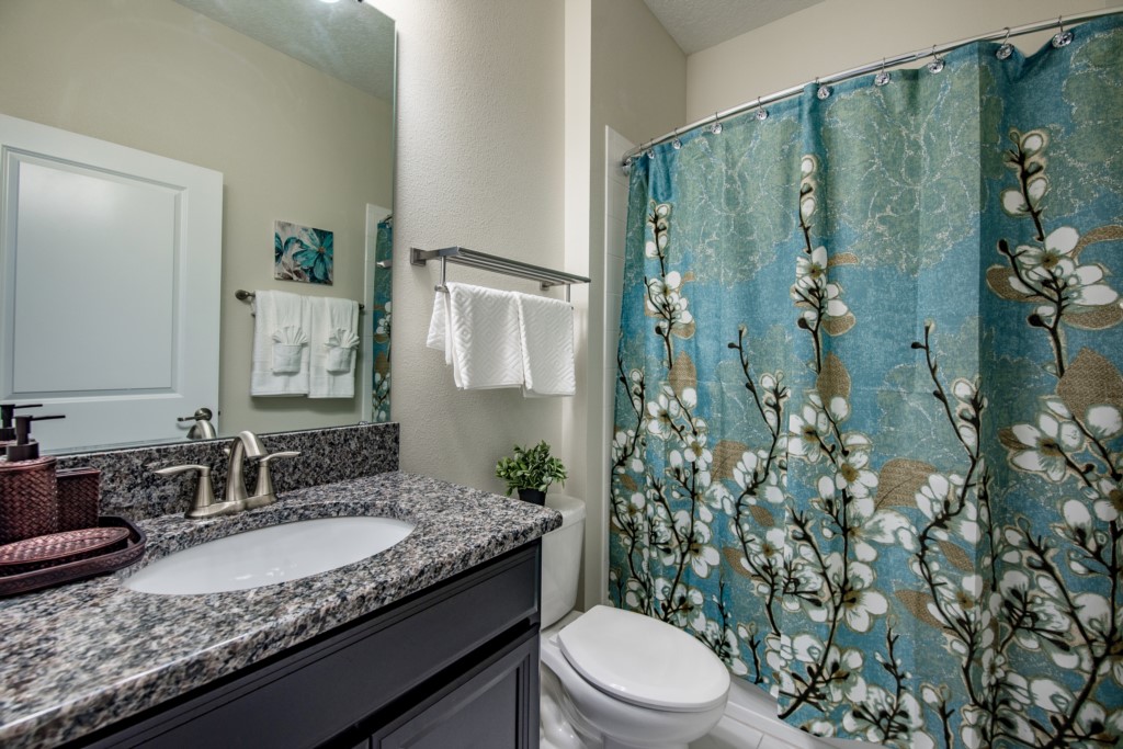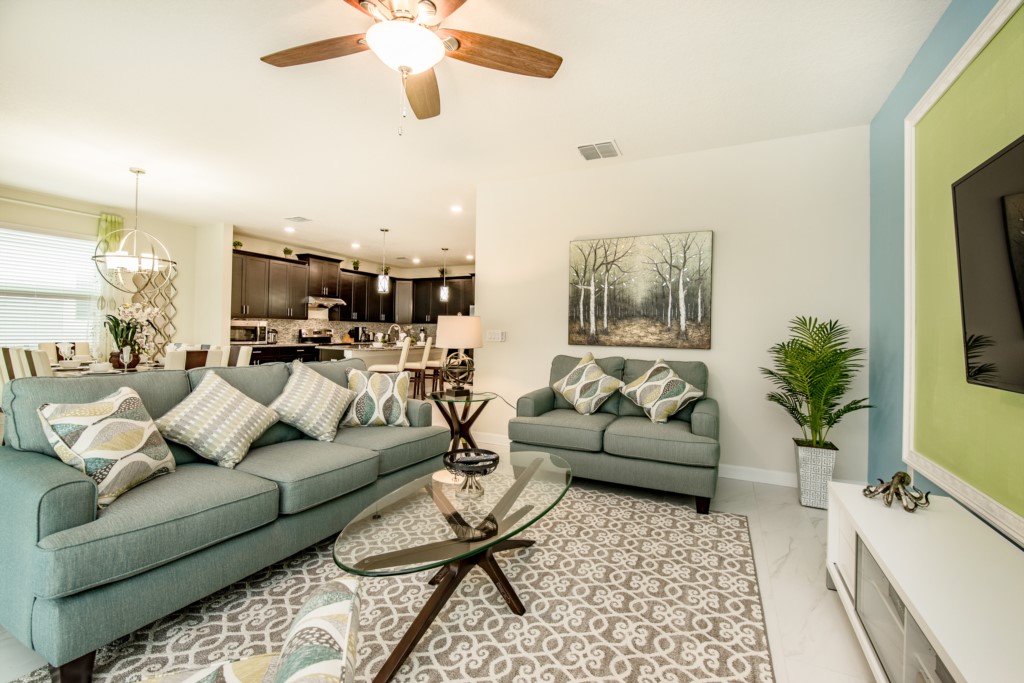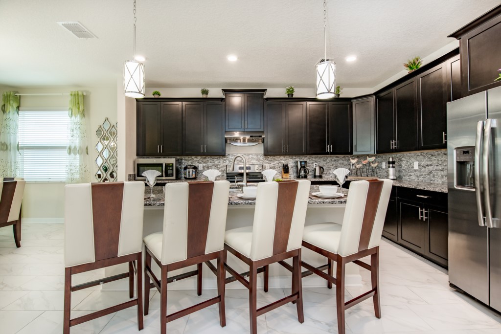 This home boasts over 3,000+ sq ft for you and your family to relax and unwind from long days at the park. This home has a large open floor plan easy for entertaining large families, and groups. The living area features plenty of seating around the large LCD TV, and adjacent is the dining area with seating for 8, and the kitchen, which is fully equipped, and fitted with granite countertops and stainless steel appliances.