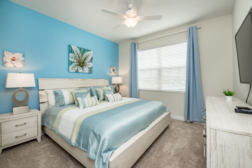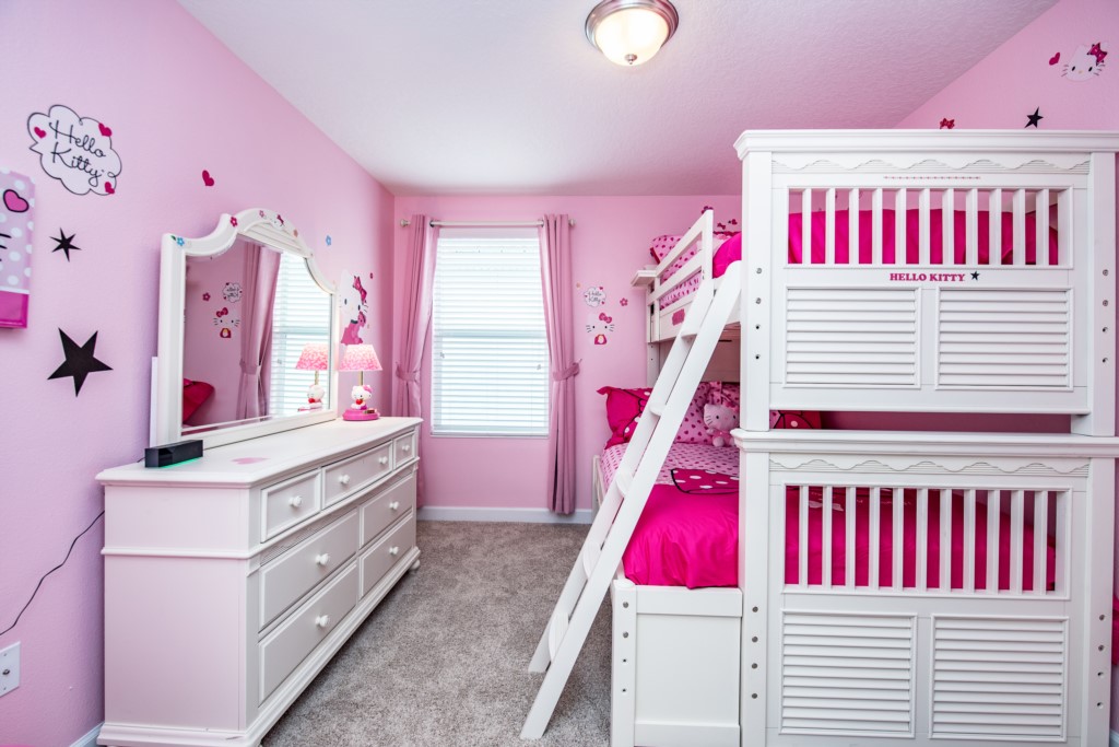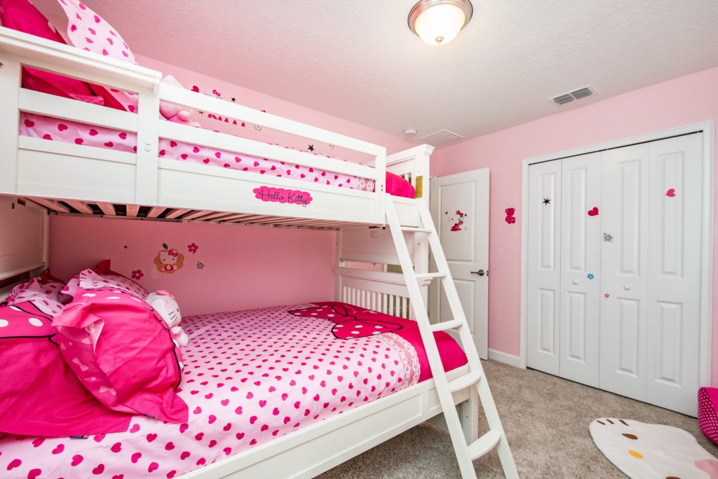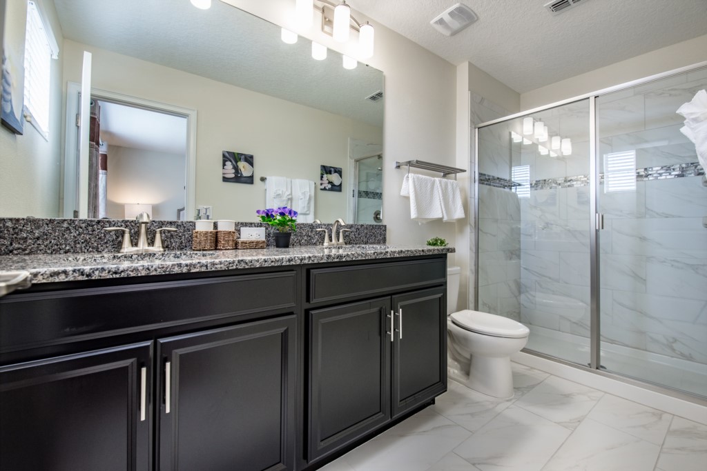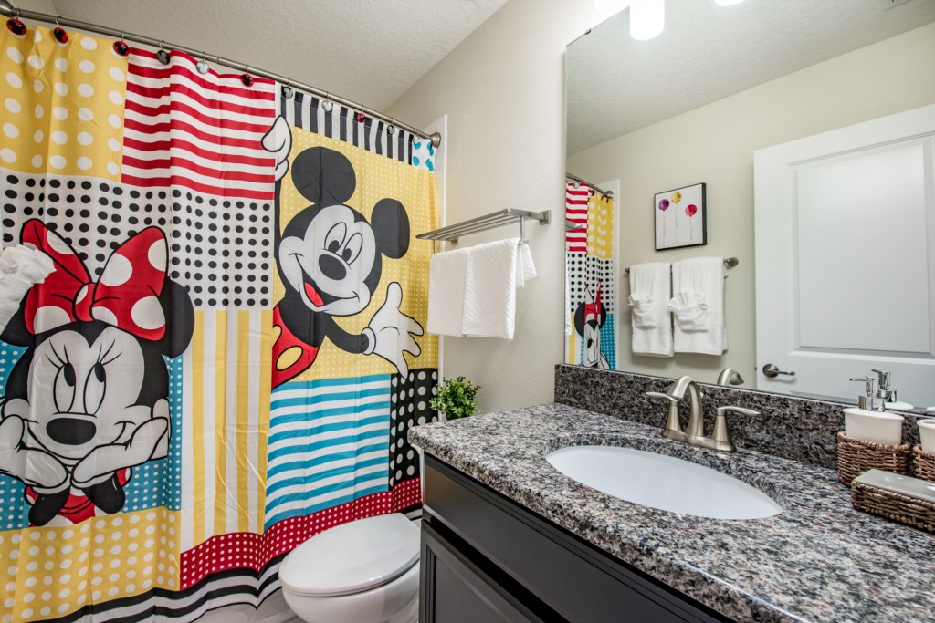 This home boasts over 3,000+ sq ft for you and your family to relax and unwind from long days at the park. This home has a large open floor plan easy for entertaining large families, and groups. The living area features plenty of seating around the large LCD TV, and adjacent is the dining area with seating for 8, and the kitchen, which is fully equipped, and fitted with granite countertops and stainless steel appliances.