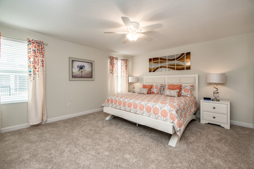 The property has One King master bedrooms located on the first floor plus another Queen Bedroom . Both have en suite baths with walk in showers . There is a King size bedroom located on the second floor for added . Three other rooms complete the second floor with twin size beds plus another Queen suite