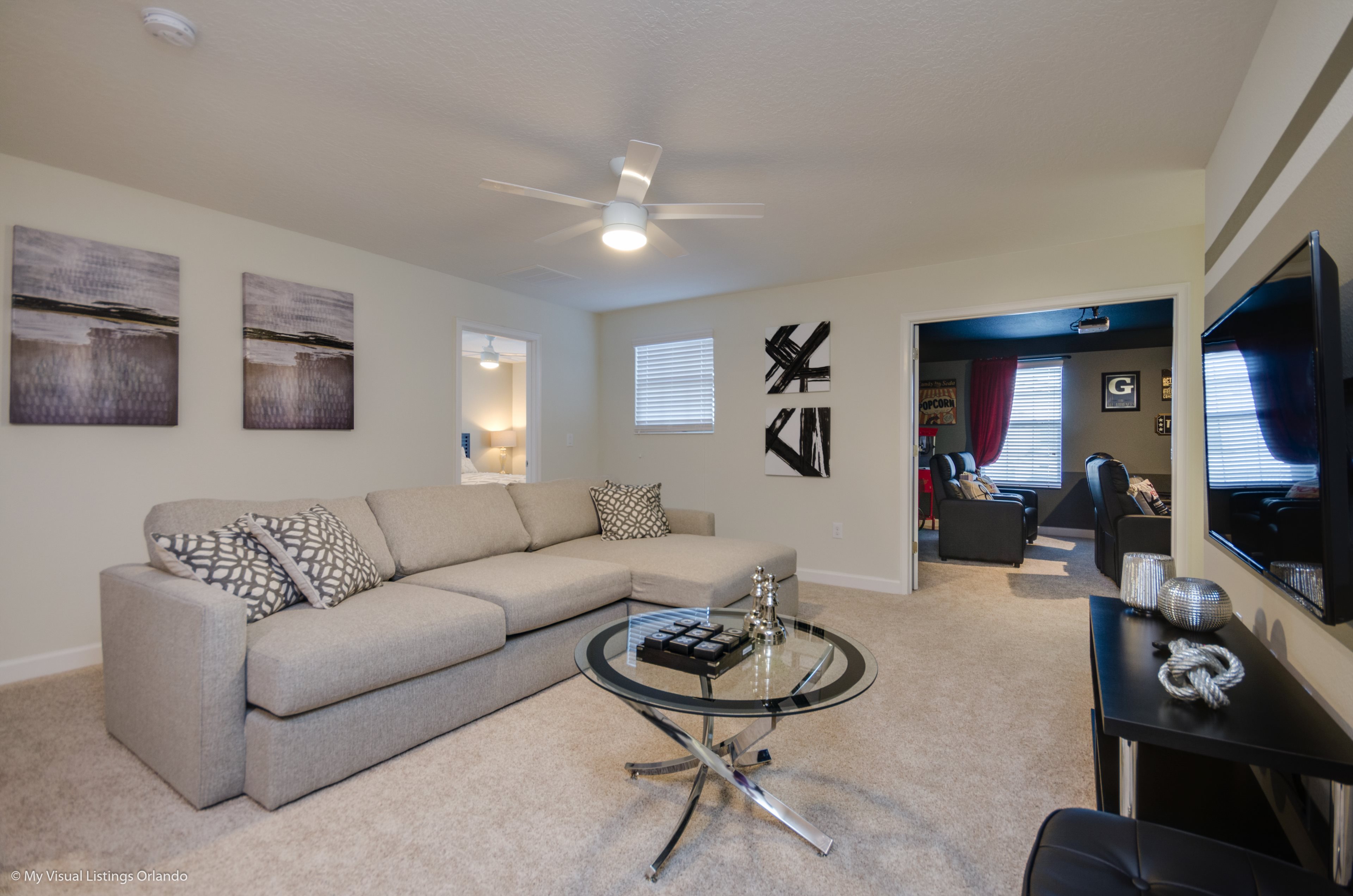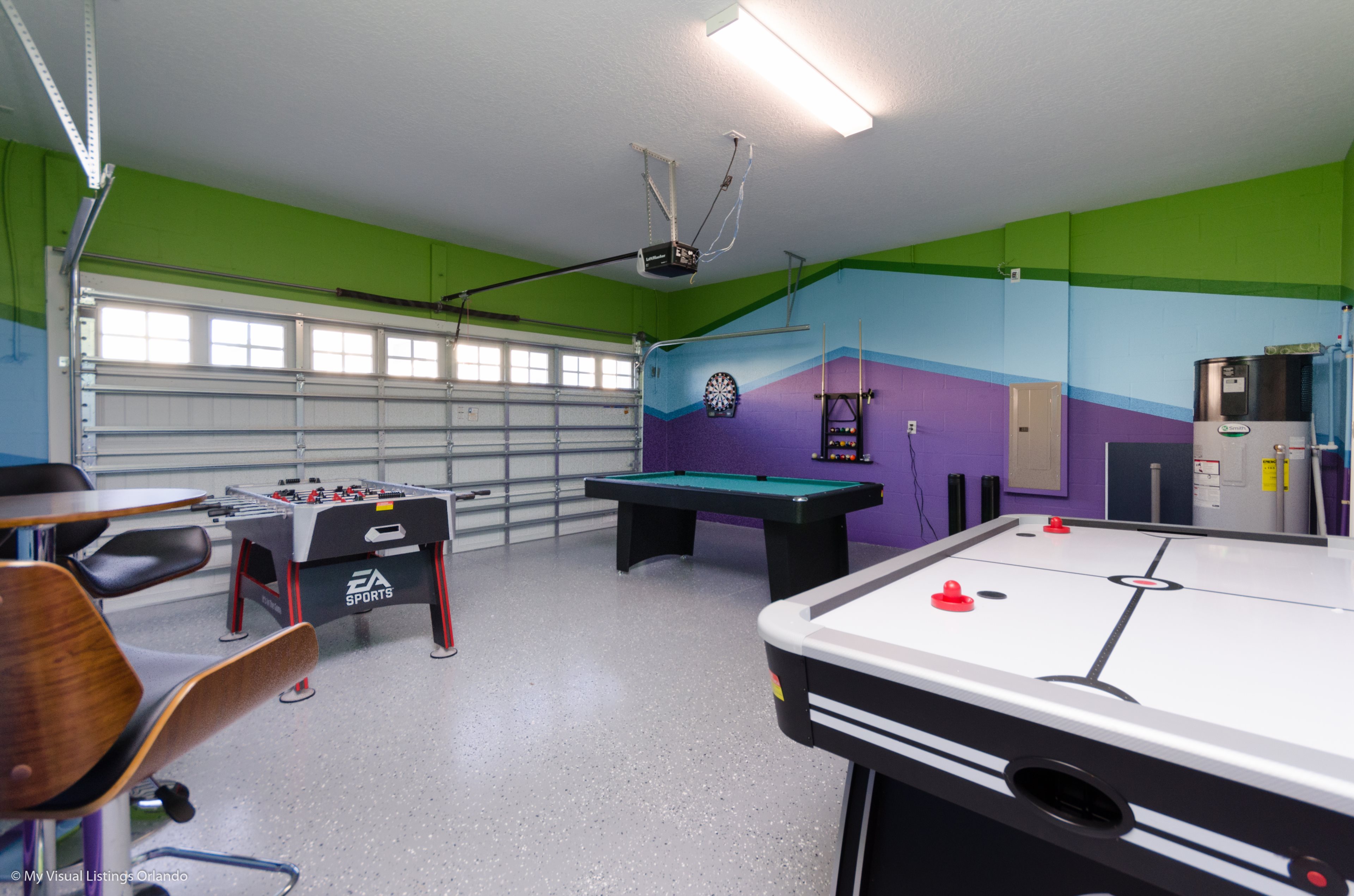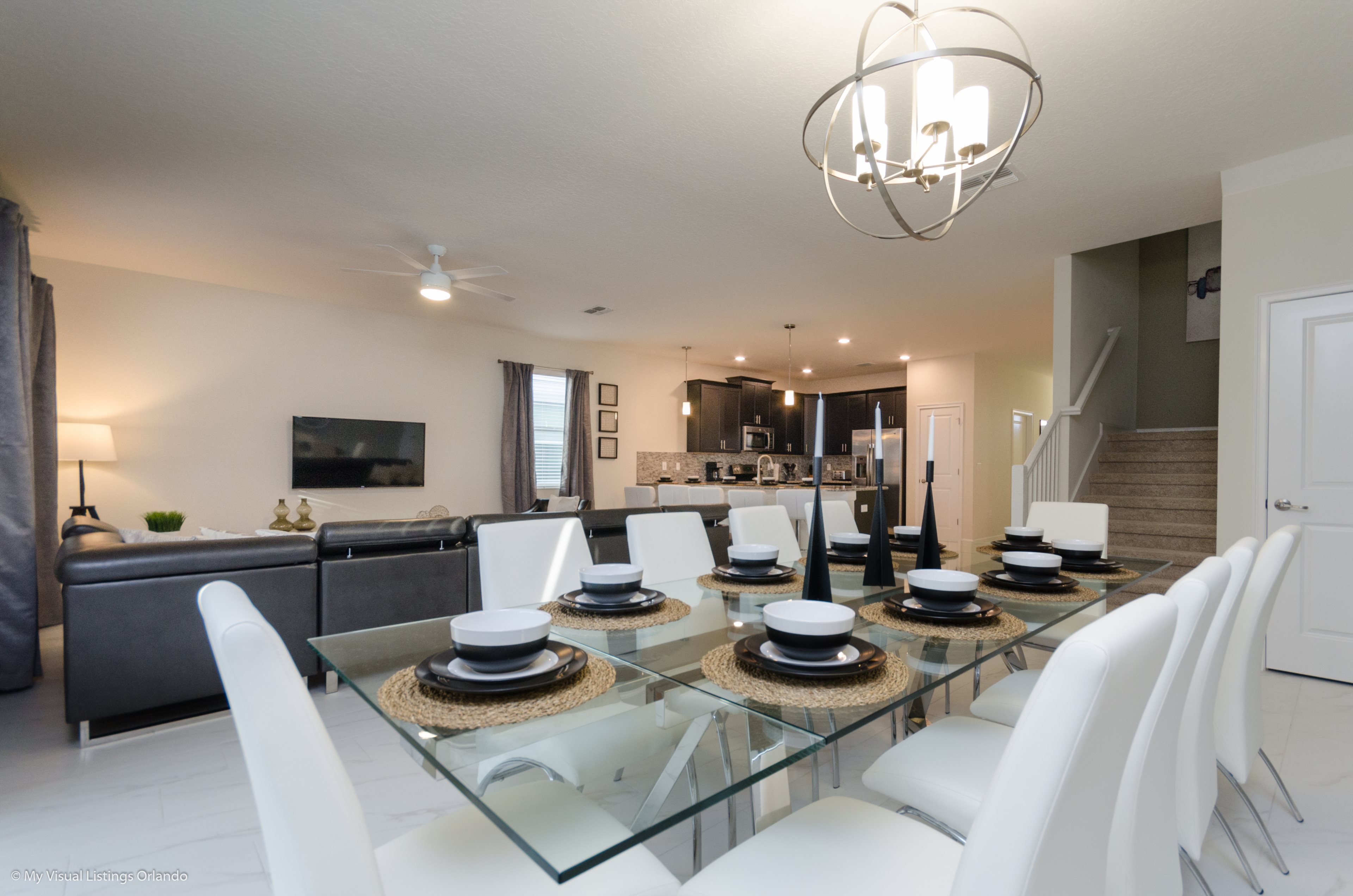 You will feel immediately relaxed as you enter our 8 bedroom, 5 bathroom executive home which sleeps up to 16 in style. We have paid great attention to every detail when we furnished this home and we hope you will enjoy it as much as we do with our own family. With 5 king bedrooms, 1 queen bedroom, 1 full bunk with twin below and 1 room with 2 twins , there is plenty of room for everyone to spread out and relax after a day out or just to stay in and take it easy. Each room has a different feel so all guests should be equally happy with their room, and all have wall mounted flat screen LED Tv’s. The dining room and living area offers plenty of space to congregate and enjoy meals together, and the bright and airy kitchen has all the appliances that you would expect in your own home. (There is also a full-size washer and dryer). You can also enjoy a game of pool in the game room, or watch a movie in the huge loft area, or leave the kids to play on the PlayStation. Or why not take a dip in the large pool or relax in the spa, even in the evening as the pool area is south facing? This home will bring all the excitement of Orlando to you, and have the entire group talking about your trip for months to come.