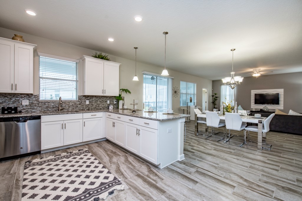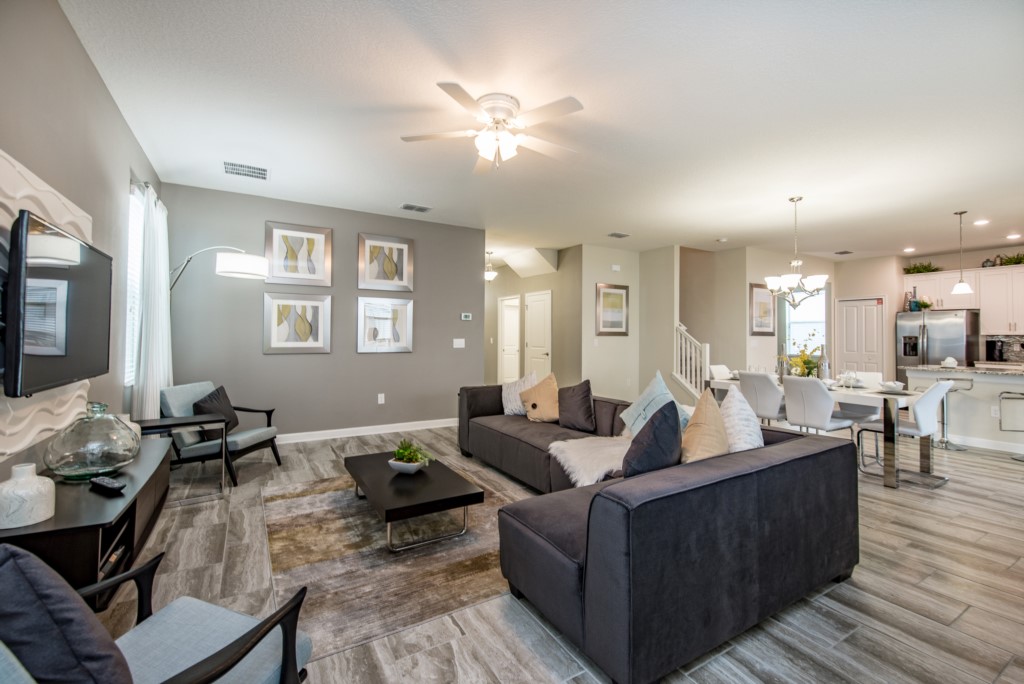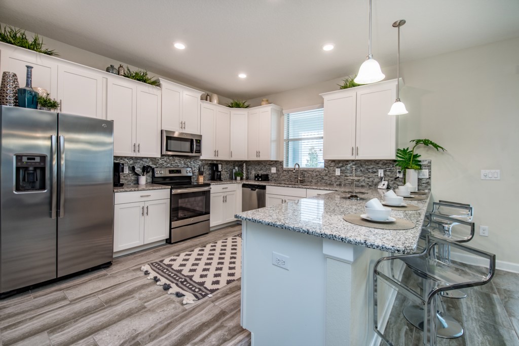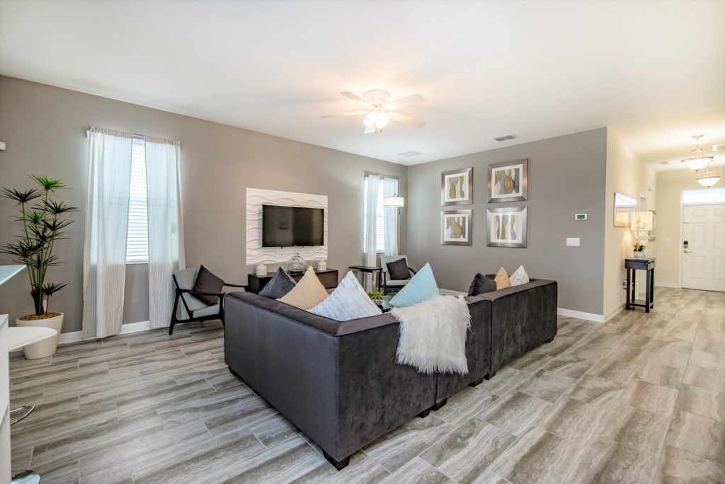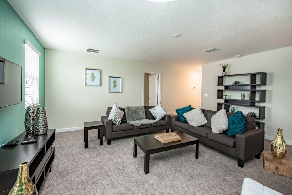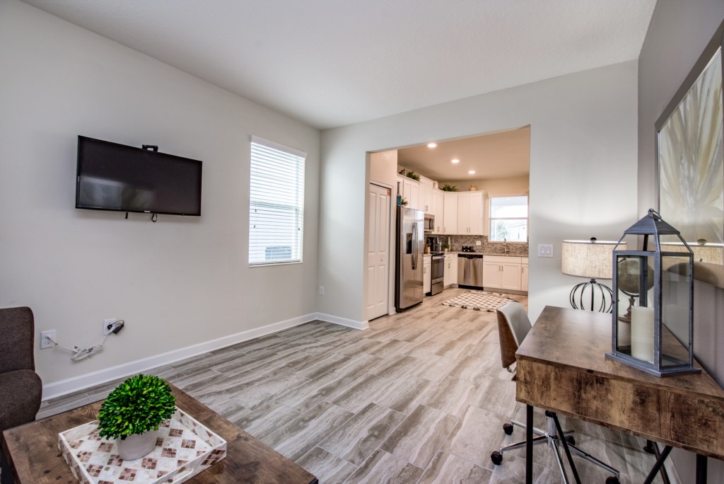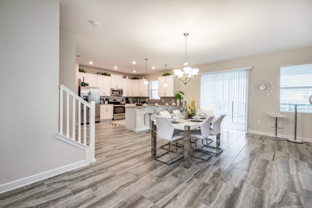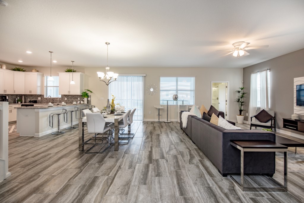 This home boasts over 3,000+ sq ft for you and your family to relax and unwind from long days at the park. This home has a large open floor plan easy for entertaining large families, and groups. The living area features plenty of seating around the large LCD TV, and adjacent is the dining area with seating for 8, and the kitchen, which is fully equipped, and fitted with granite countertops and stainless steel appliances.
