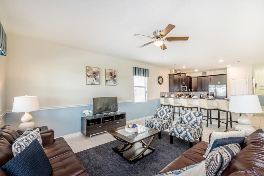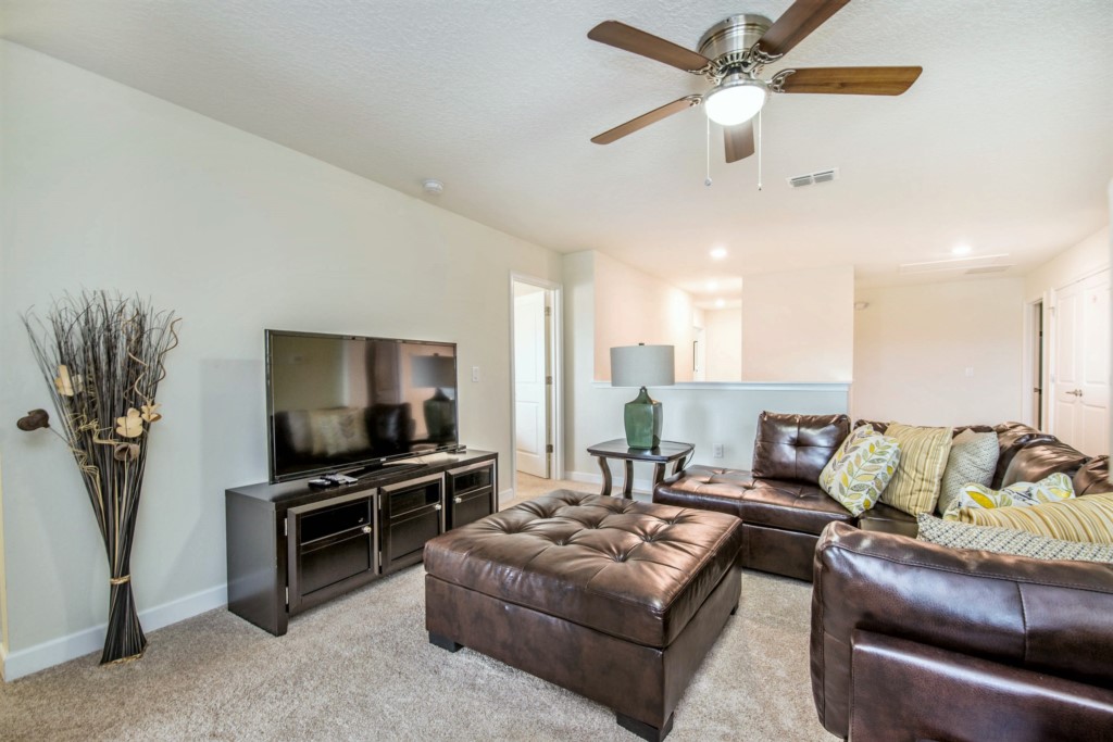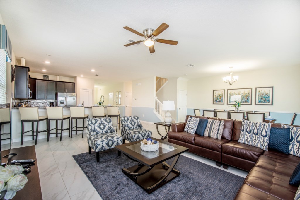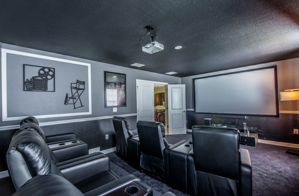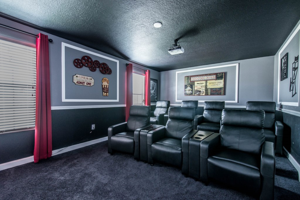 The home is professionally decorated and features luxurious amenities such as a leather furniture package, a 55-inch flat screen TV in the living area and a 43’’ flat screen TV in the upstairs living area, both have blu-ray. AND, there is a separate movie theatre featuring 7 movie-theater style lounge chairs. The kitchen includes granite countertops, stainless steel appliances and upgraded cabinetry and backsplash. The large dining room and kitchen bar seats many so all can dine together.