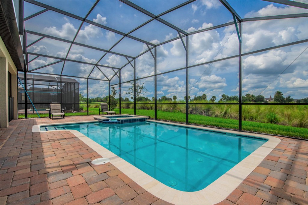 Welcome to the impressive resort community of ChampionsGate featuring the world-class Oasis Clubhouse. When you’re planning your next vacation to sunny central Florida, make sure to reserve this stunning 8 bedroom, 5 bathroom home with private pool and spa. As you see, this rental has a fabulous exterior elevation with its brick facade, tiled roof and brick paved walkways.