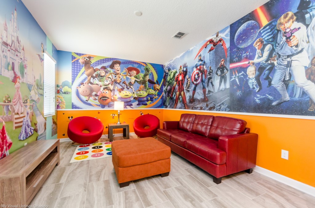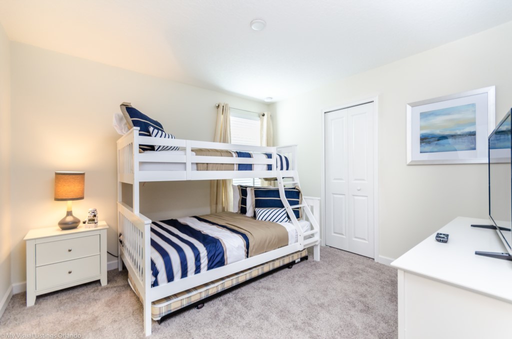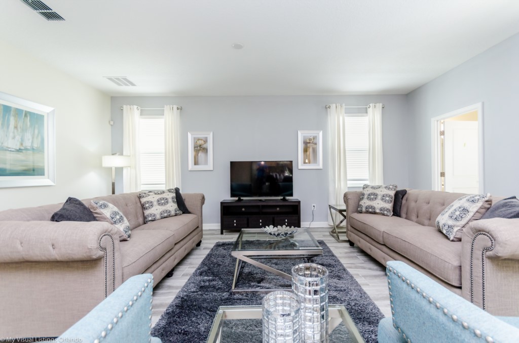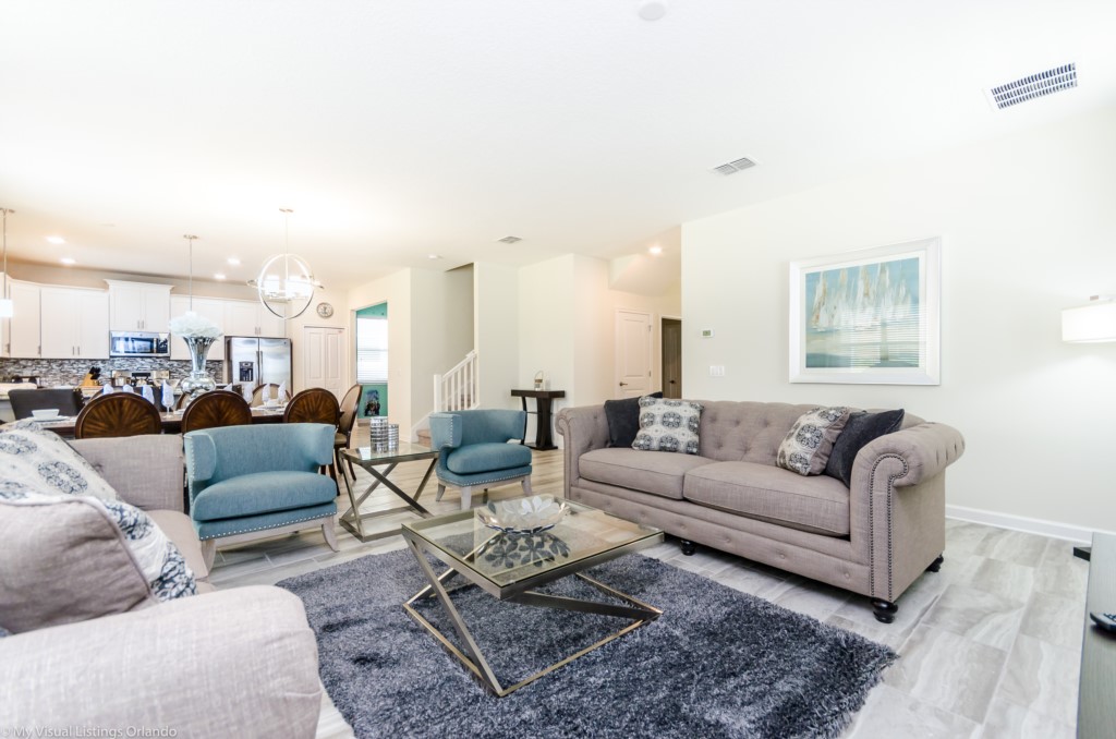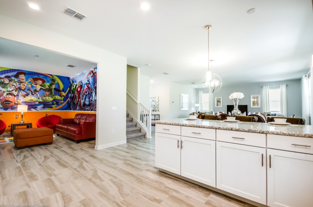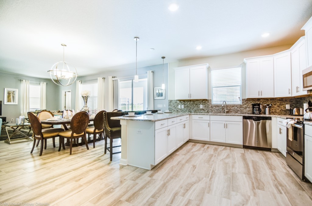 This home boasts over 3,000+ sq ft for you and your family to relax and unwind from long days at the park. This home has a large open floor plan easy for entertaining large families, and groups. The living area features plenty of seating around the large LCD TV, and adjacent is the dining area with seating for 8, and the kitchen, which is fully equipped, and fitted with granite countertops and stainless steel appliances.
