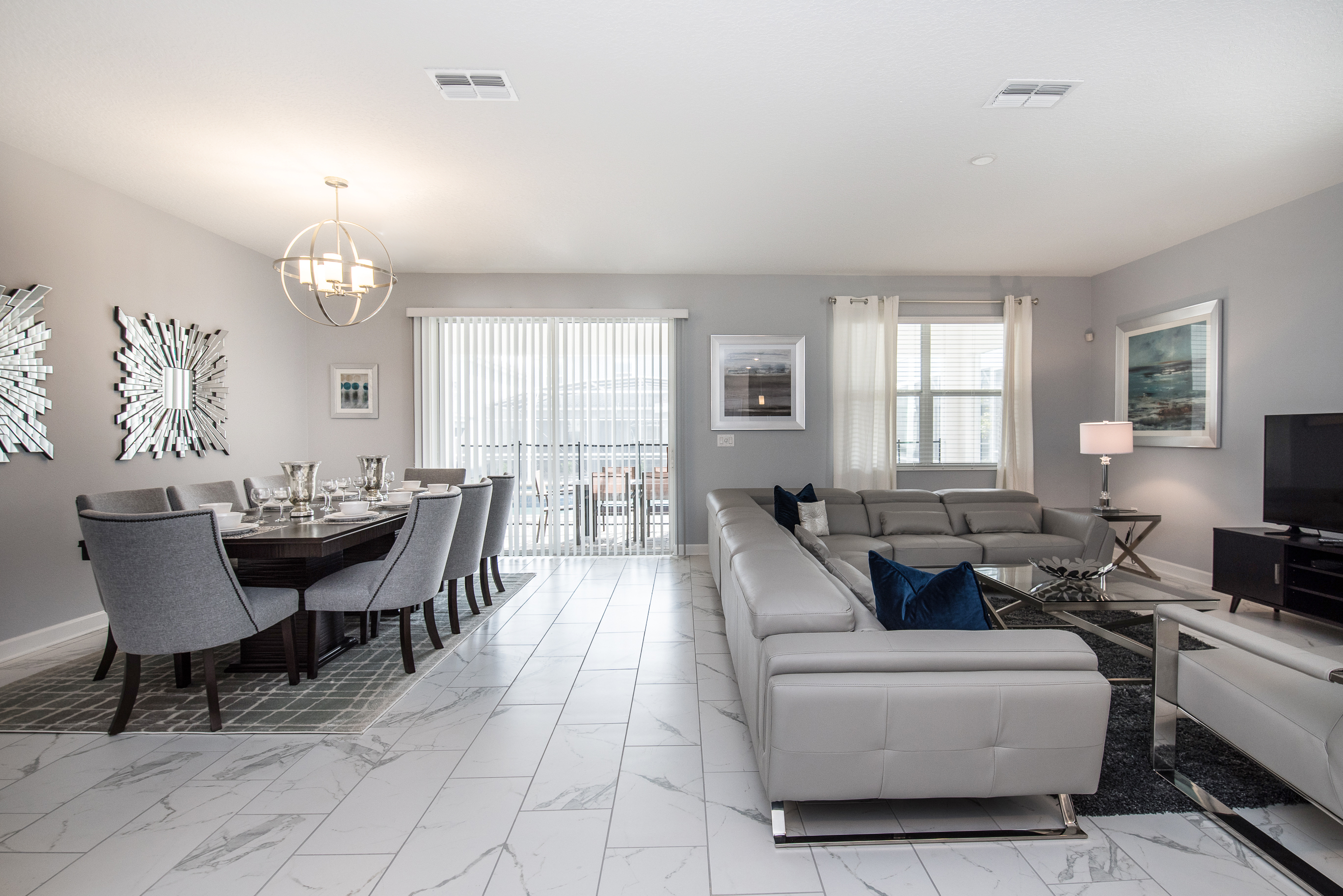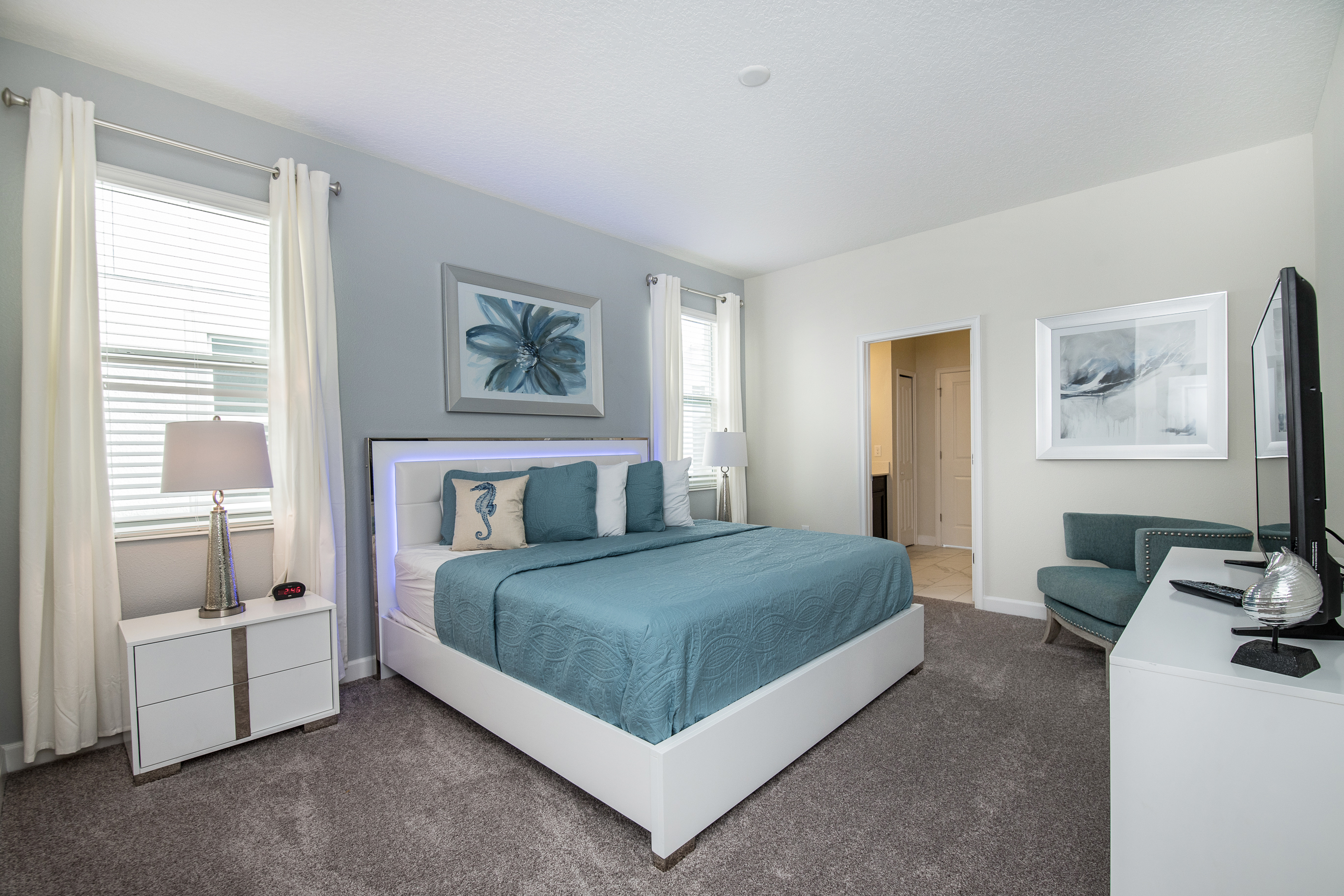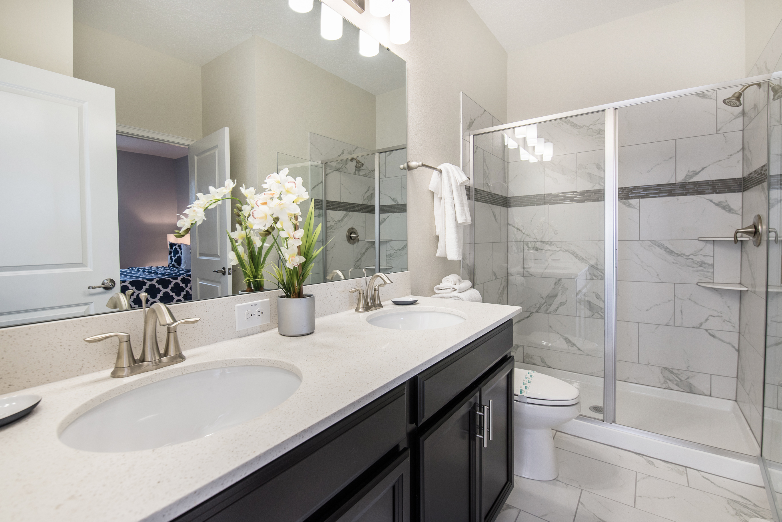 You will feel immediately relaxed as you enter our 8 bedroom, 5 bathroom executive home which sleeps up to 16 in style. We have paid great attention to every detail when we furnished this home and we hope you will enjoy it as much as we do with our own family. With 4 king bedrooms, 2 queen bedroom 2 twins rooms , there is plenty of room for everyone to spread out and relax after a day out or just to stay in and take it easy. Each room has a different feel so all guests should be equally happy with their room, and all have wall mounted flat screen LED Tv’s. The dining room and living area offers plenty of space to congregate and enjoy meals together, and the bright and airy kitchen has all the appliances that you would expect in your own home. (There is also a full-size washer and dryer). You can also enjoy a game of pool in the game room, or watch a movie in the huge loft area, or leave the kids to play on the PlayStation. Or why not take a dip in the large pool or relax in the spa, even in the evening as the pool area is south facing? This home will bring all the excitement of Orlando to you, and have the entire group talking about your trip for months to come.