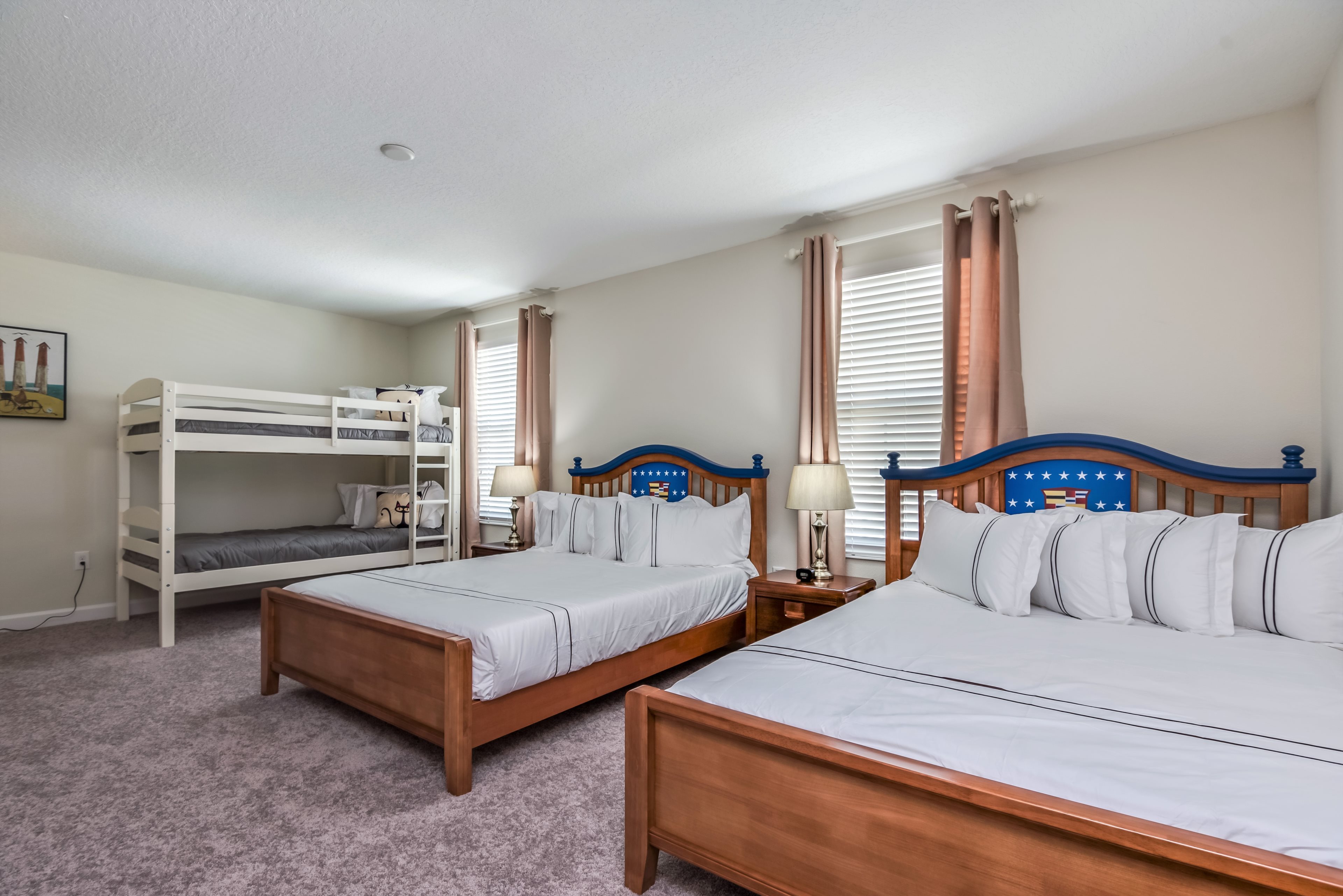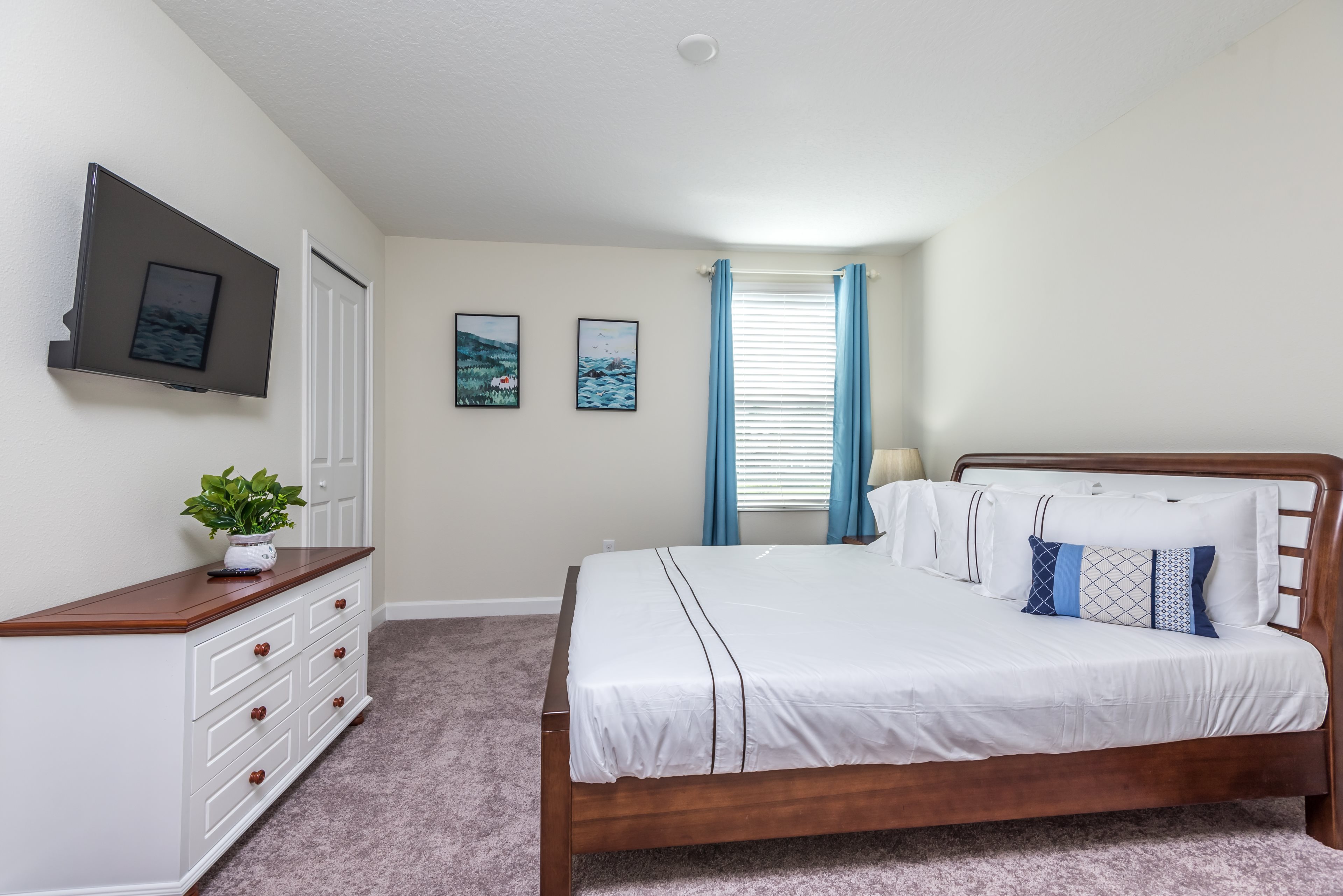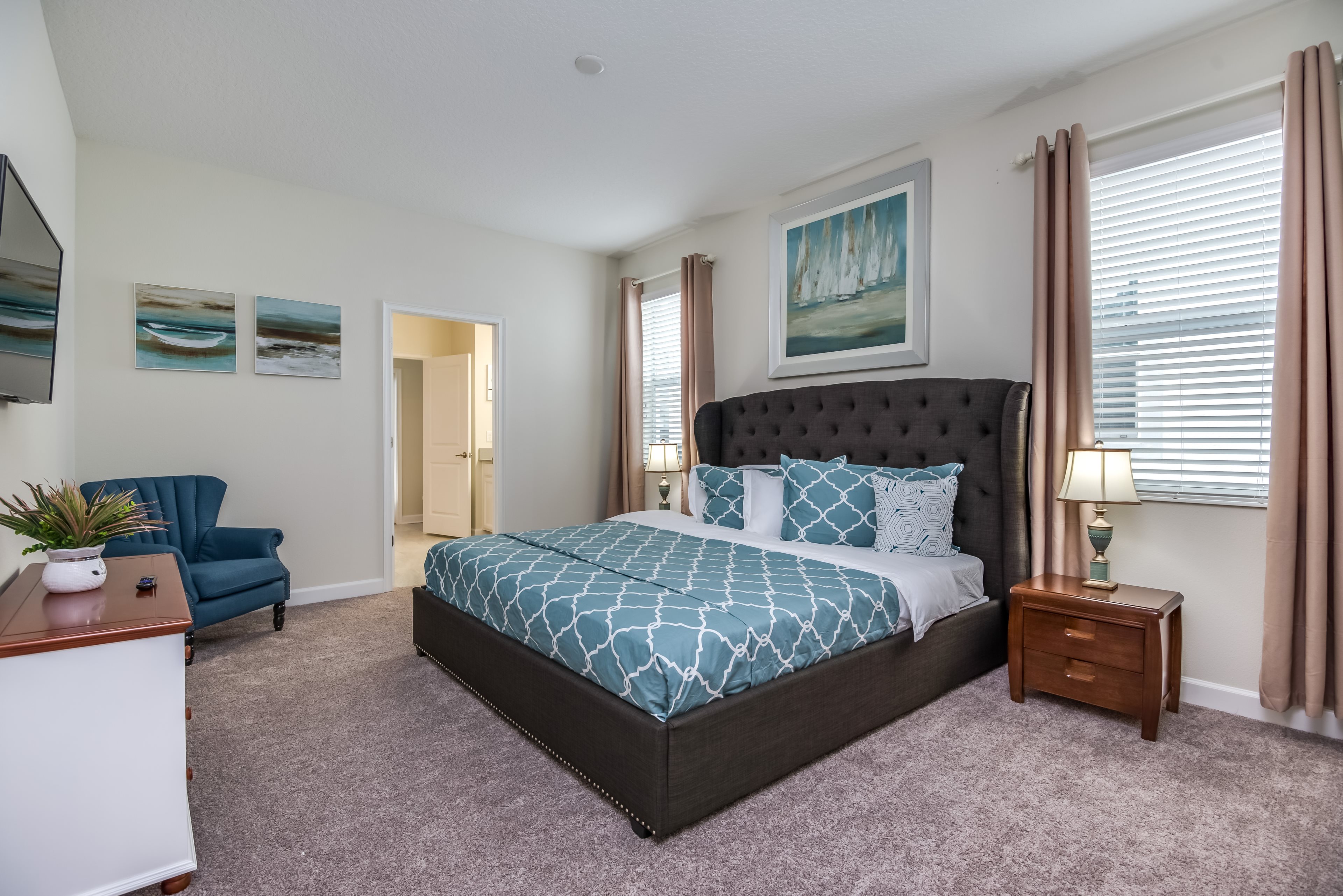 You will feel immediately relaxed as you enter our 8 bedroom, 5 bathroom executive home which sleeps up to 16 in style. We have paid great attention to every detail when we furnished this home and we hope you will enjoy it as much as we do with our own family. With 4 king bedrooms, 2 queen bedroom 2 twins rooms , there is plenty of room for everyone to spread out and relax after a day out or just to stay in and take it easy. Each room has a different feel so all guests should be equally happy with their room, and all have wall mounted flat screen LED Tv’s. The dining room and living area offers plenty of space to congregate and enjoy meals together, and the bright and airy kitchen has all the appliances that you would expect in your own home. (There is also a full-size washer and dryer). You can also enjoy a game of pool in the game room, or watch a movie in the huge loft area, or leave the kids to play on the PlayStation. Or why not take a dip in the large pool or relax in the spa, even in the evening as the pool area is south facing? This home will bring all the excitement of Orlando to you, and have the entire group talking about your trip for months to come.