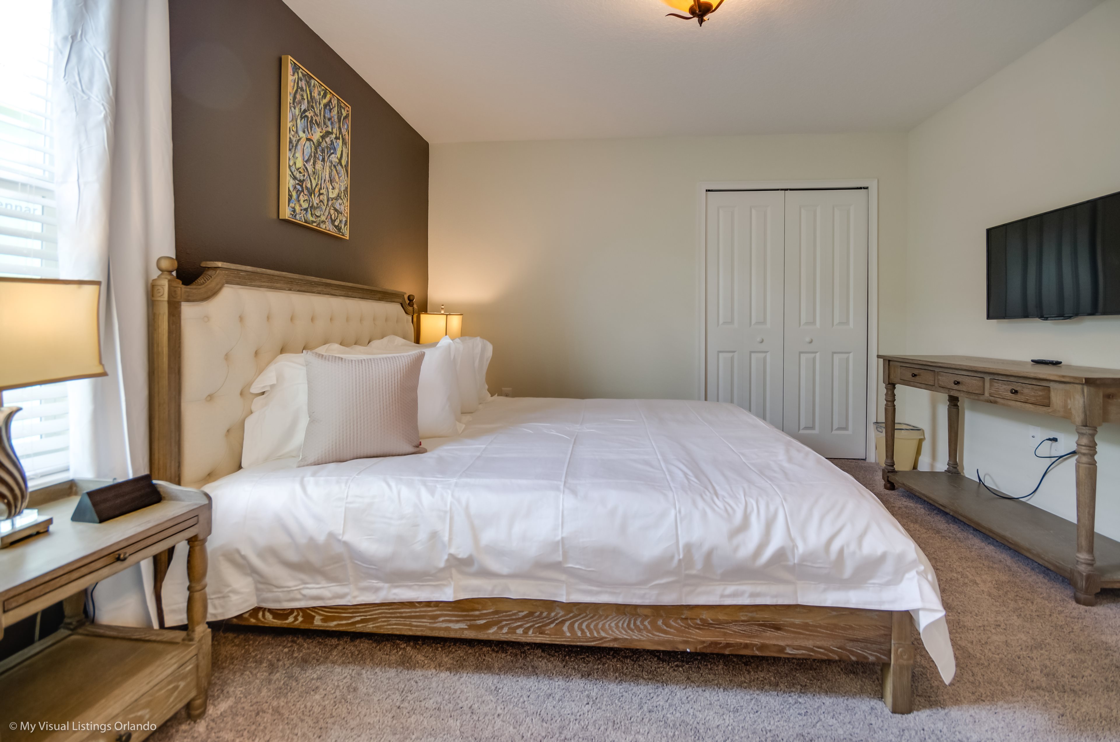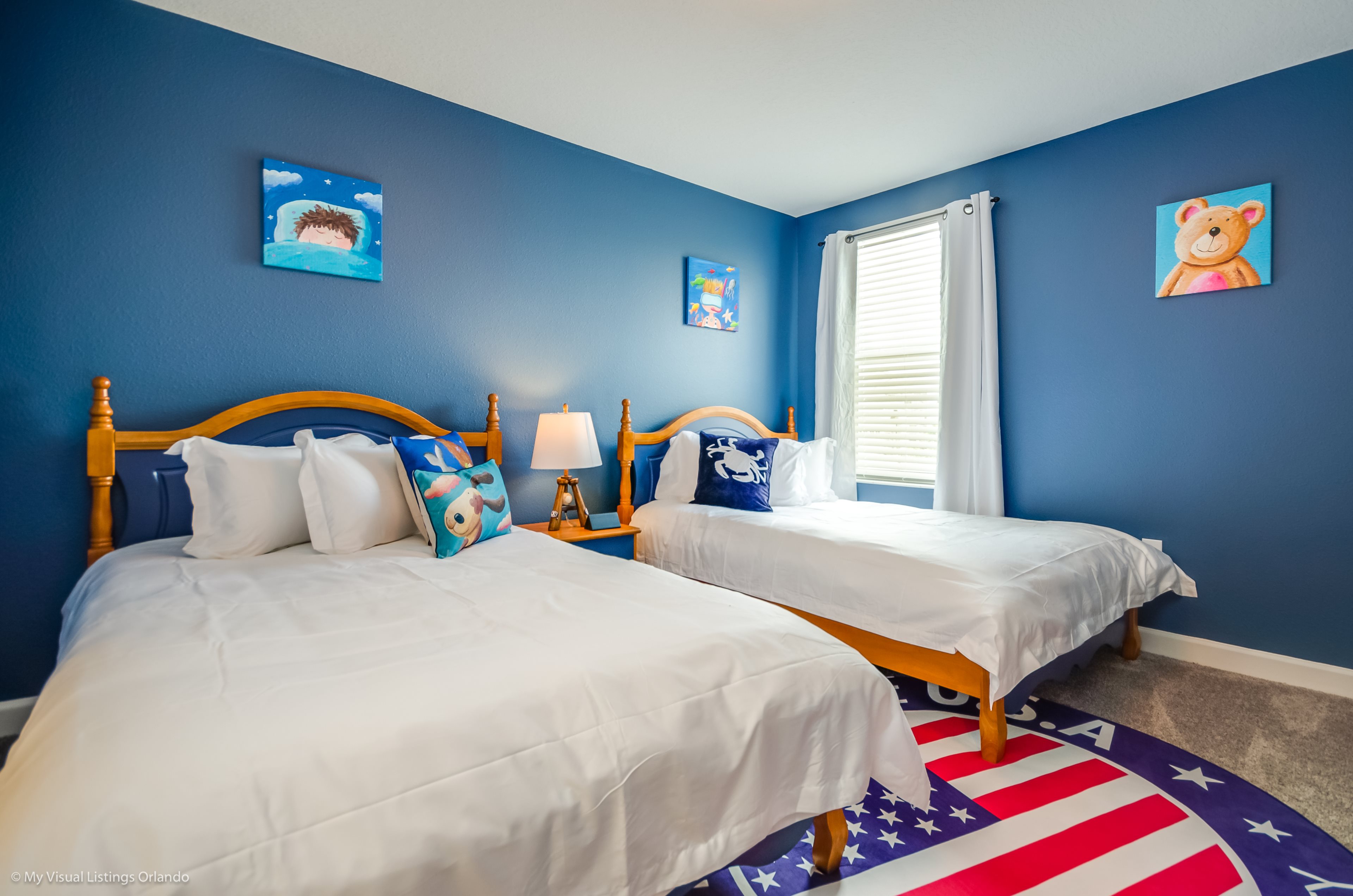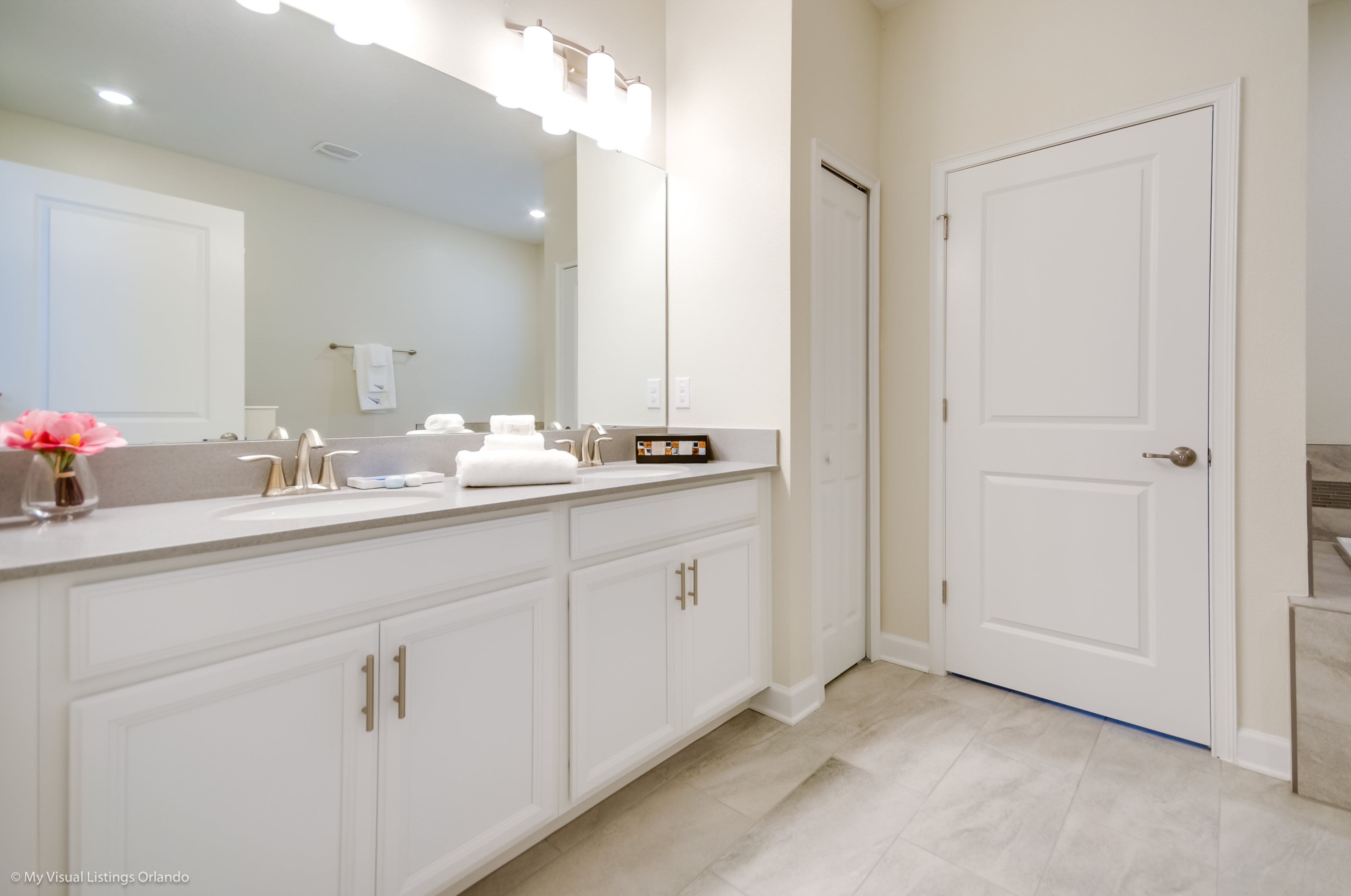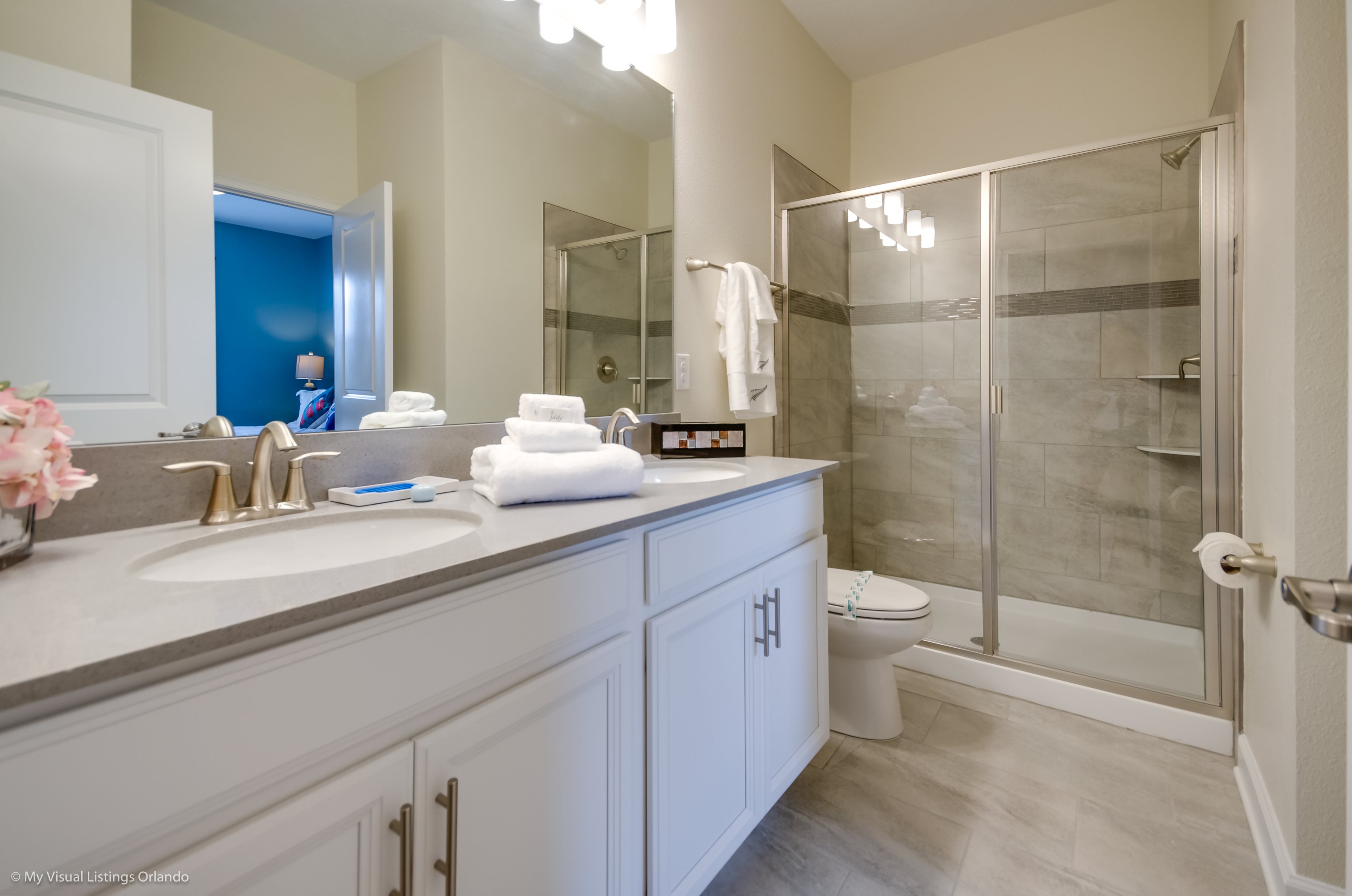 You will feel immediately relaxed as you enter our 8 bedroom, 5 bathroom executive home which sleeps up to 16 in style. We have paid great attention to every detail when we furnished this home and we hope you will enjoy it as much as we do with our own family. With 4 king bedrooms, 2 Queen and 2 Bedrooms with 2 twins beds , there is plenty of room for everyone to spread out and relax after a day out or just to stay in and take it easy. Each room has a different feel so all guests should be equally happy with their room, and all have wall mounted flat screen LED Tv’s. The dining room and living area offers plenty of space to congregate and enjoy meals together, and the bright and airy kitchen has all the appliances that you would expect in your own home. (There is also a full-size washer and dryer). You can also enjoy a game of pool in the game room, or watch a movie in the huge loft area, or leave the kids to play on the PlayStation. Or why not take a dip in the large pool or relax in the spa, even in the evening as the pool area is south facing? This home will bring all the excitement of Orlando to you, and have the entire group talking about your trip for months to come.