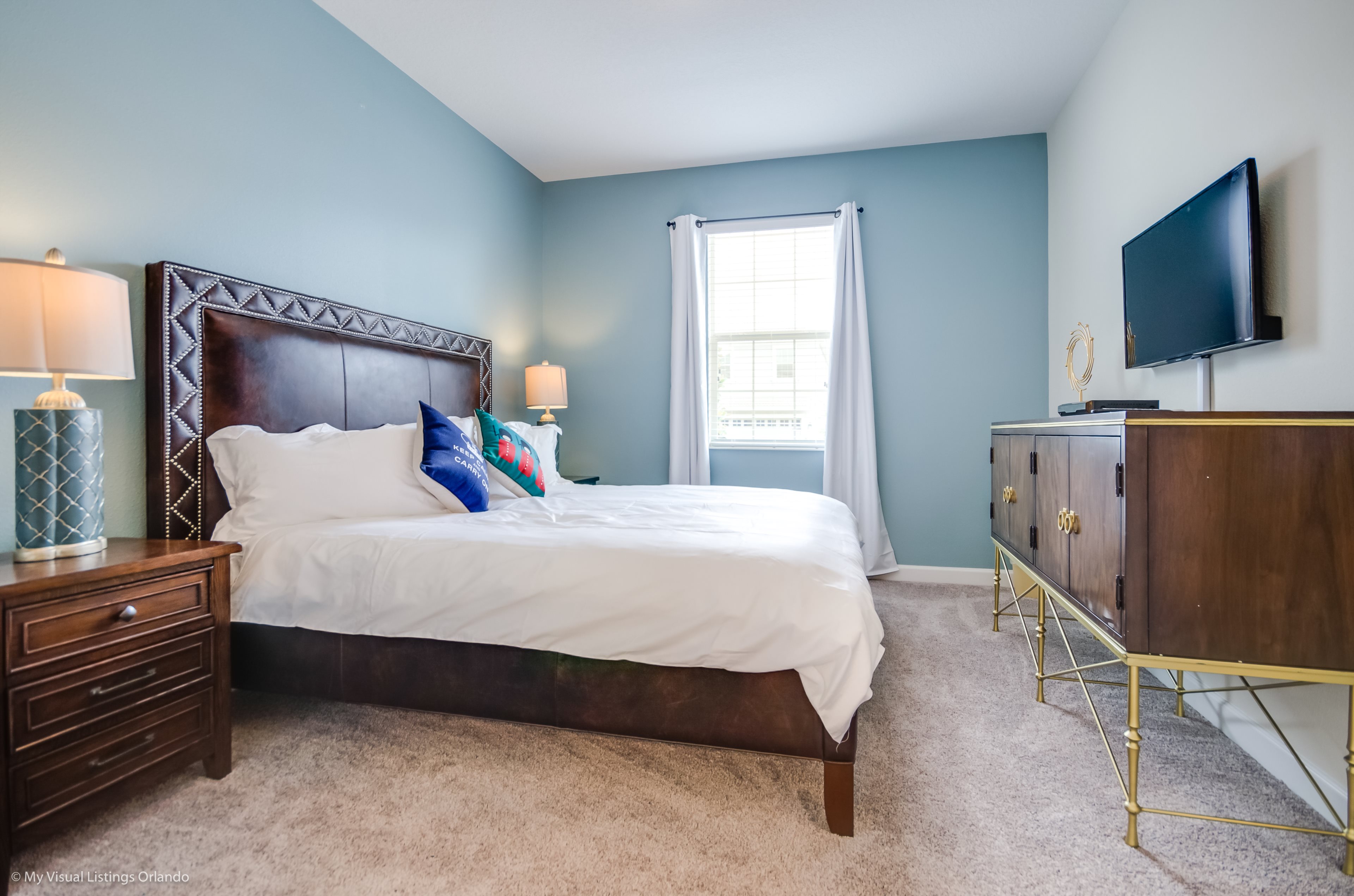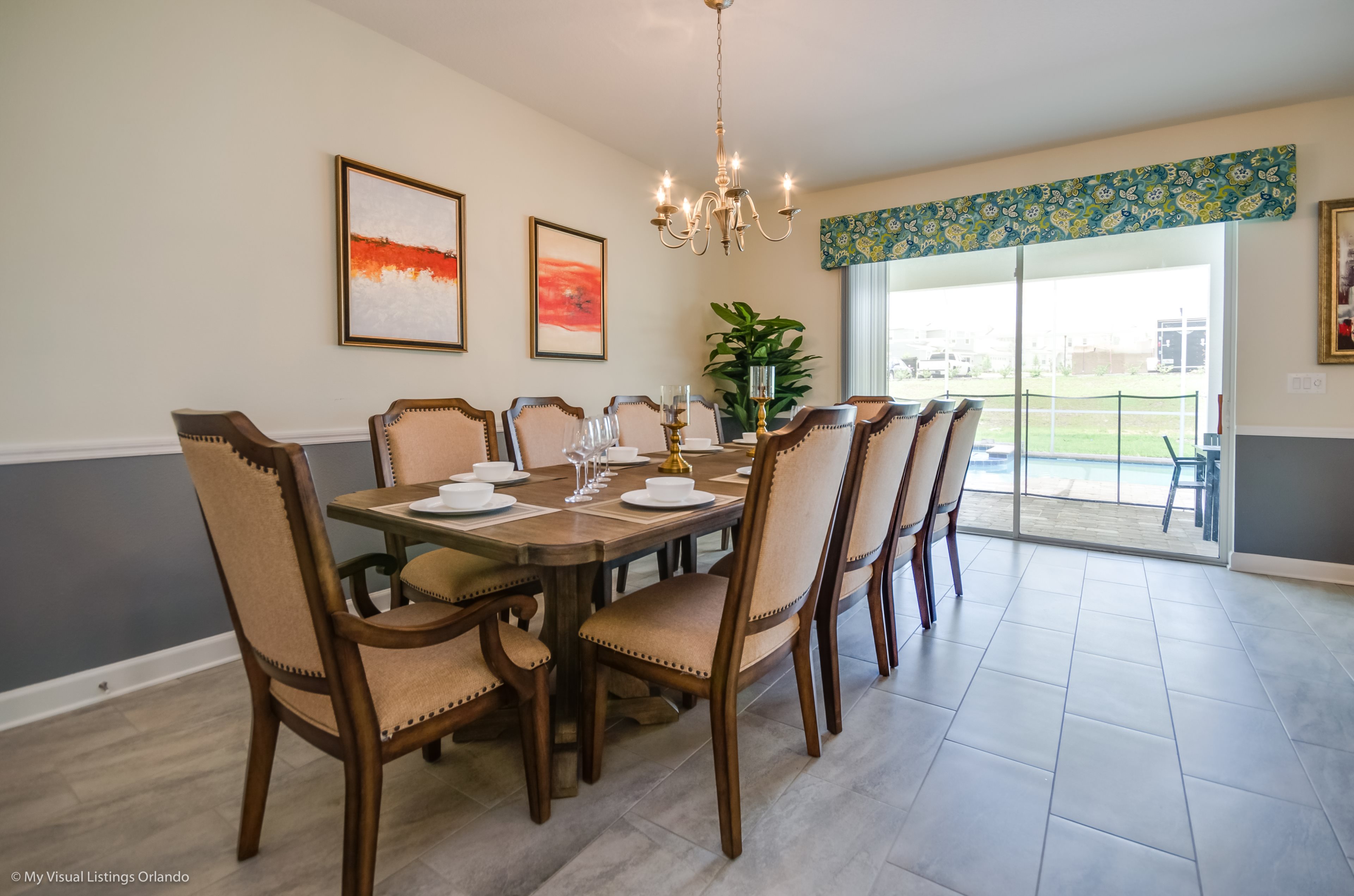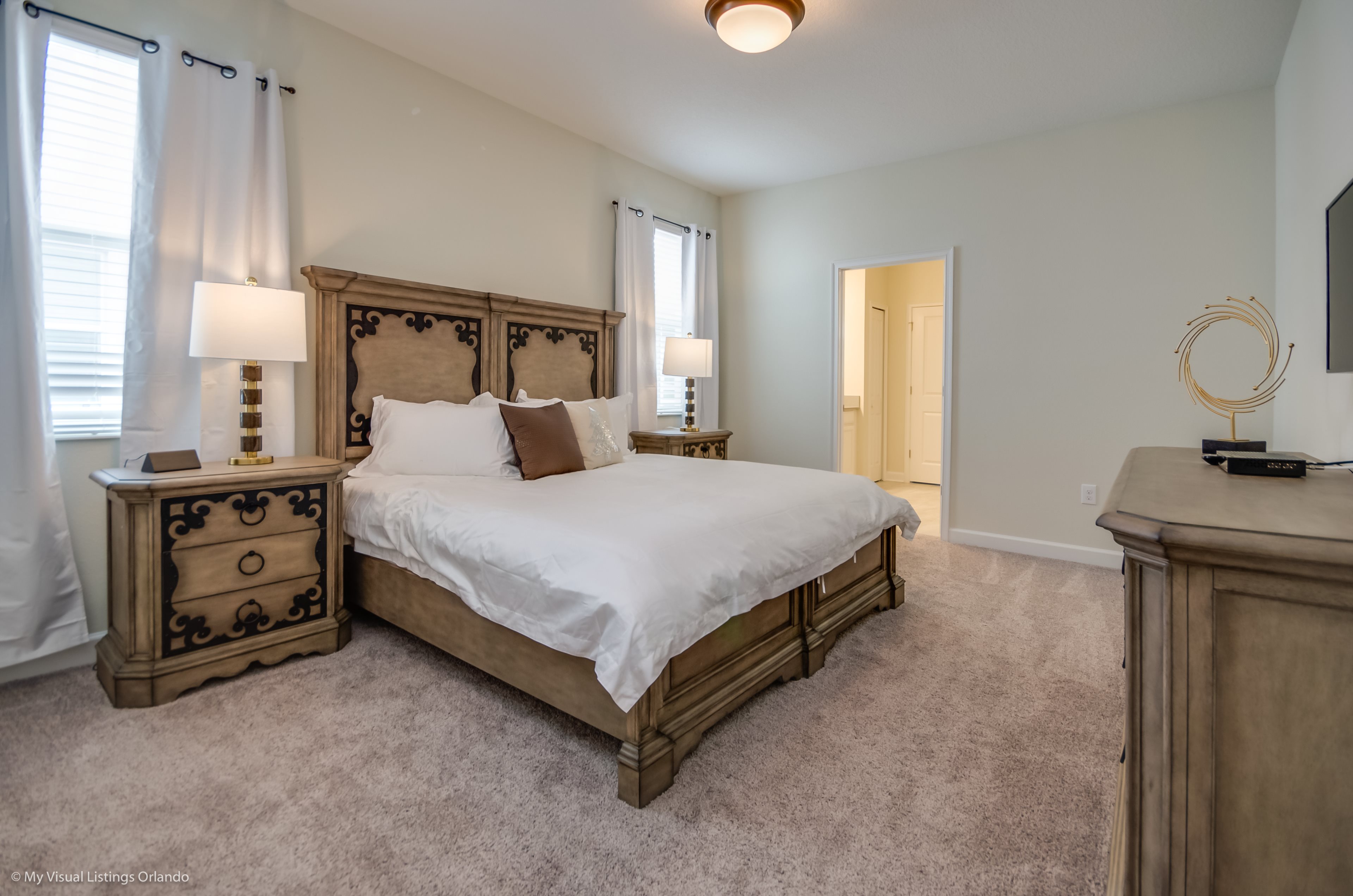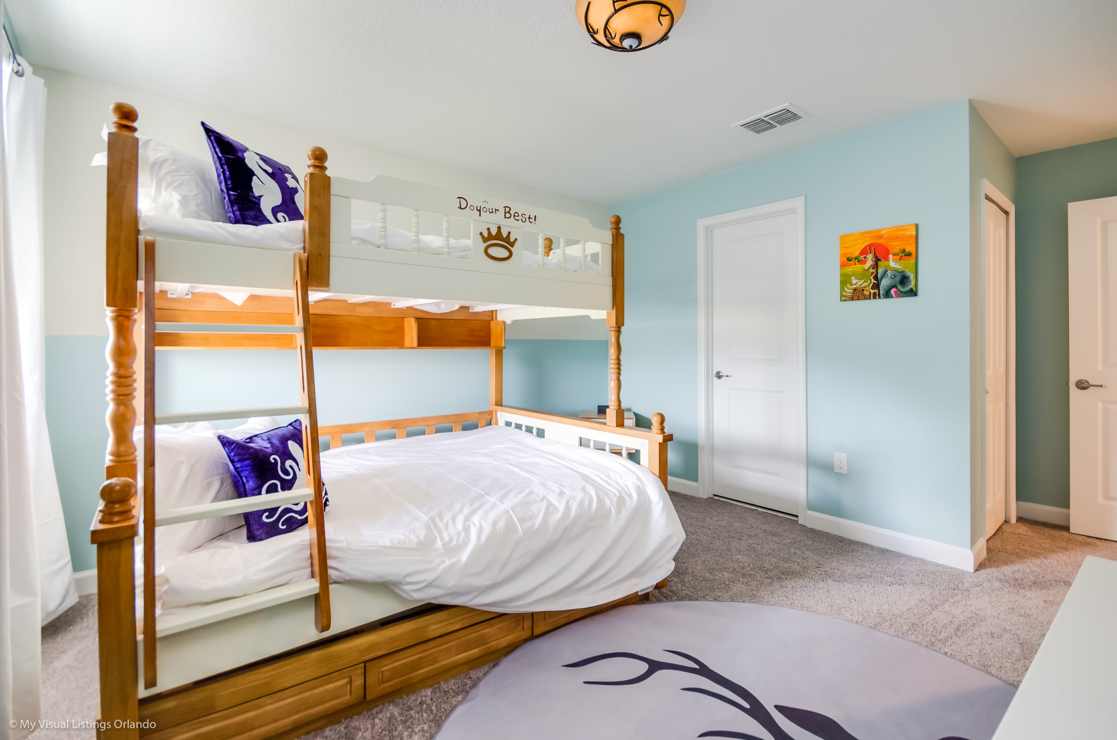 You will feel immediately relaxed as you enter our 8 bedroom, 5 bathroom executive home which sleeps up to 16 in style. We have paid great attention to every detail when we furnished this home and we hope you will enjoy it as much as we do with our own family. With 4 king bedrooms, 2 Queen and 2 Bedrooms with 2 twins beds , there is plenty of room for everyone to spread out and relax after a day out or just to stay in and take it easy. Each room has a different feel so all guests should be equally happy with their room, and all have wall mounted flat screen LED Tv’s. The dining room and living area offers plenty of space to congregate and enjoy meals together, and the bright and airy kitchen has all the appliances that you would expect in your own home. (There is also a full-size washer and dryer). You can also enjoy a game of pool in the game room, or watch a movie in the huge loft area, or leave the kids to play on the PlayStation. Or why not take a dip in the large pool or relax in the spa, even in the evening as the pool area is south facing? This home will bring all the excitement of Orlando to you, and have the entire group talking about your trip for months to come.