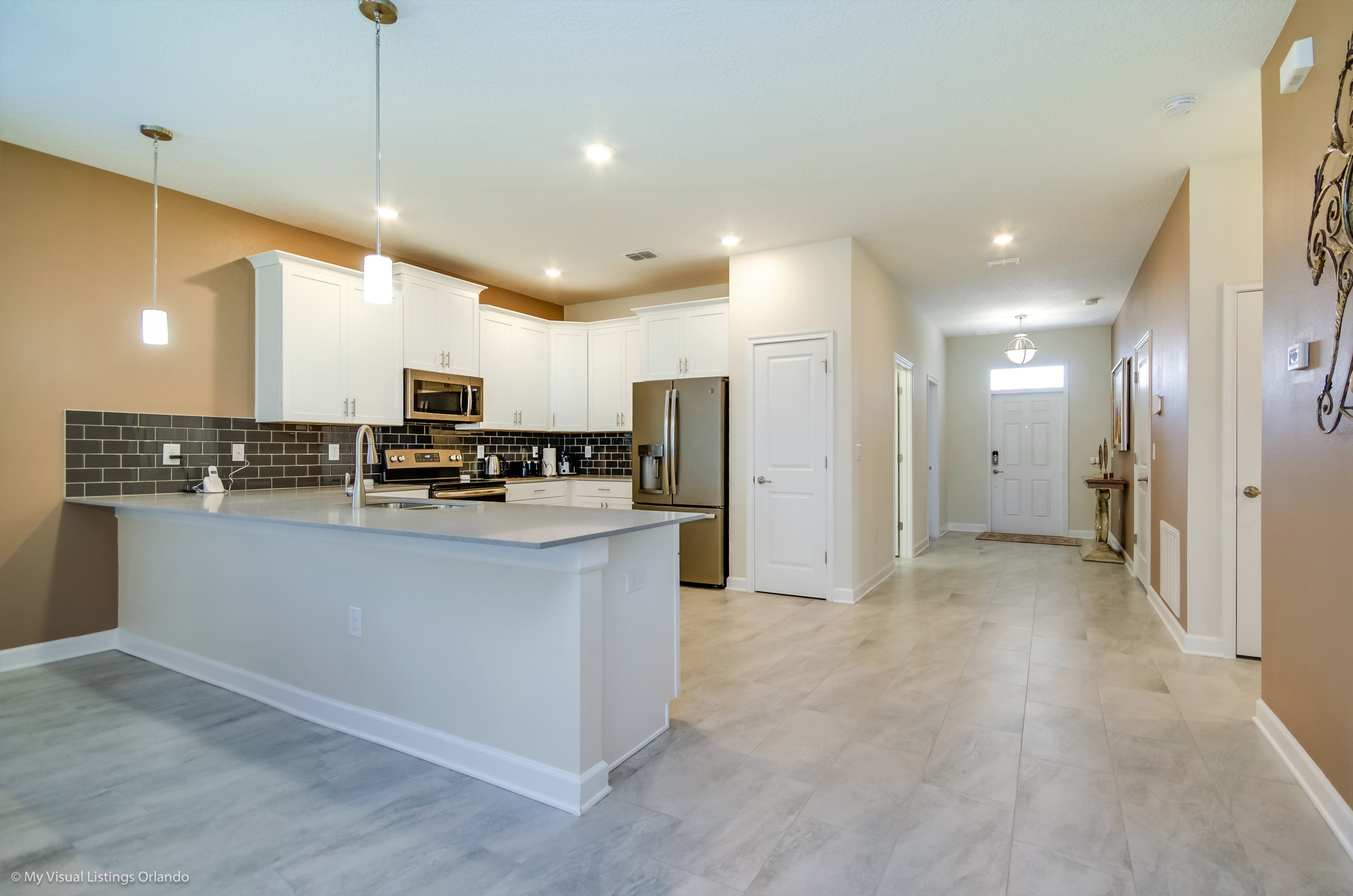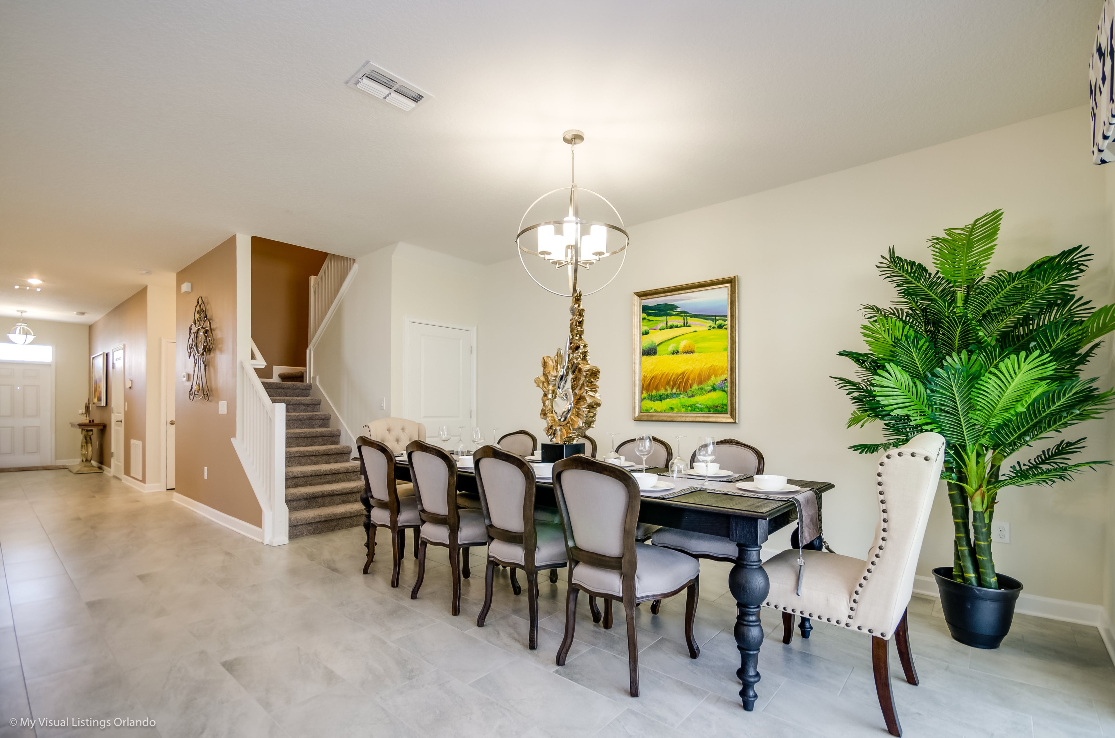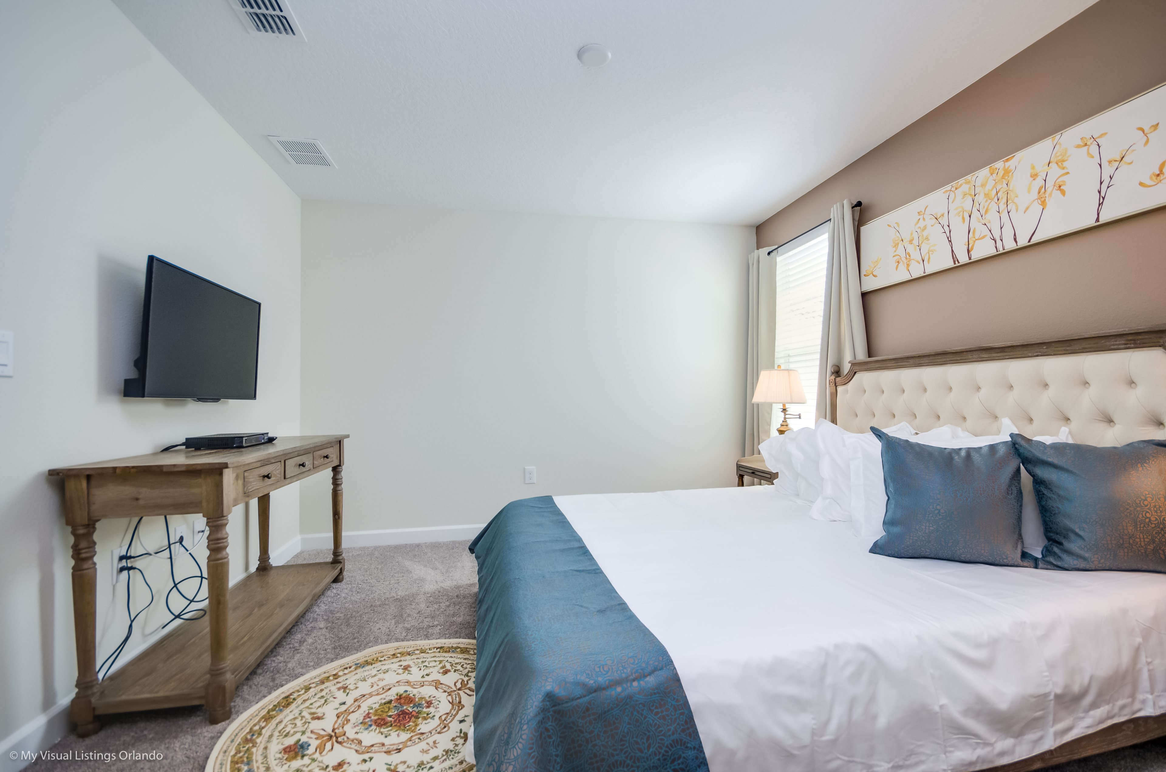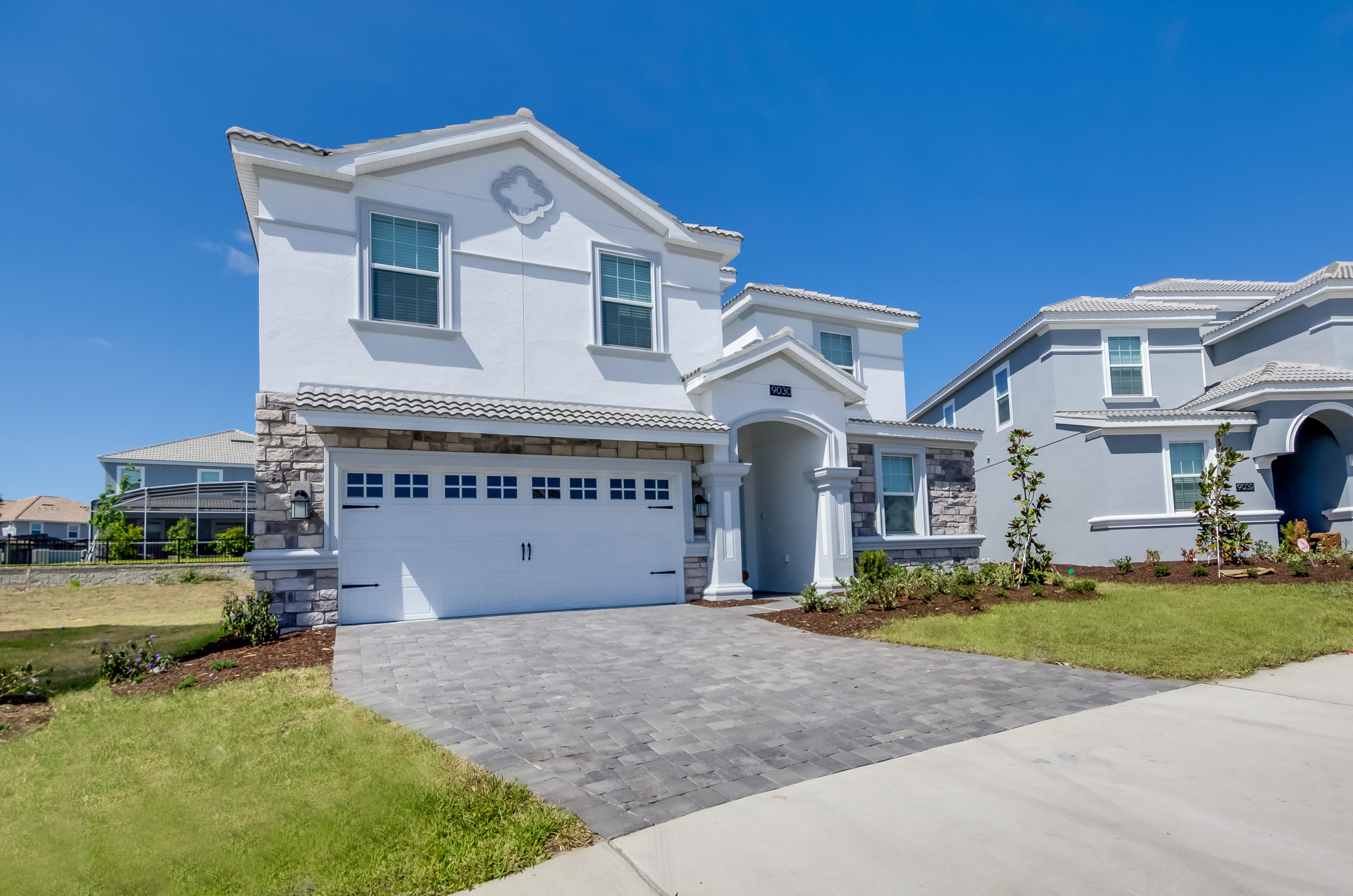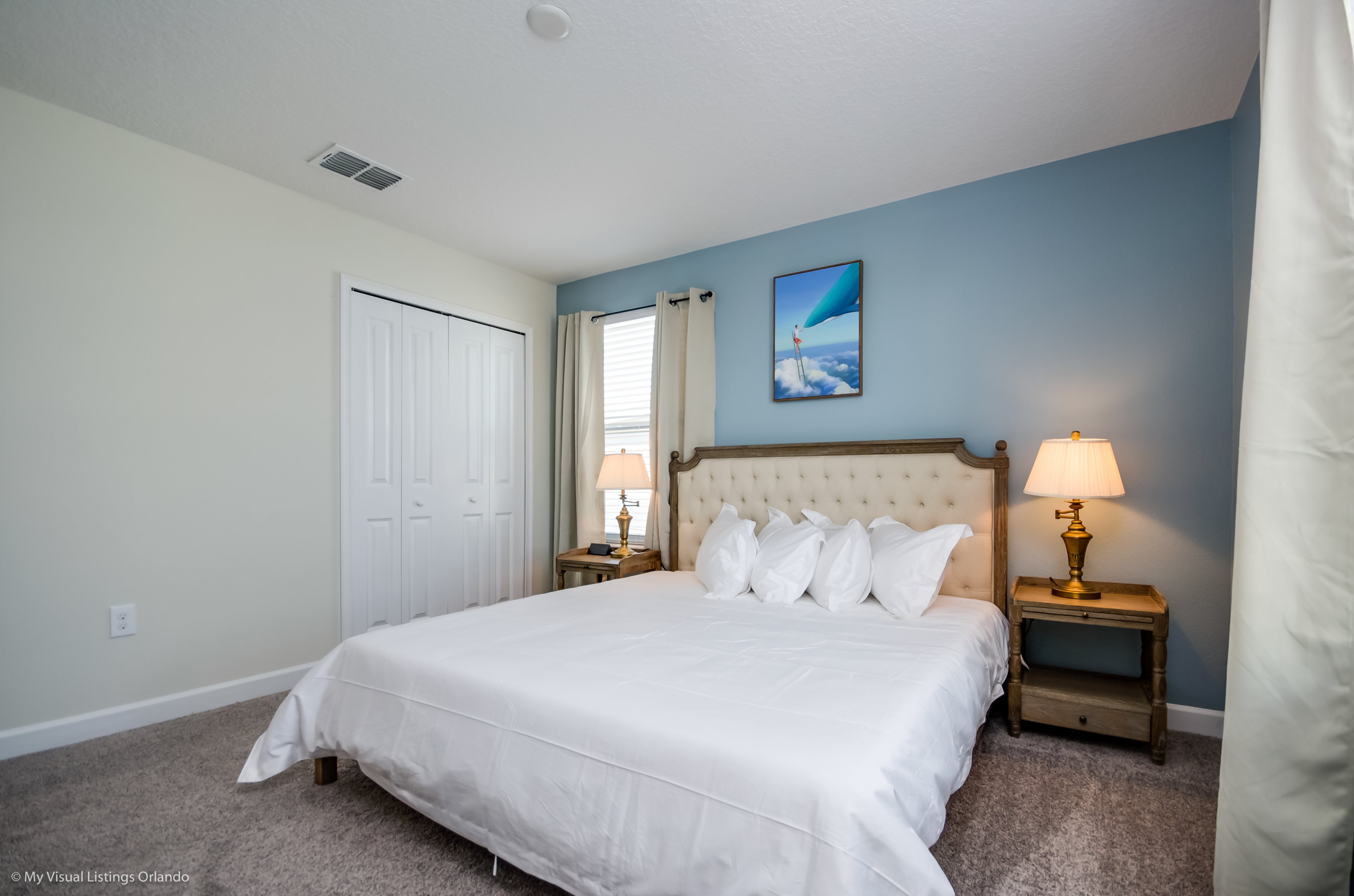 You will feel immediately relaxed as you enter our 8 bedroom, 5 bathroom executive home which sleeps up to 16 in style. We have paid great attention to every detail when we furnished this home and we hope you will enjoy it as much as we do with our own family. With 4 king bedrooms, 2 Queen and 2 Bedrooms with 2 twins beds , there is plenty of room for everyone to spread out and relax after a day out or just to stay in and take it easy. Each room has a different feel so all guests should be equally happy with their room, and all have wall mounted flat screen LED Tv’s. The dining room and living area offers plenty of space to congregate and enjoy meals together, and the bright and airy kitchen has all the appliances that you would expect in your own home. (There is also a full-size washer and dryer). You can also enjoy a game of pool in the game room, or watch a movie in the huge loft area, or leave the kids to play on the PlayStation. Or why not take a dip in the large pool or relax in the spa, even in the evening as the pool area is south facing? This home will bring all the excitement of Orlando to you, and have the entire group talking about your trip for months to come.