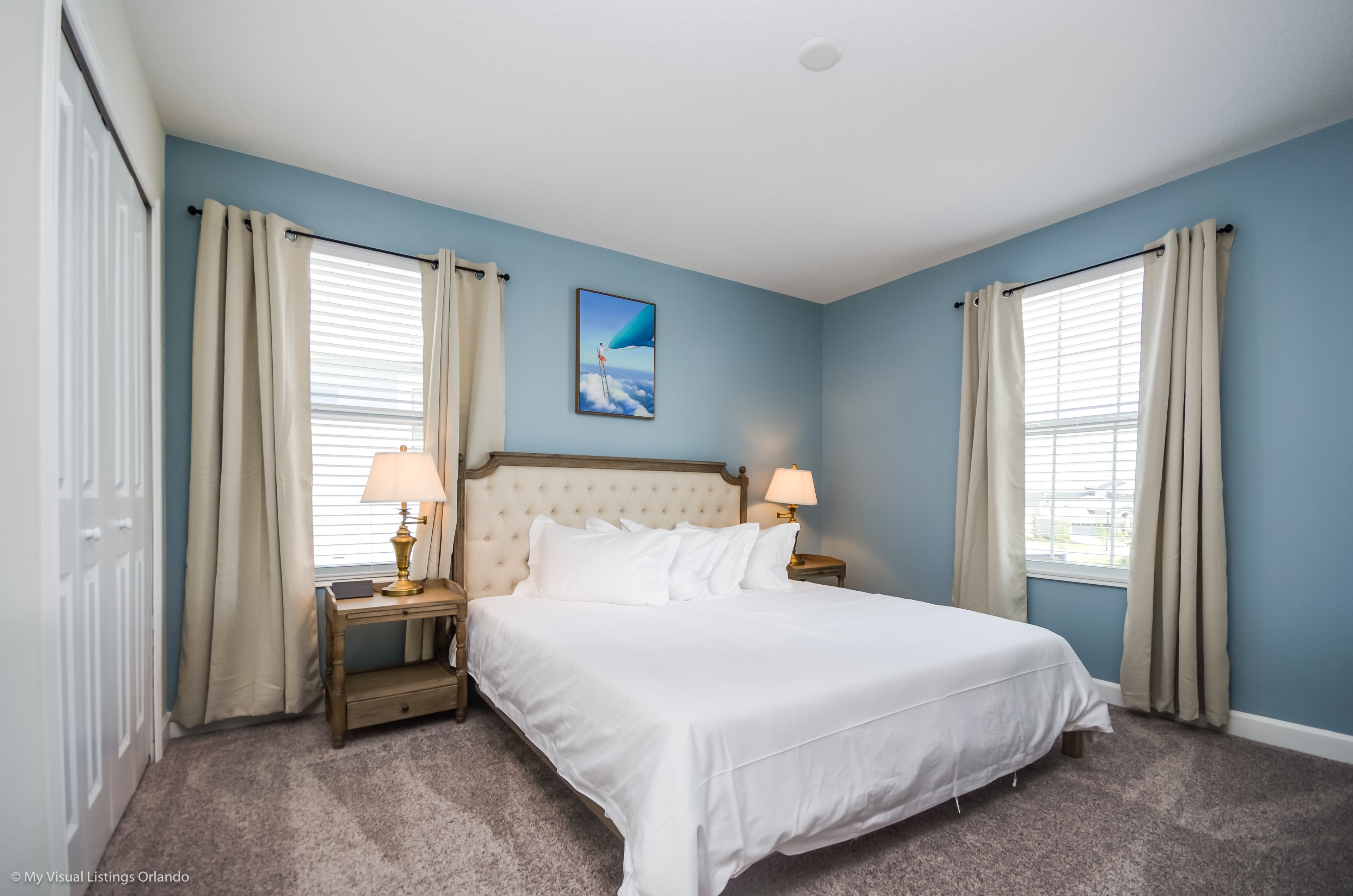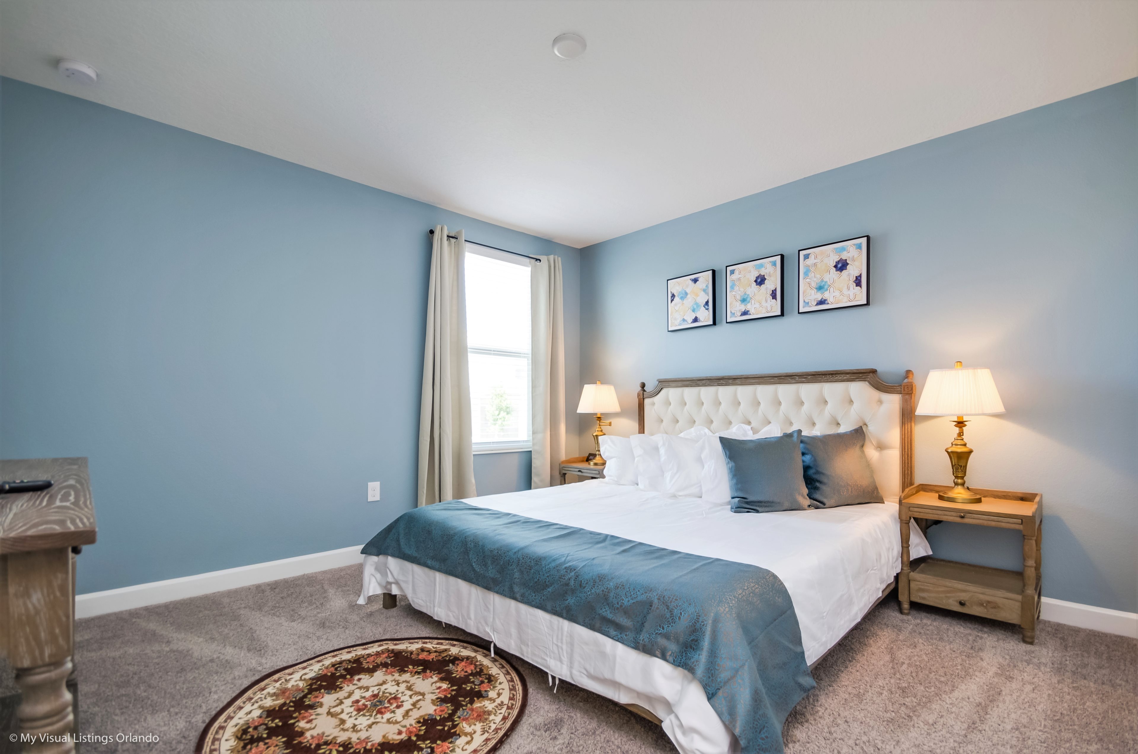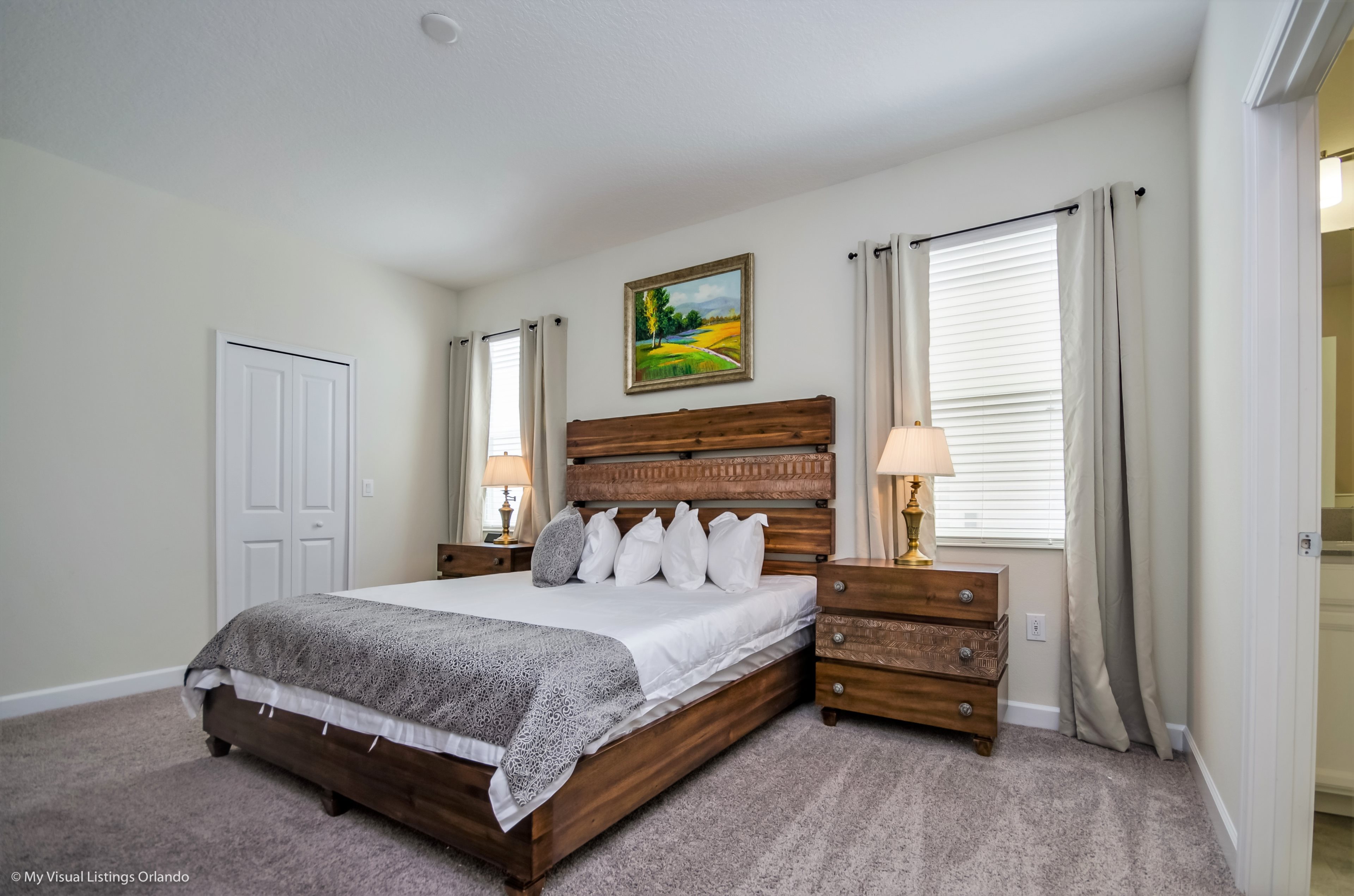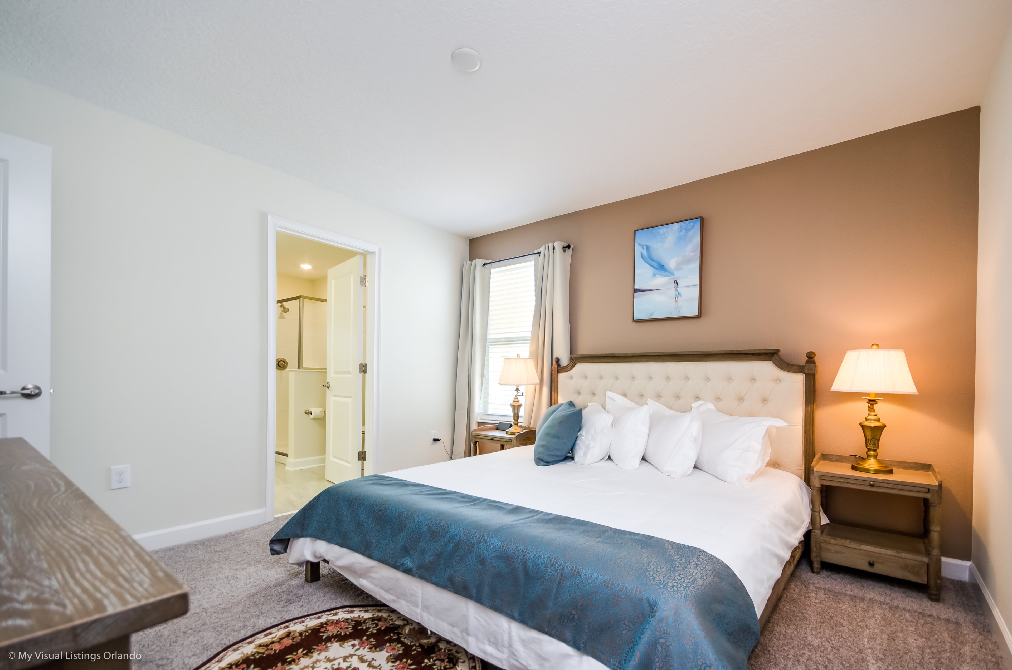 You will feel immediately relaxed as you enter our 8 bedroom, 5 bathroom executive home which sleeps up to 16 in style. We have paid great attention to every detail when we furnished this home and we hope you will enjoy it as much as we do with our own family. With 4 king bedrooms, 2 Queen and 2 Bedrooms with 2 twins beds , there is plenty of room for everyone to spread out and relax after a day out or just to stay in and take it easy. Each room has a different feel so all guests should be equally happy with their room, and all have wall mounted flat screen LED Tv’s. The dining room and living area offers plenty of space to congregate and enjoy meals together, and the bright and airy kitchen has all the appliances that you would expect in your own home. (There is also a full-size washer and dryer). You can also enjoy a game of pool in the game room, or watch a movie in the huge loft area, or leave the kids to play on the PlayStation. Or why not take a dip in the large pool or relax in the spa, even in the evening as the pool area is south facing? This home will bring all the excitement of Orlando to you, and have the entire group talking about your trip for months to come.