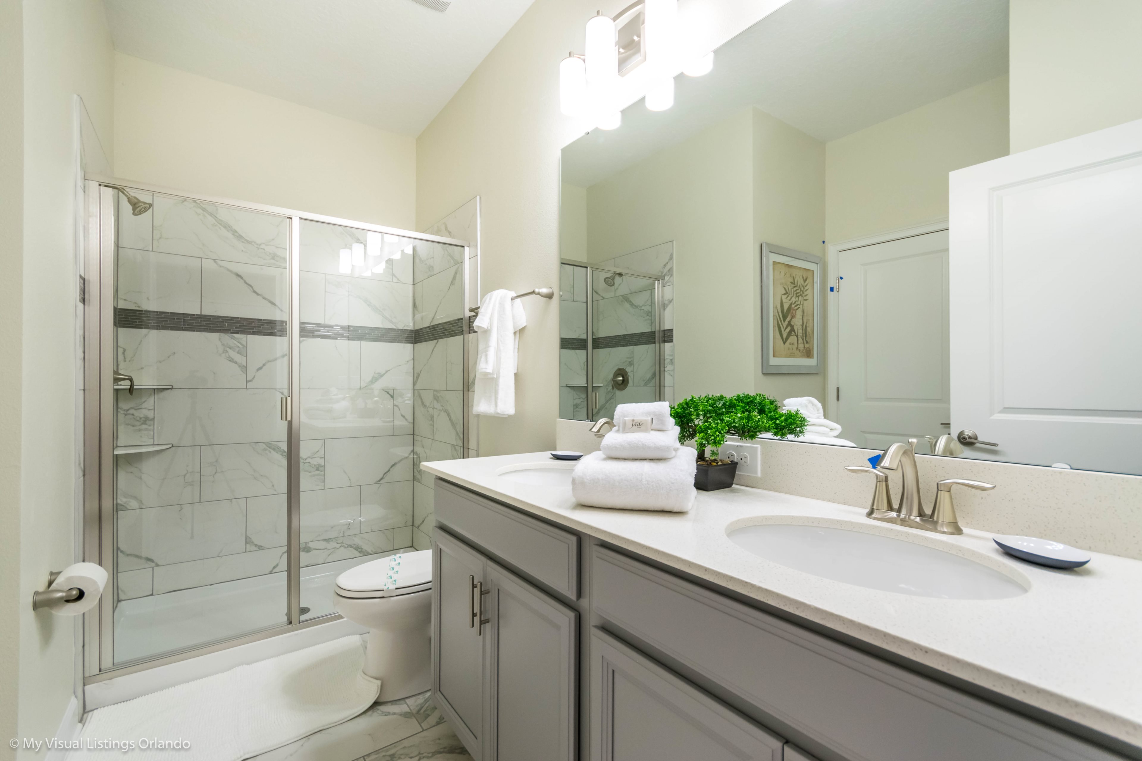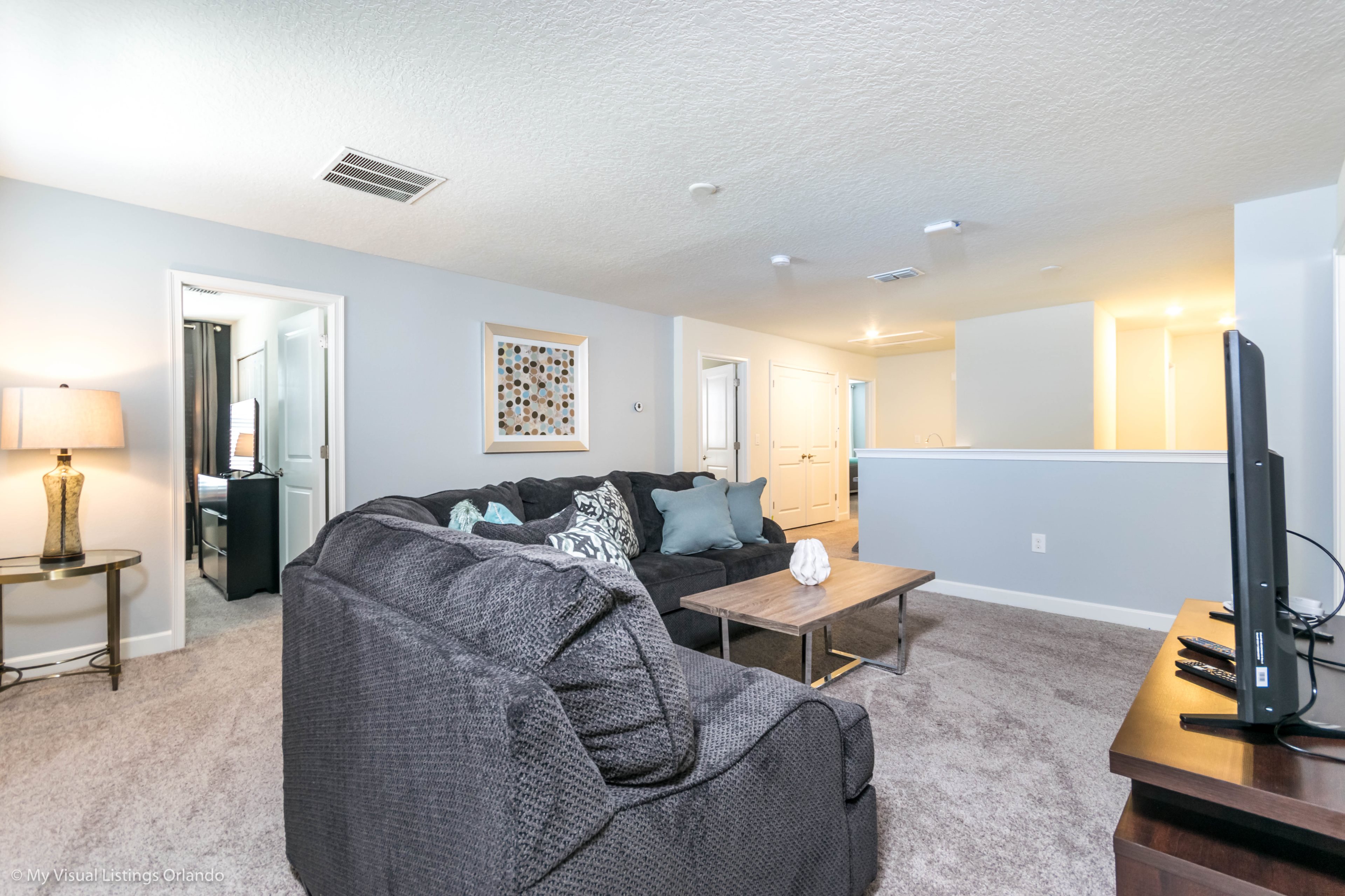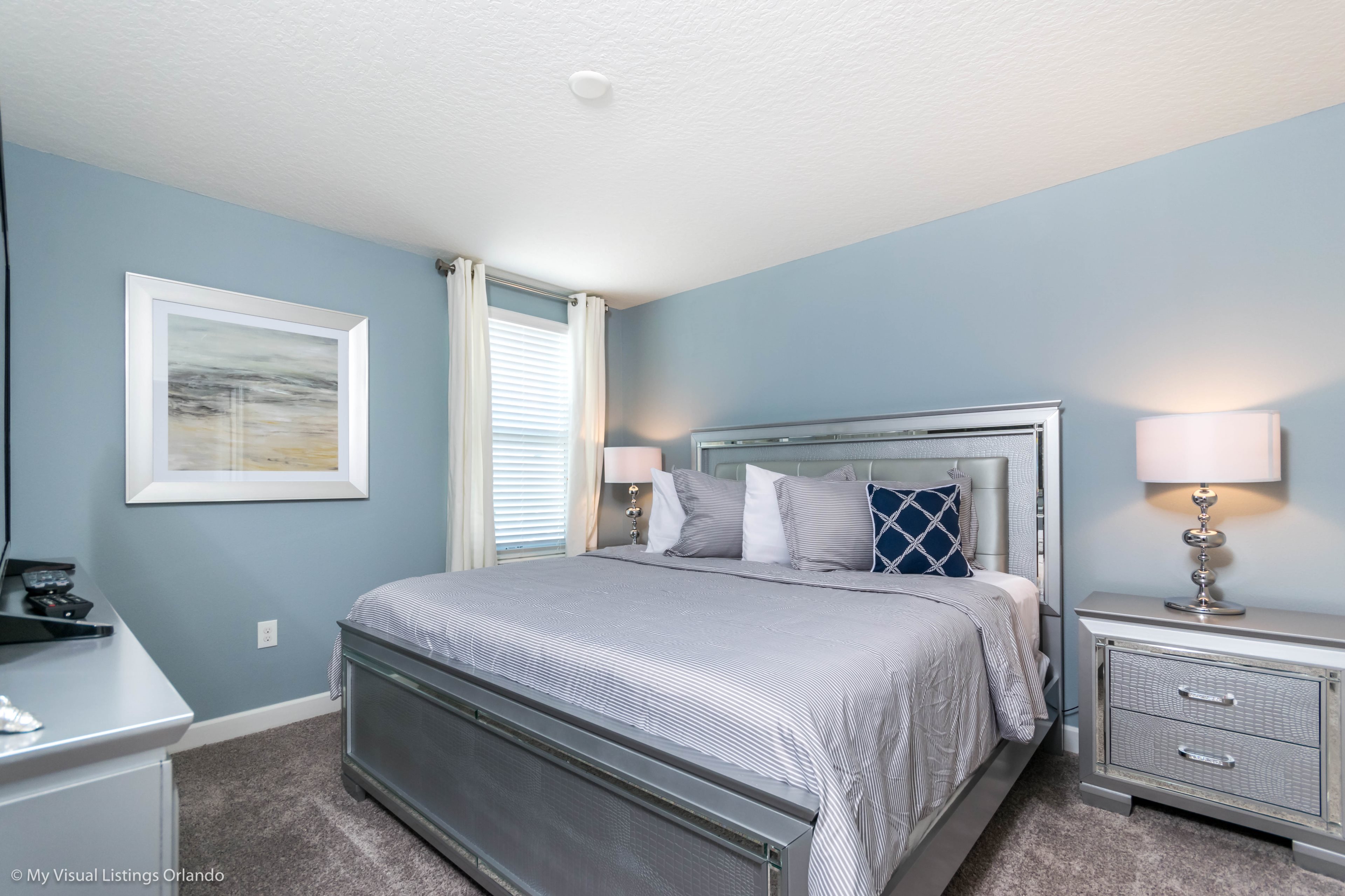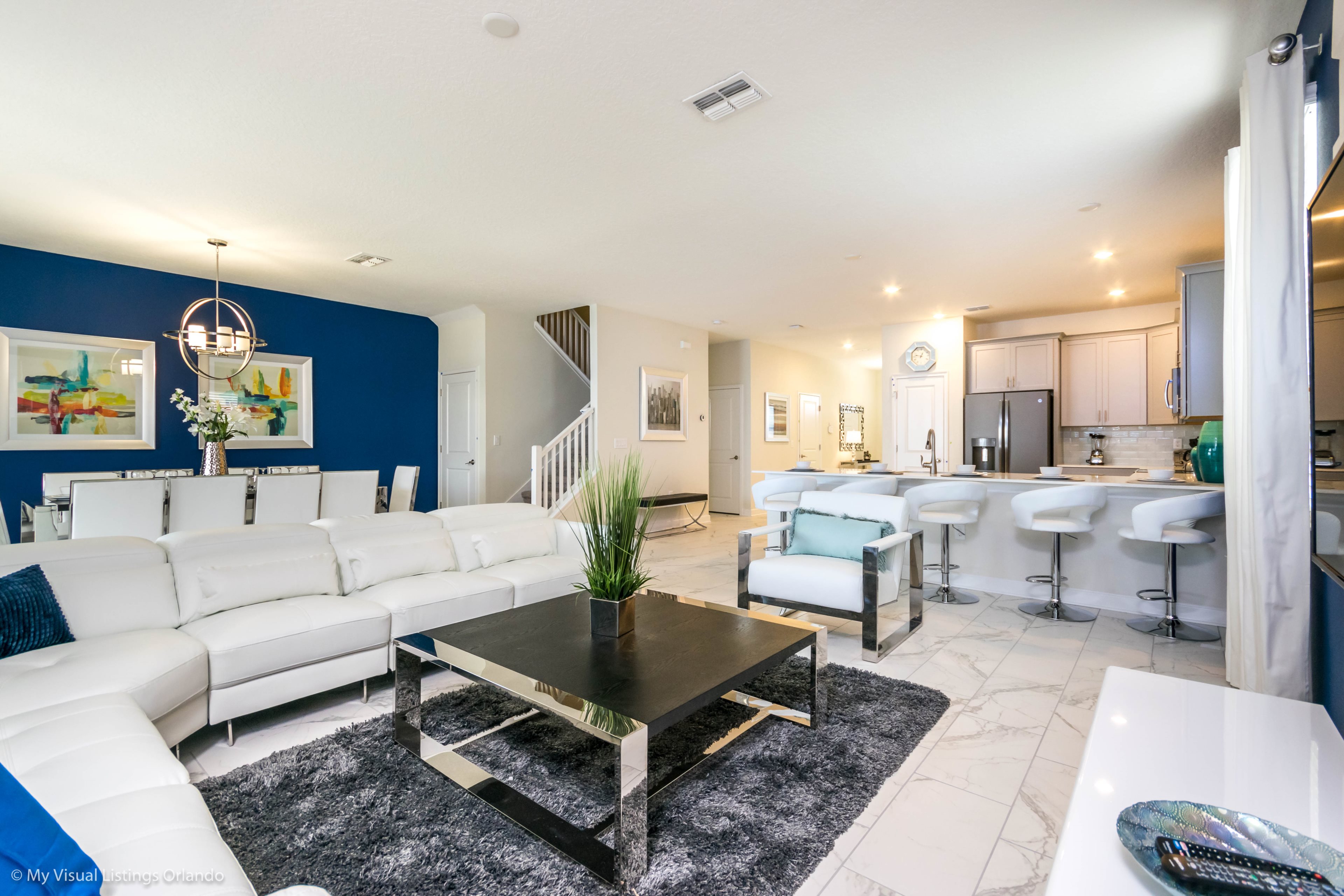 You will feel immediately relaxed as you enter our 8 bedroom, 5 bathroom executive home which sleeps up to 16 in style. We have paid great attention to every detail when we furnished this home and we hope you will enjoy it as much as we do with our own family. With 4 king bedrooms, 2 Queen and 2 Bedrooms with 2 twins beds , there is plenty of room for everyone to spread out and relax after a day out or just to stay in and take it easy. Each room has a different feel so all guests should be equally happy with their room, and all have wall mounted flat screen LED Tv’s. The dining room and living area offers plenty of space to congregate and enjoy meals together, and the bright and airy kitchen has all the appliances that you would expect in your own home. (There is also a full-size washer and dryer). You can also enjoy a game of pool in the game room, or watch a movie in the huge loft area, or leave the kids to play on the PlayStation. Or why not take a dip in the large pool or relax in the spa, even in the evening as the pool area is south facing? This home will bring all the excitement of Orlando to you, and have the entire group talking about your trip for months to come.