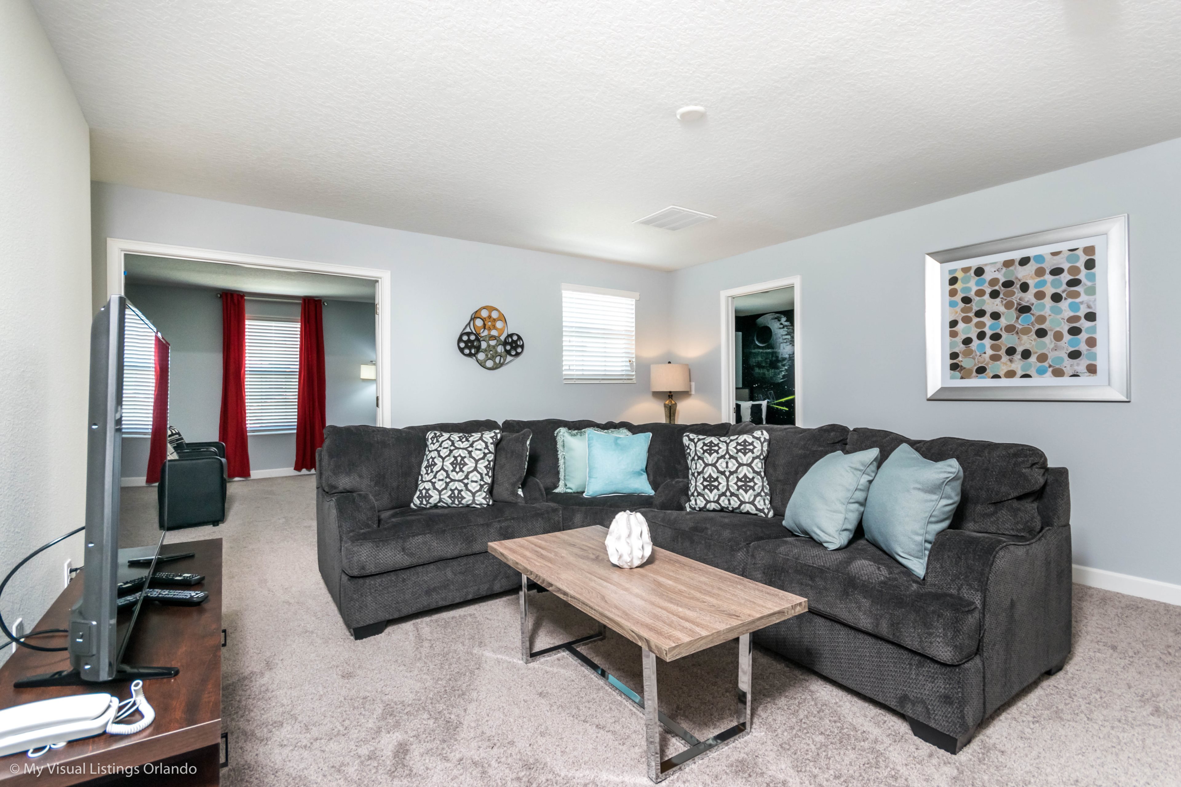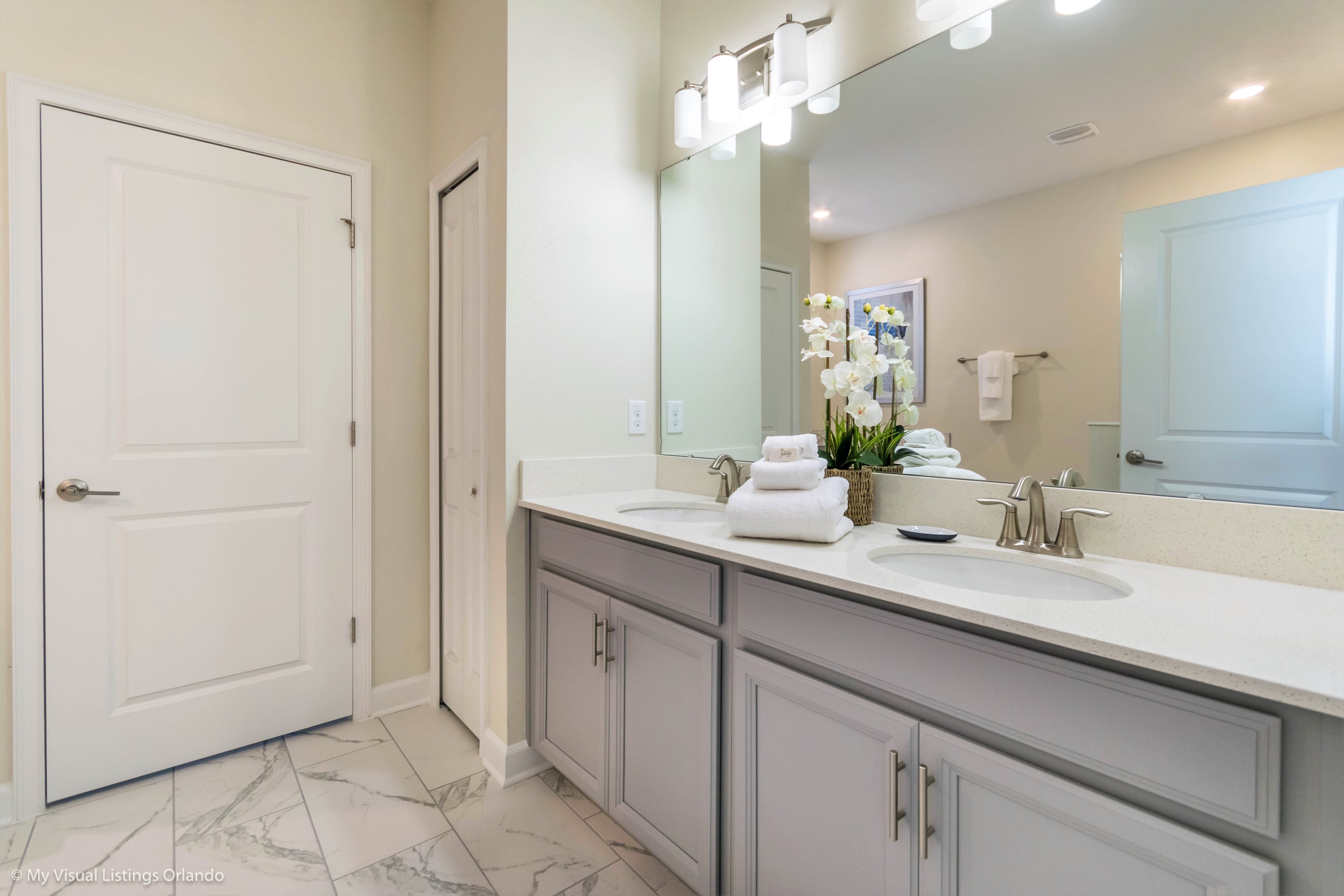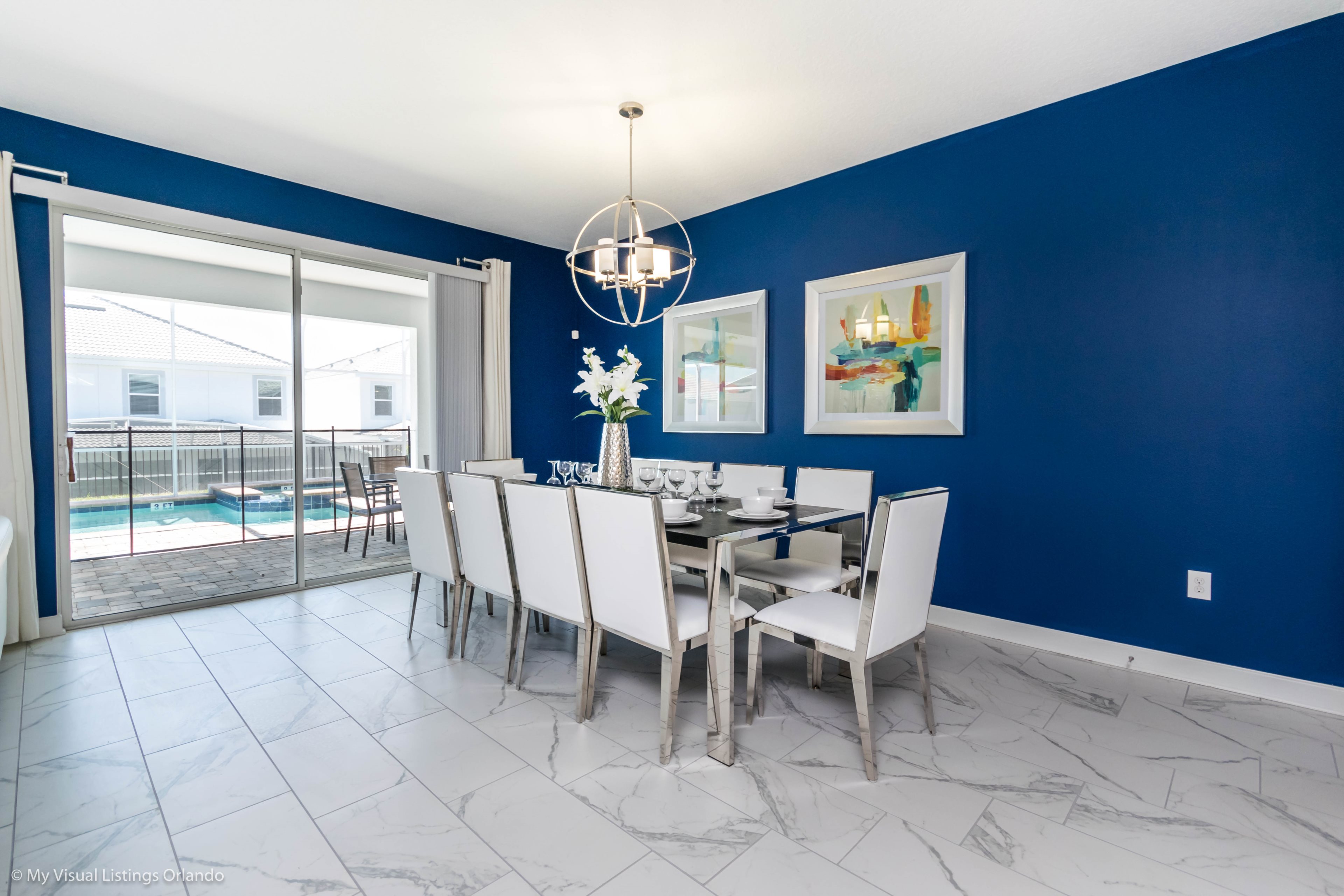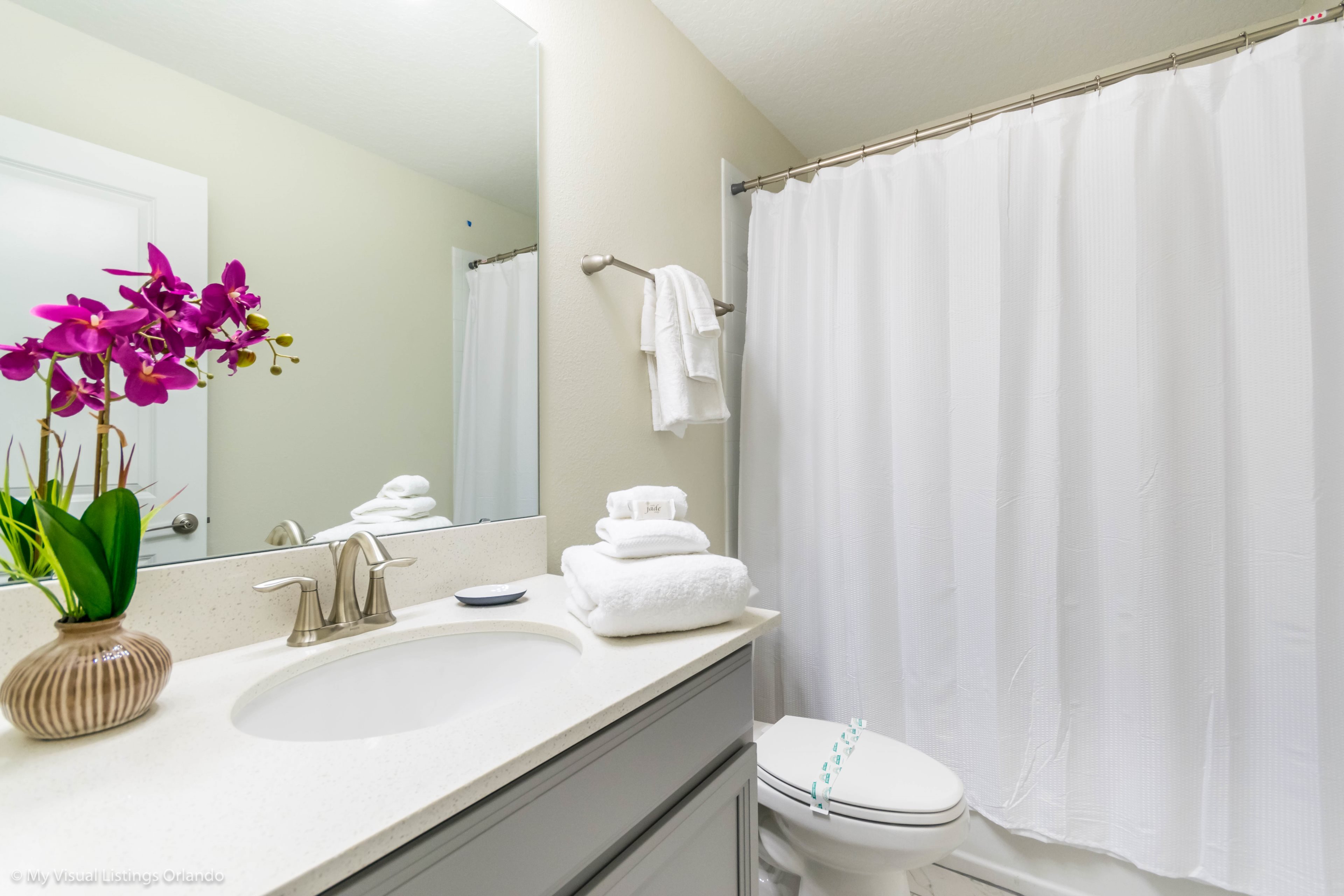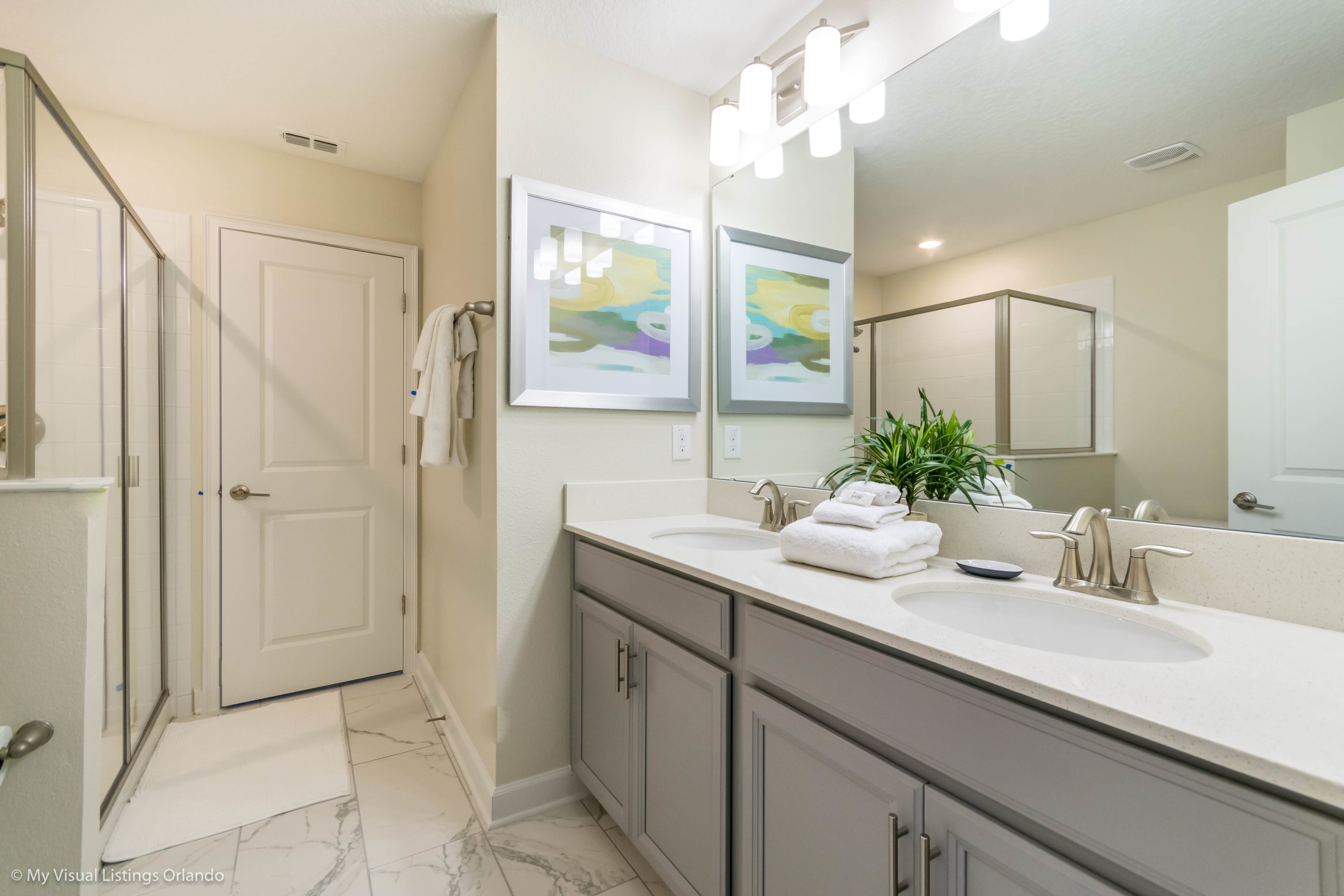You will feel immediately relaxed as you enter our 8 bedroom, 5 bathroom executive home which sleeps up to 16 in style. We have paid great attention to every detail when we furnished this home and we hope you will enjoy it as much as we do with our own family. With 4 king bedrooms, 2 Queen and 2 Bedrooms with 2 twins beds , there is plenty of room for everyone to spread out and relax after a day out or just to stay in and take it easy. Each room has a different feel so all guests should be equally happy with their room, and all have wall mounted flat screen LED Tv’s. The dining room and living area offers plenty of space to congregate and enjoy meals together, and the bright and airy kitchen has all the appliances that you would expect in your own home. (There is also a full-size washer and dryer). You can also enjoy a game of pool in the game room, or watch a movie in the huge loft area, or leave the kids to play on the PlayStation. Or why not take a dip in the large pool or relax in the spa, even in the evening as the pool area is south facing? This home will bring all the excitement of Orlando to you, and have the entire group talking about your trip for months to come.