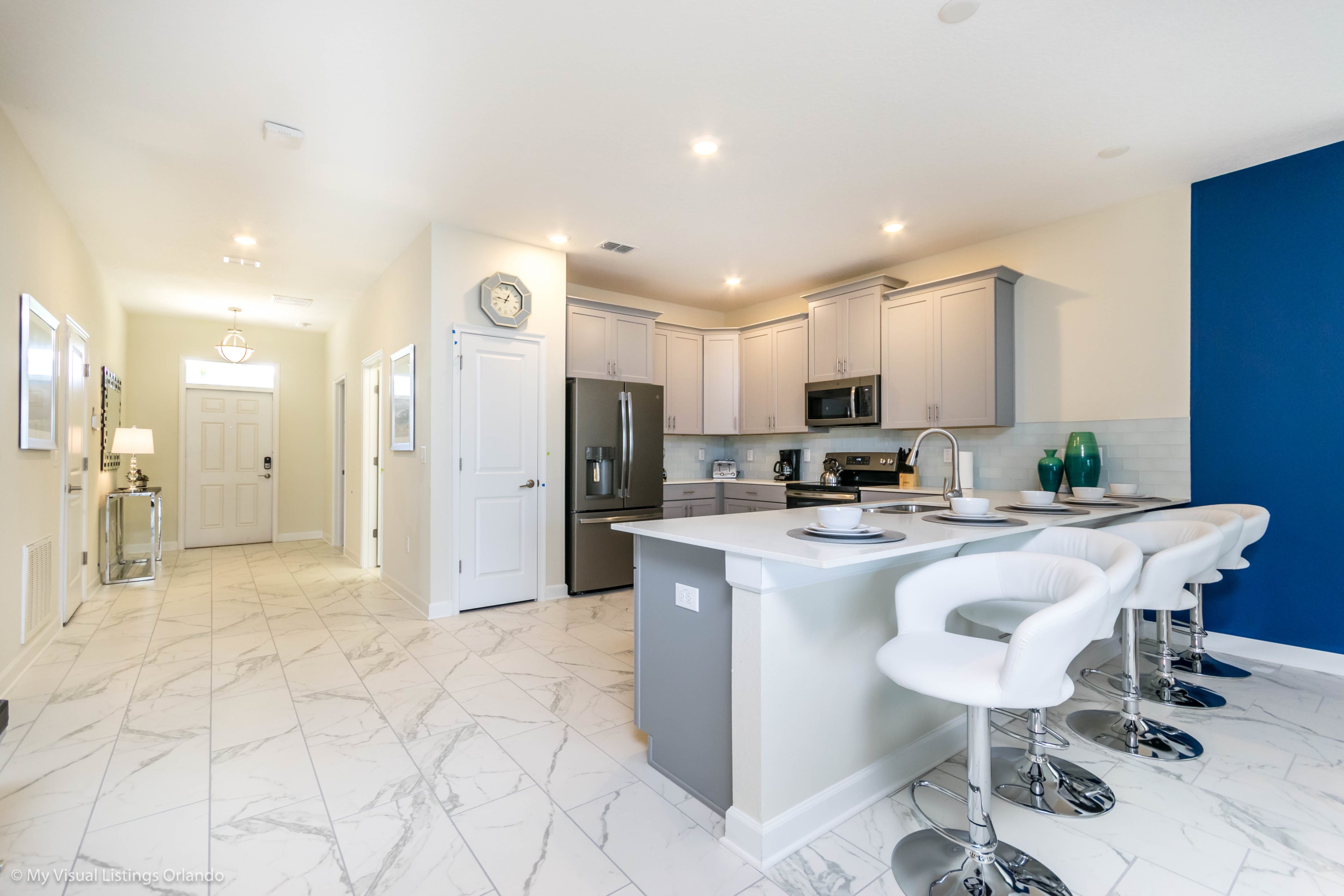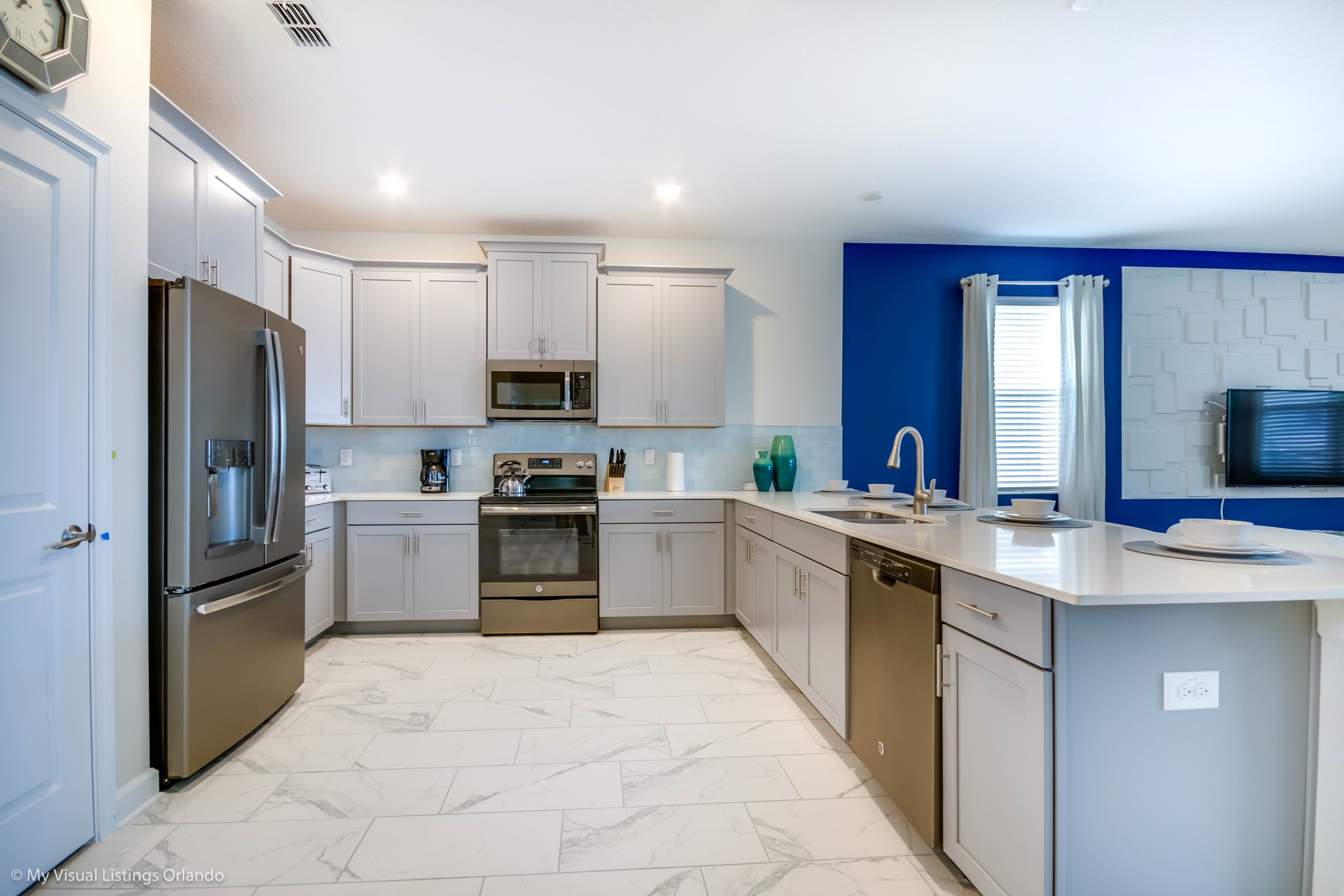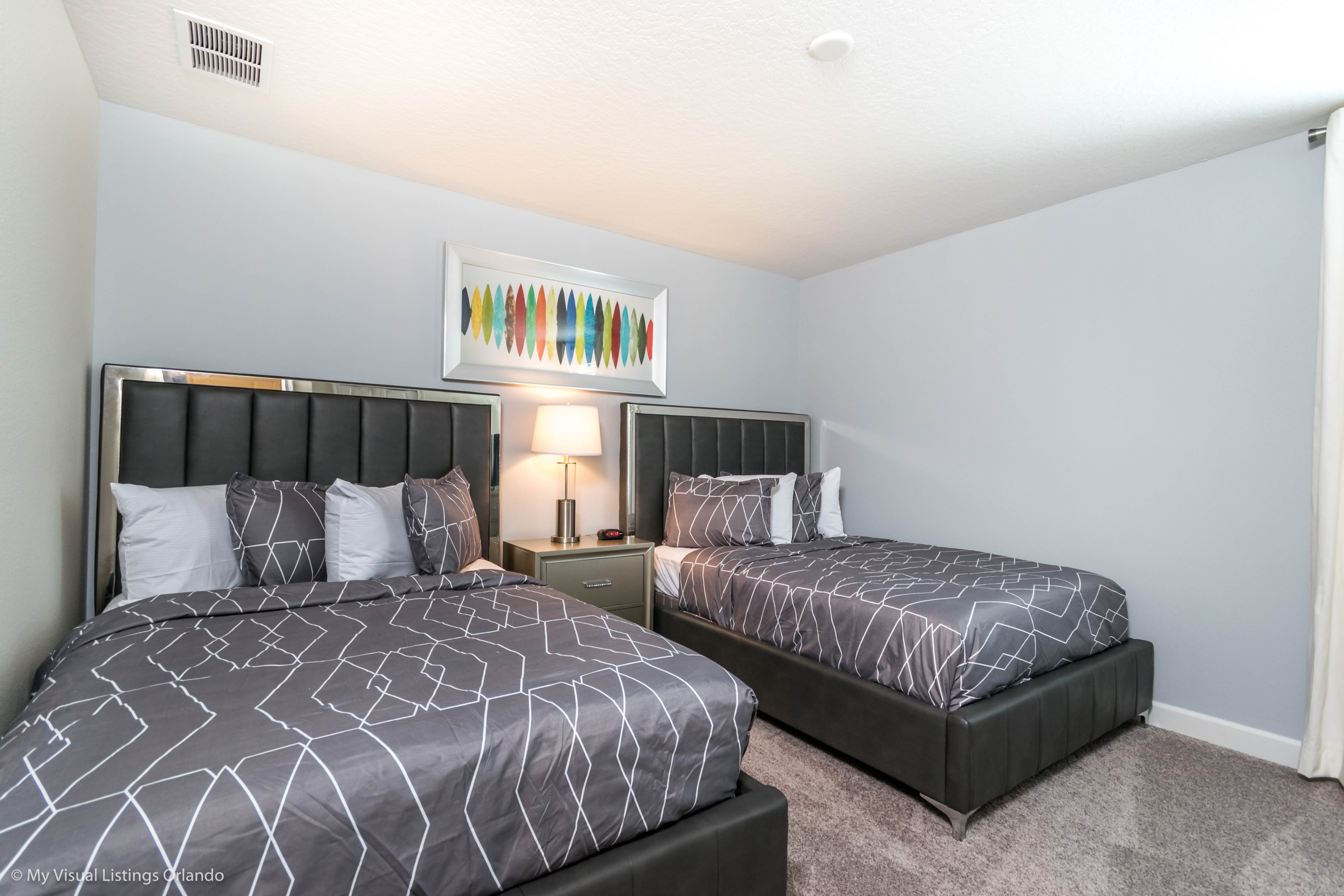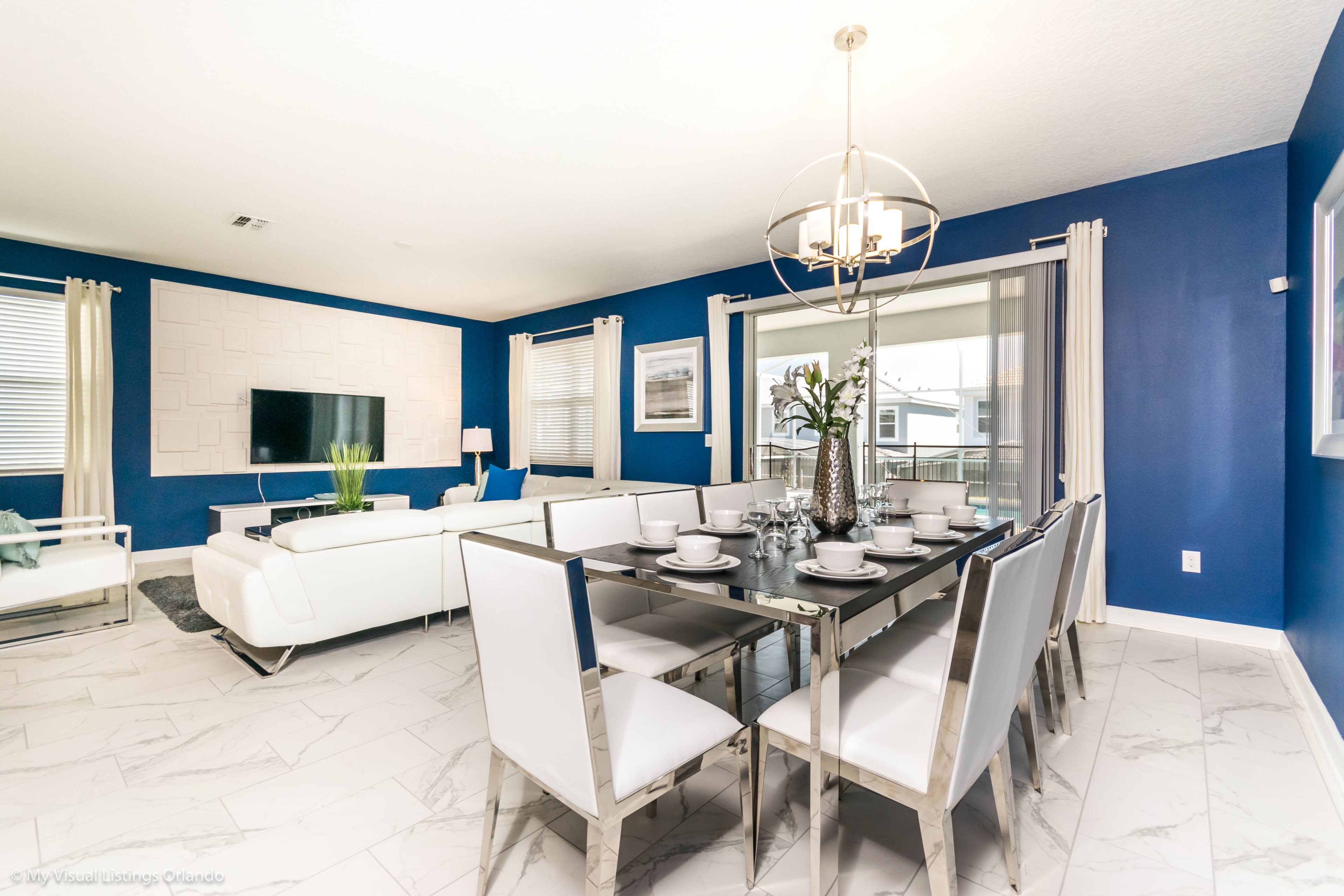 You will feel immediately relaxed as you enter our 8 bedroom, 5 bathroom executive home which sleeps up to 16 in style. We have paid great attention to every detail when we furnished this home and we hope you will enjoy it as much as we do with our own family. With 4 king bedrooms, 2 Queen and 2 Bedrooms with 2 twins beds , there is plenty of room for everyone to spread out and relax after a day out or just to stay in and take it easy. Each room has a different feel so all guests should be equally happy with their room, and all have wall mounted flat screen LED Tv’s. The dining room and living area offers plenty of space to congregate and enjoy meals together, and the bright and airy kitchen has all the appliances that you would expect in your own home. (There is also a full-size washer and dryer). You can also enjoy a game of pool in the game room, or watch a movie in the huge loft area, or leave the kids to play on the PlayStation. Or why not take a dip in the large pool or relax in the spa, even in the evening as the pool area is south facing? This home will bring all the excitement of Orlando to you, and have the entire group talking about your trip for months to come.