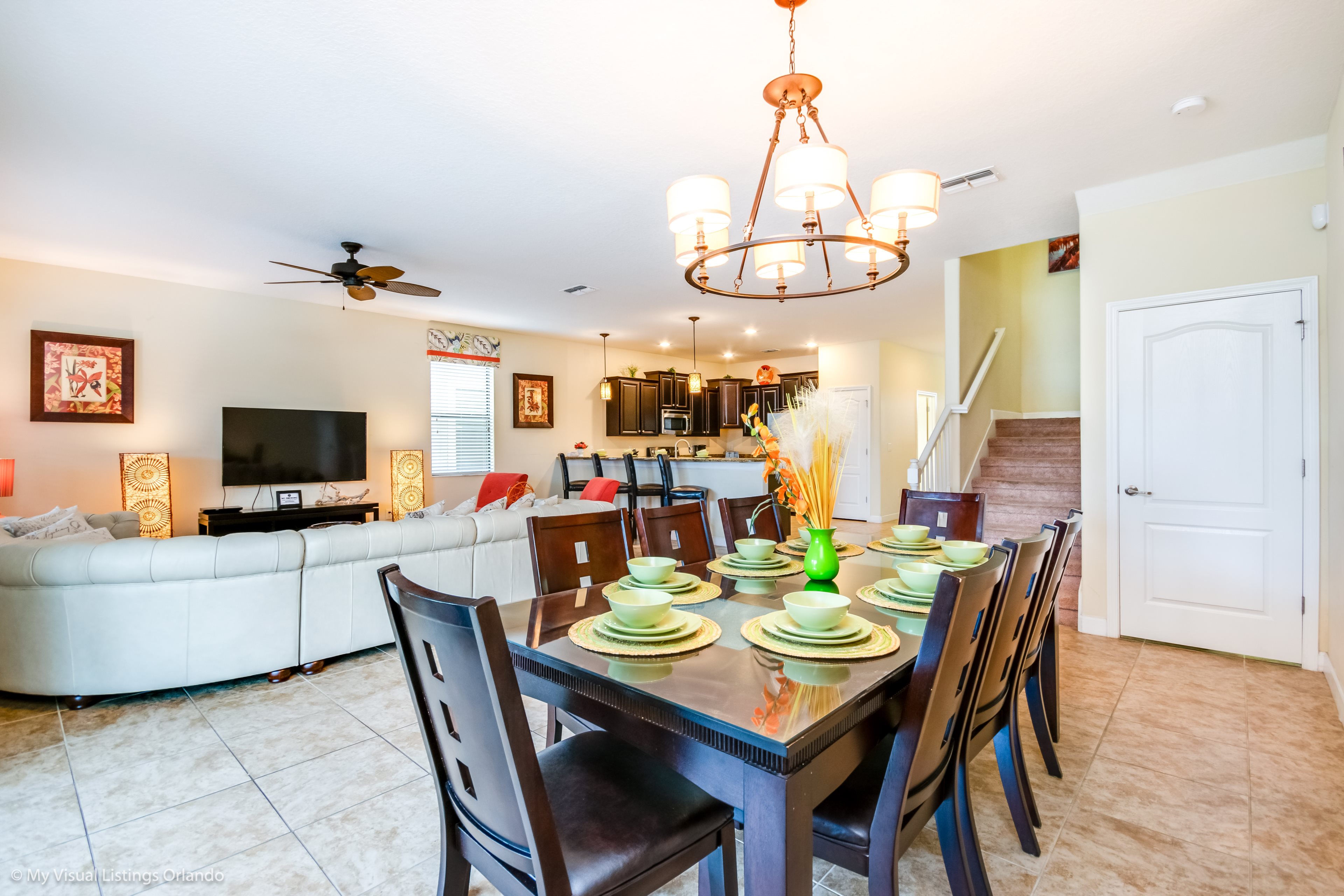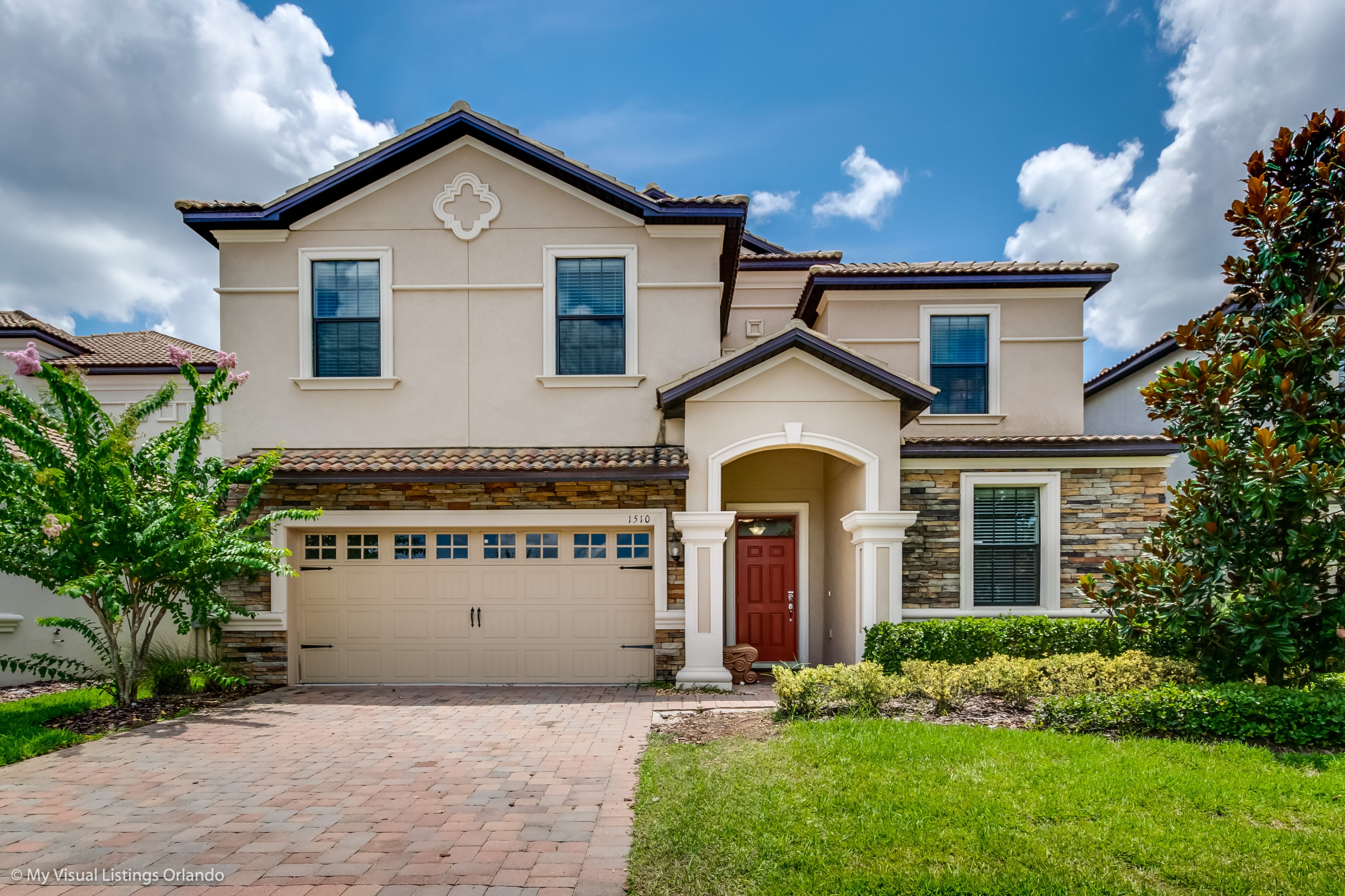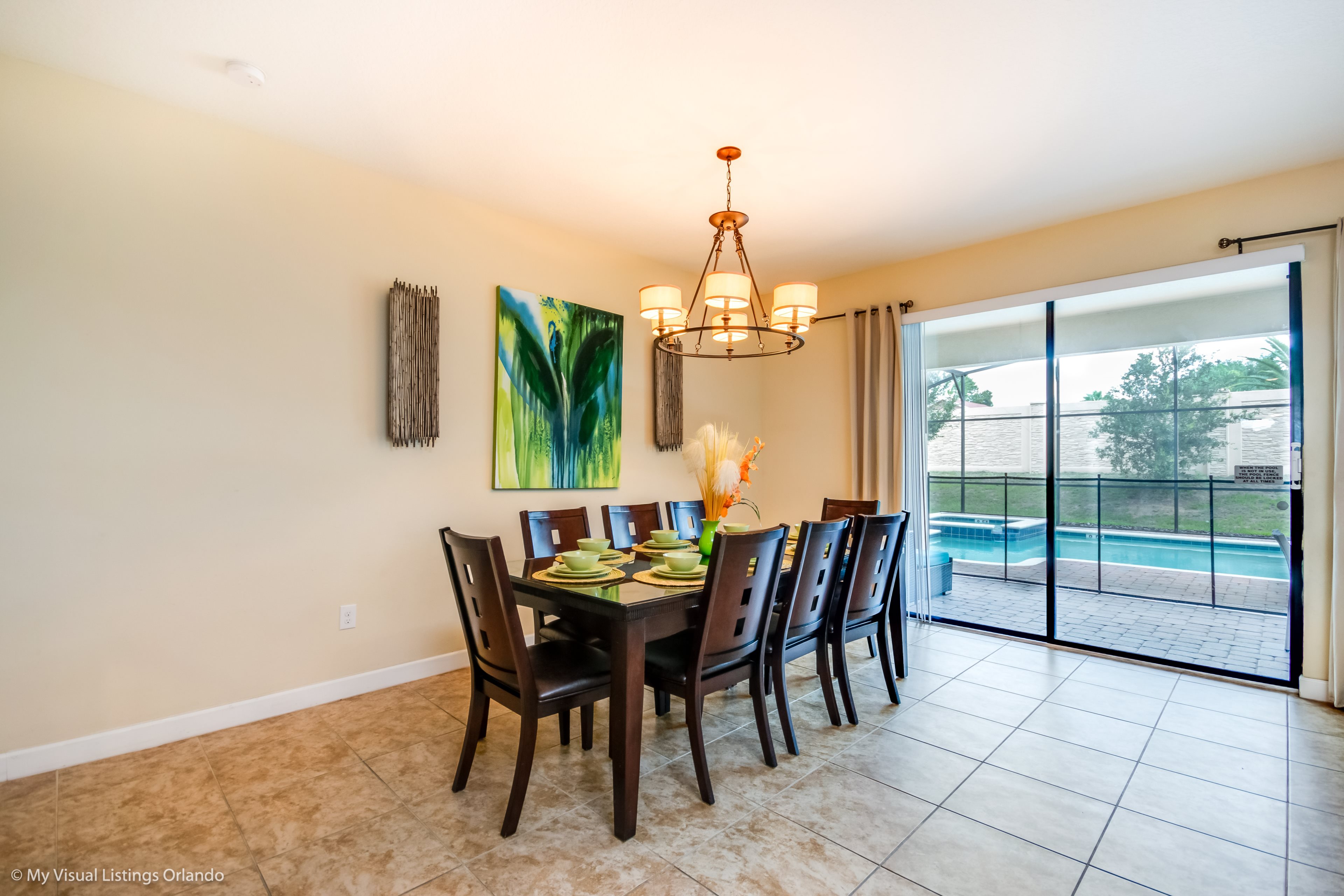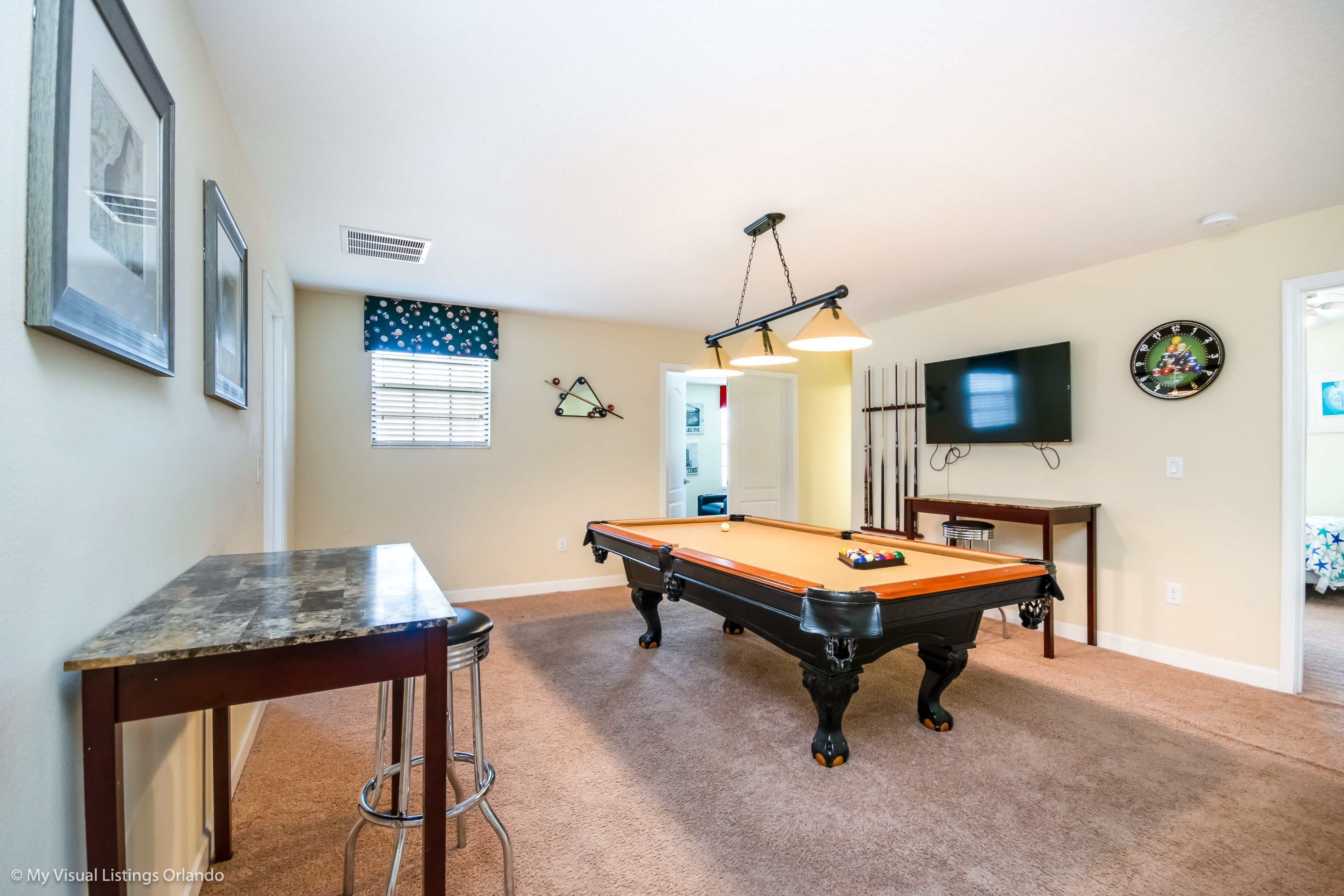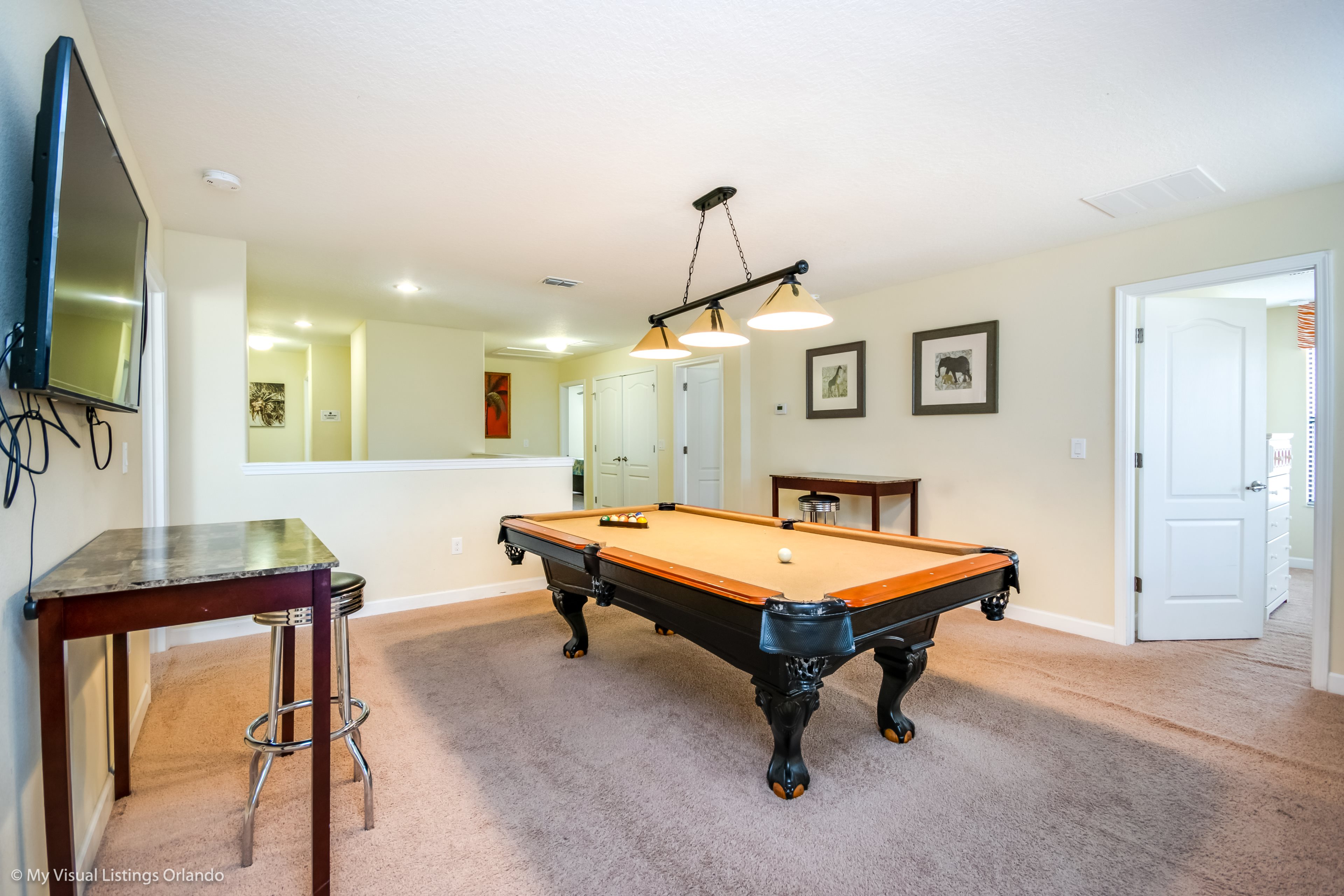 You will feel immediately relaxed as you enter our 8 bedroom, 5 bathroom executive home which sleeps up to 18 in style. We have paid great attention to every detail when we furnished this home and we hope you will enjoy it as much as we do with our own family. With 2 king bedrooms, 3 queen bedroom, 1 Room with two full beds and 2 room with 2 twins , there is plenty of room for everyone to spread out and relax after a day out or just to stay in and take it easy. Each room has a different feel so all guests should be equally happy with their room, and all have wall mounted flat screen LED Tv’s. The dining room and living area offers plenty of space to congregate and enjoy meals together, and the bright and airy kitchen has all the appliances that you would expect in your own home. (There is also a full-size washer and dryer). You can also enjoy a game of pool in the game room, or watch a movie in the huge loft area, or leave the kids to play on the PlayStation. Or why not take a dip in the large pool or relax in the spa, even in the evening as the pool area is south facing? This home will bring all the excitement of Orlando to you, and have the entire group talking about your trip for months to come.