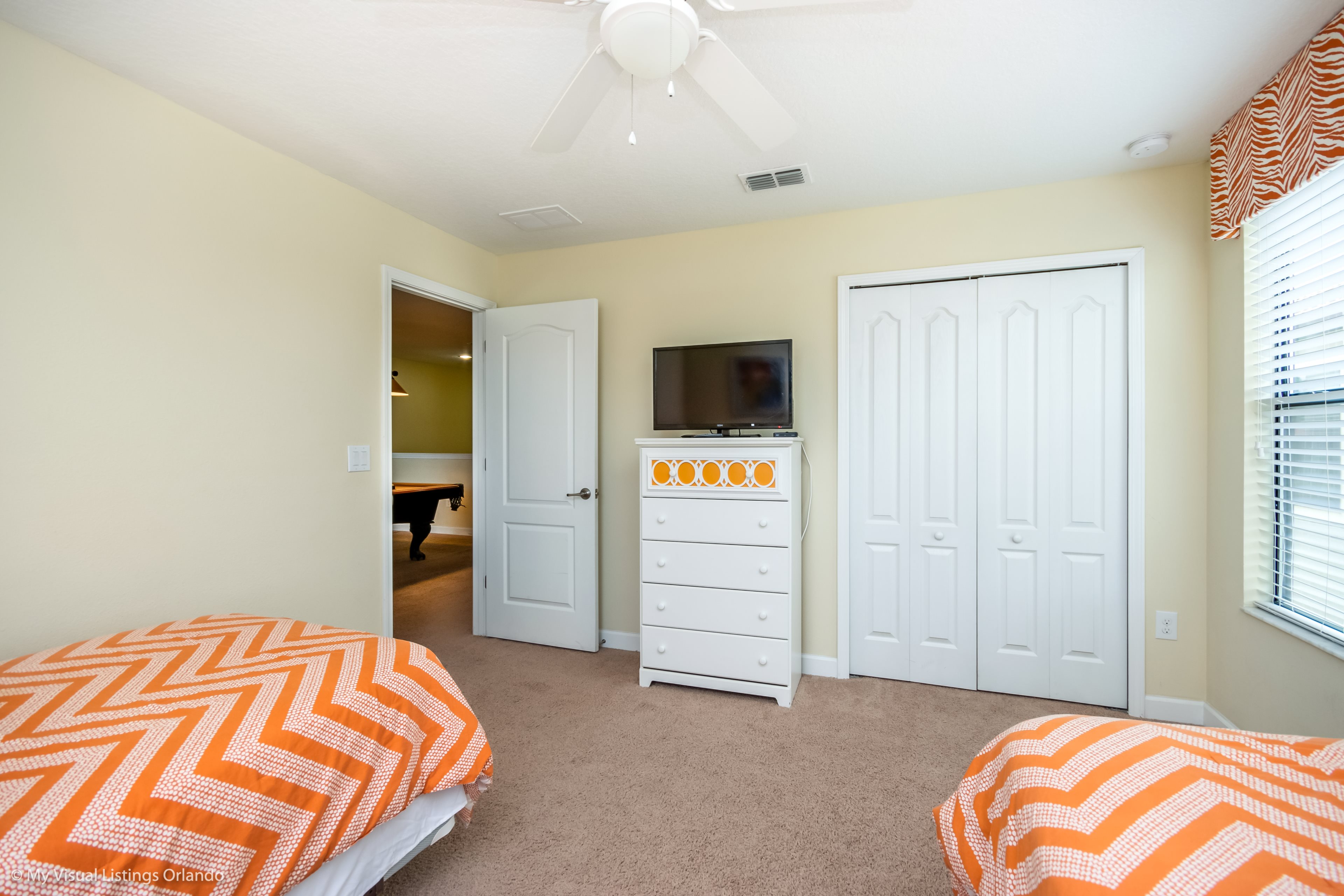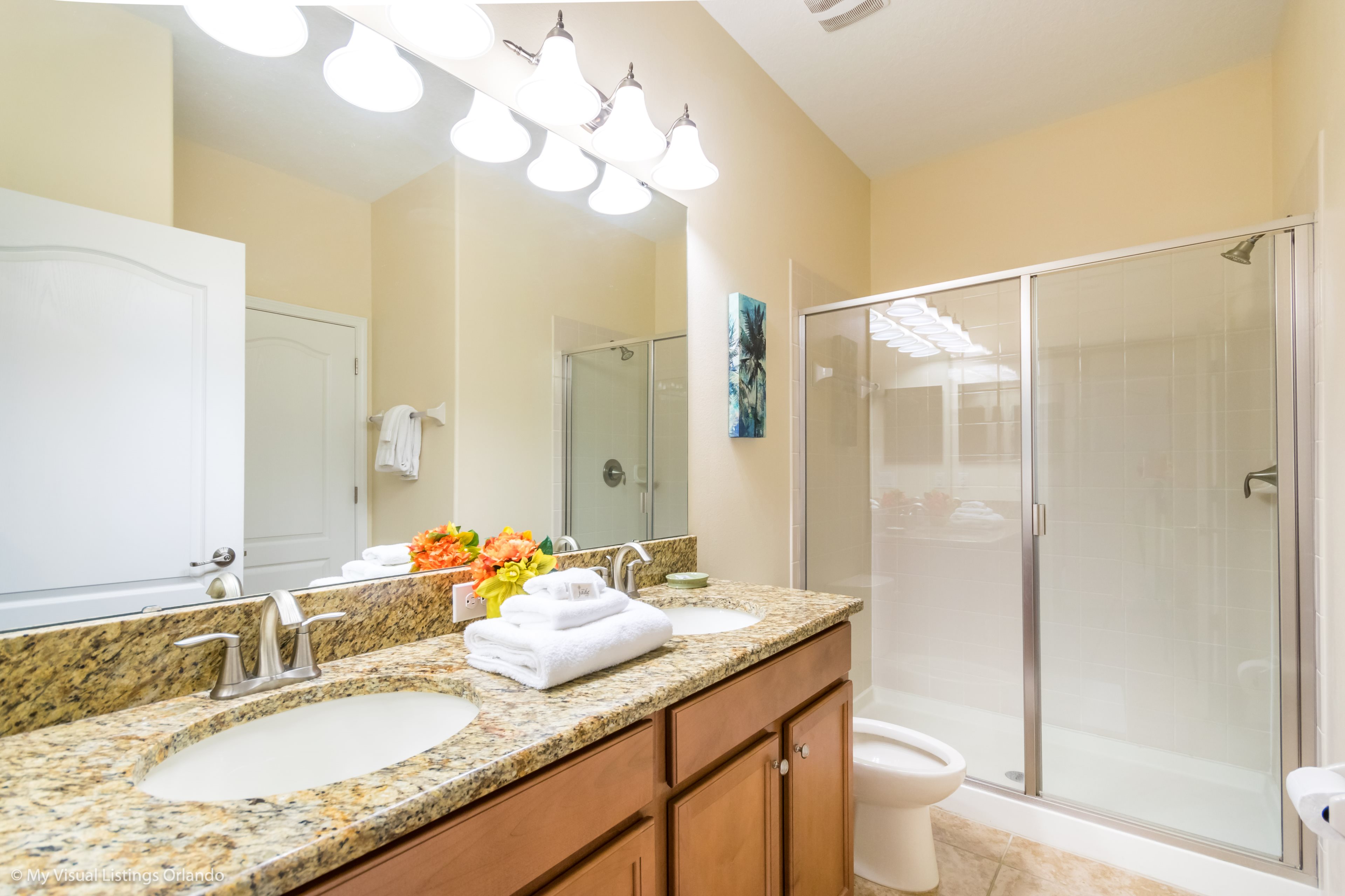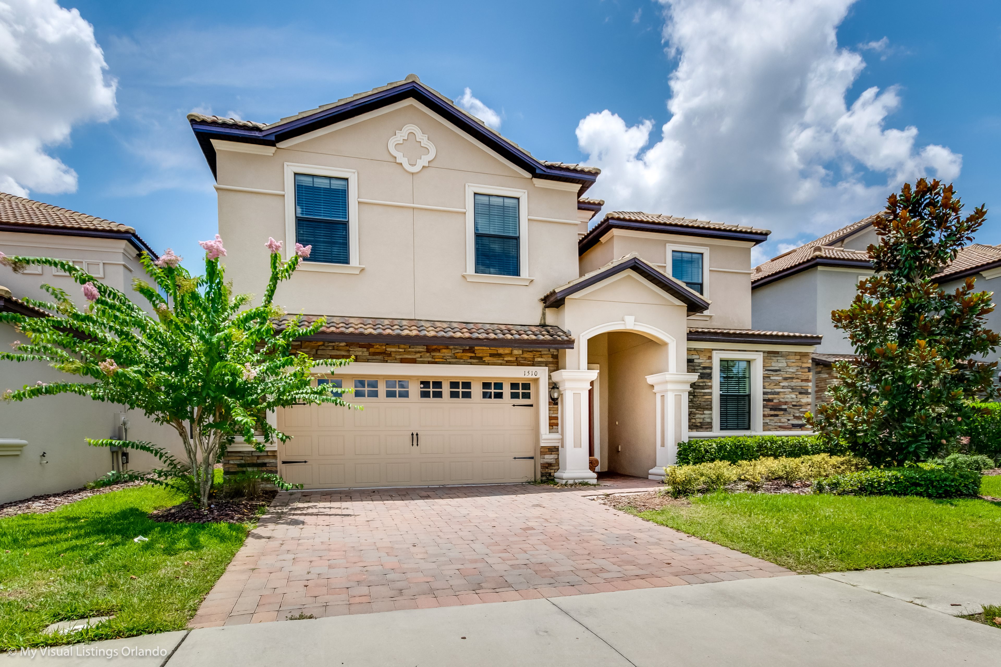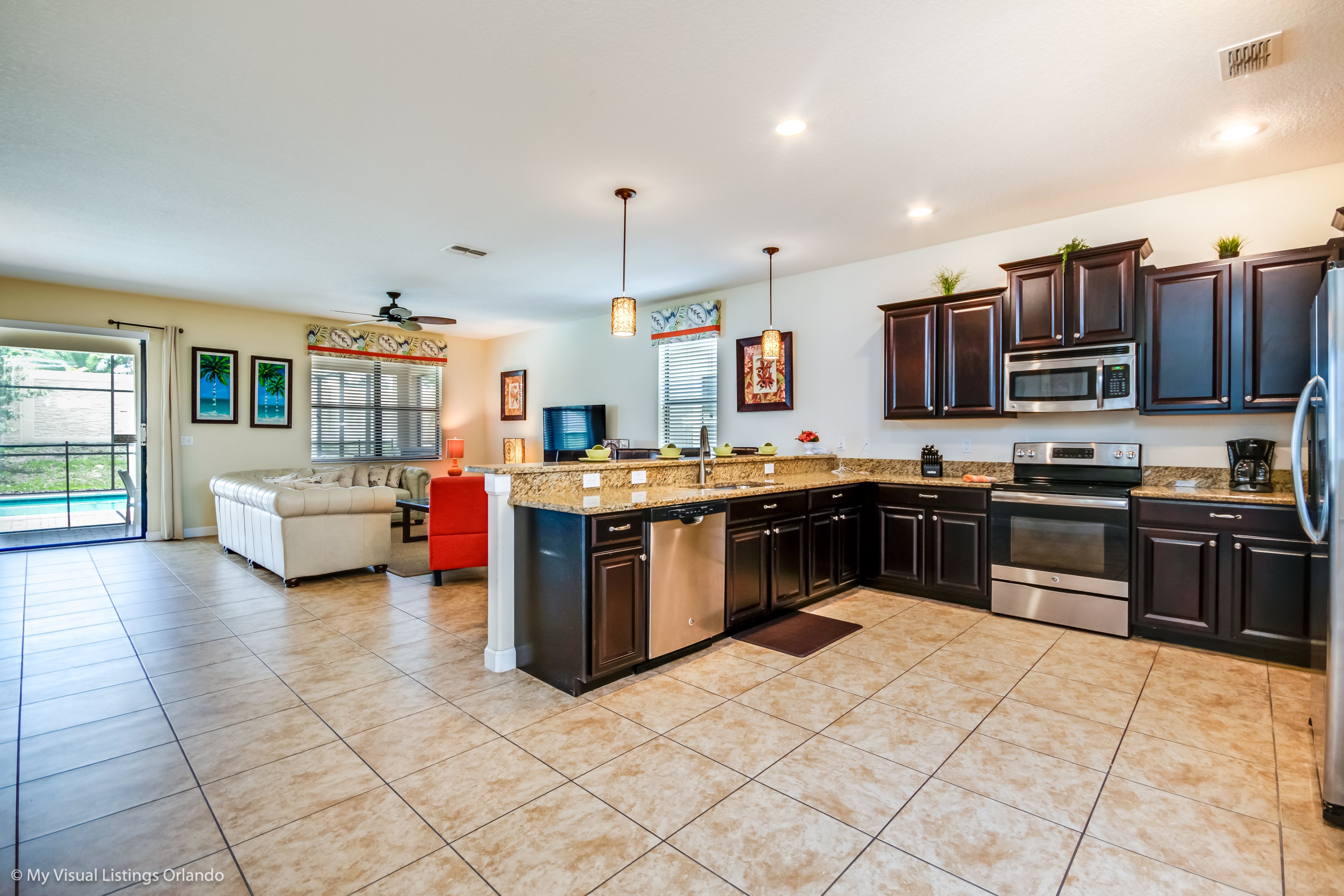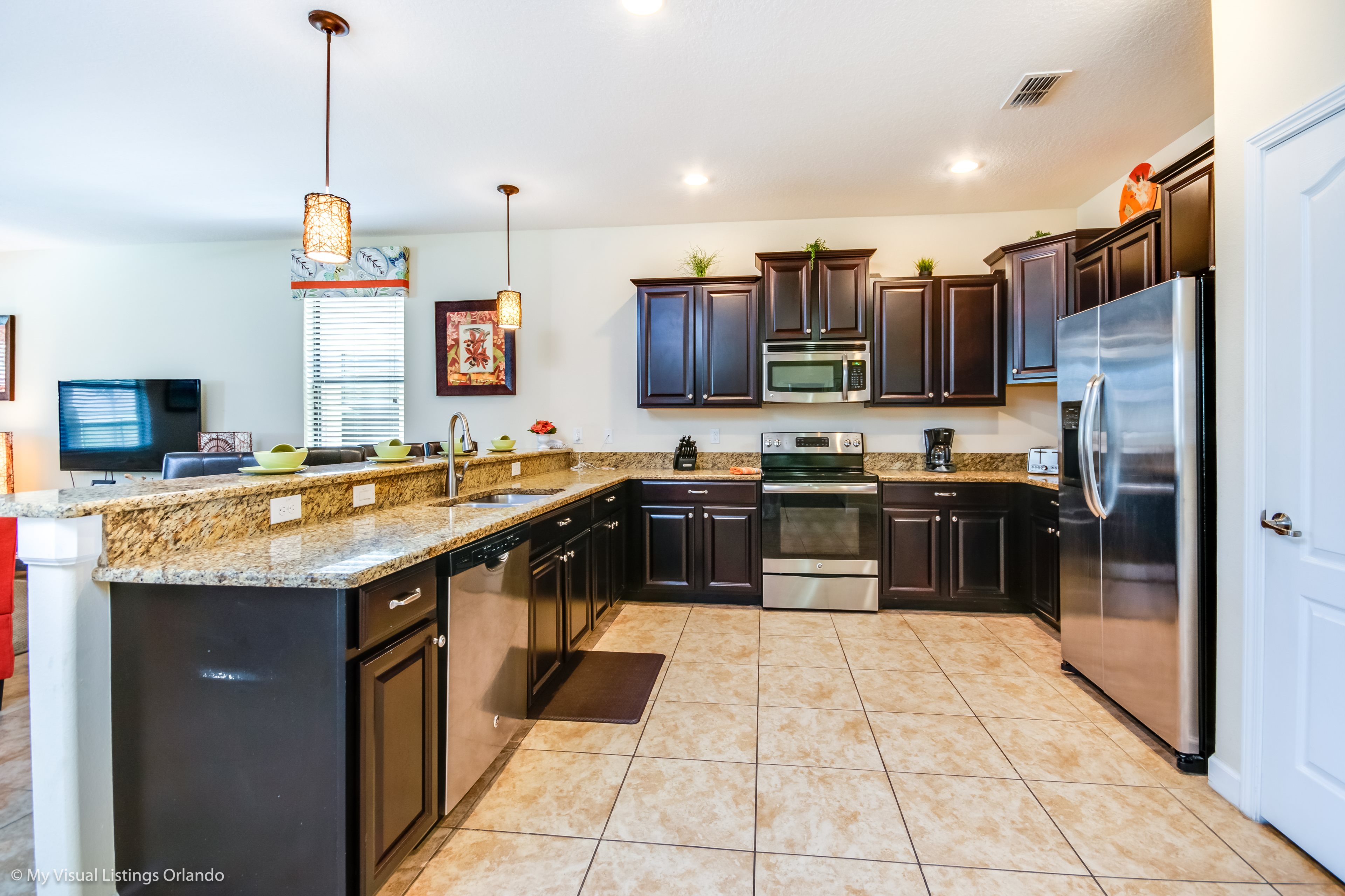 You will feel immediately relaxed as you enter our 8 bedroom, 5 bathroom executive home which sleeps up to 18 in style. We have paid great attention to every detail when we furnished this home and we hope you will enjoy it as much as we do with our own family. With 2 king bedrooms, 3 queen bedroom, 1 Room with two full beds and 2 room with 2 twins , there is plenty of room for everyone to spread out and relax after a day out or just to stay in and take it easy. Each room has a different feel so all guests should be equally happy with their room, and all have wall mounted flat screen LED Tv’s. The dining room and living area offers plenty of space to congregate and enjoy meals together, and the bright and airy kitchen has all the appliances that you would expect in your own home. (There is also a full-size washer and dryer). You can also enjoy a game of pool in the game room, or watch a movie in the huge loft area, or leave the kids to play on the PlayStation. Or why not take a dip in the large pool or relax in the spa, even in the evening as the pool area is south facing? This home will bring all the excitement of Orlando to you, and have the entire group talking about your trip for months to come.