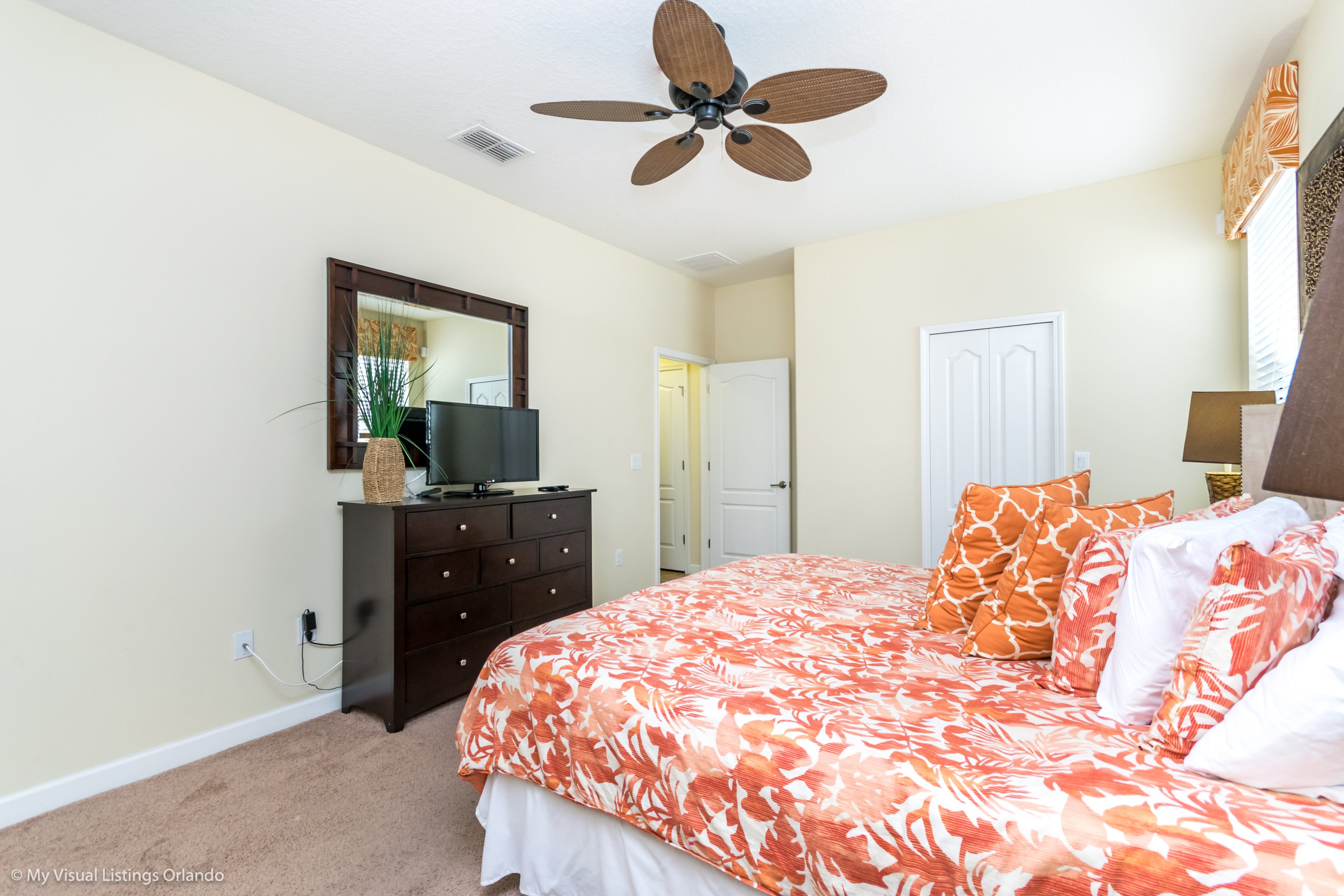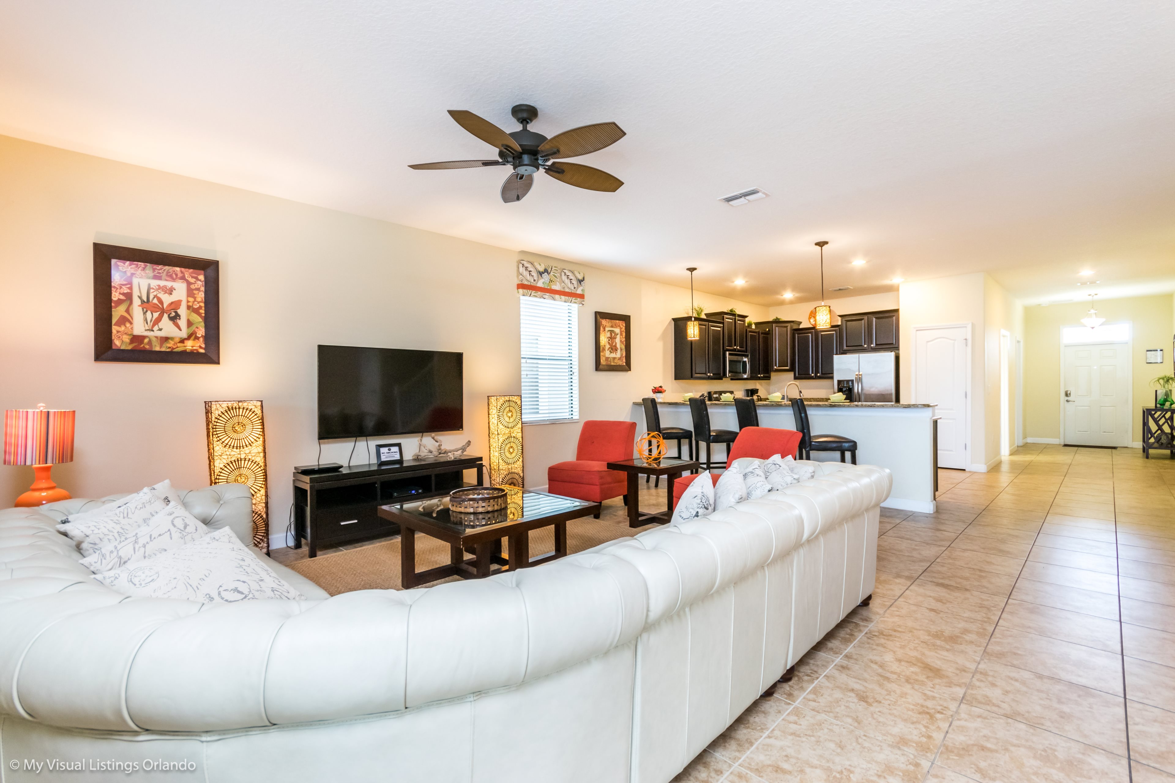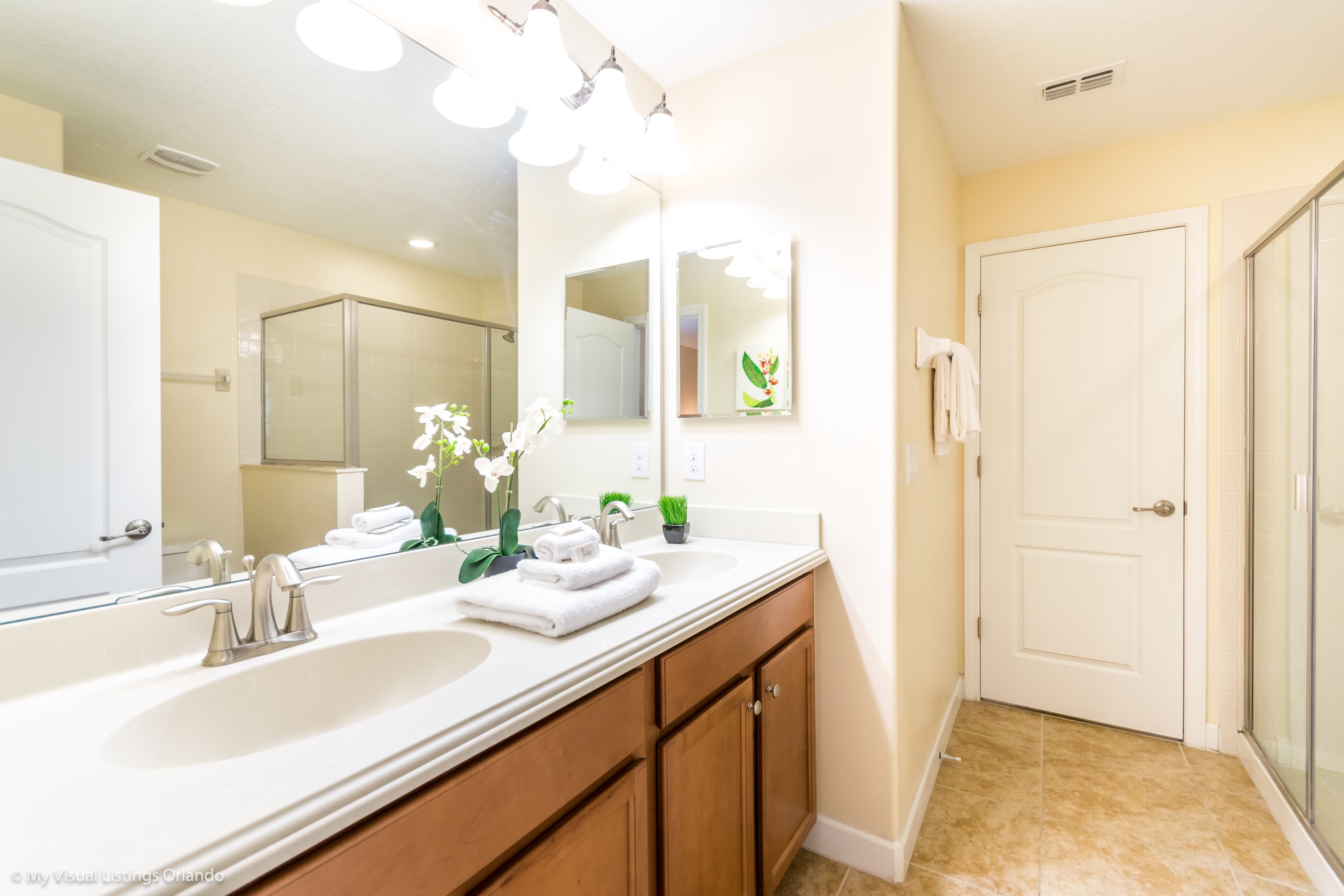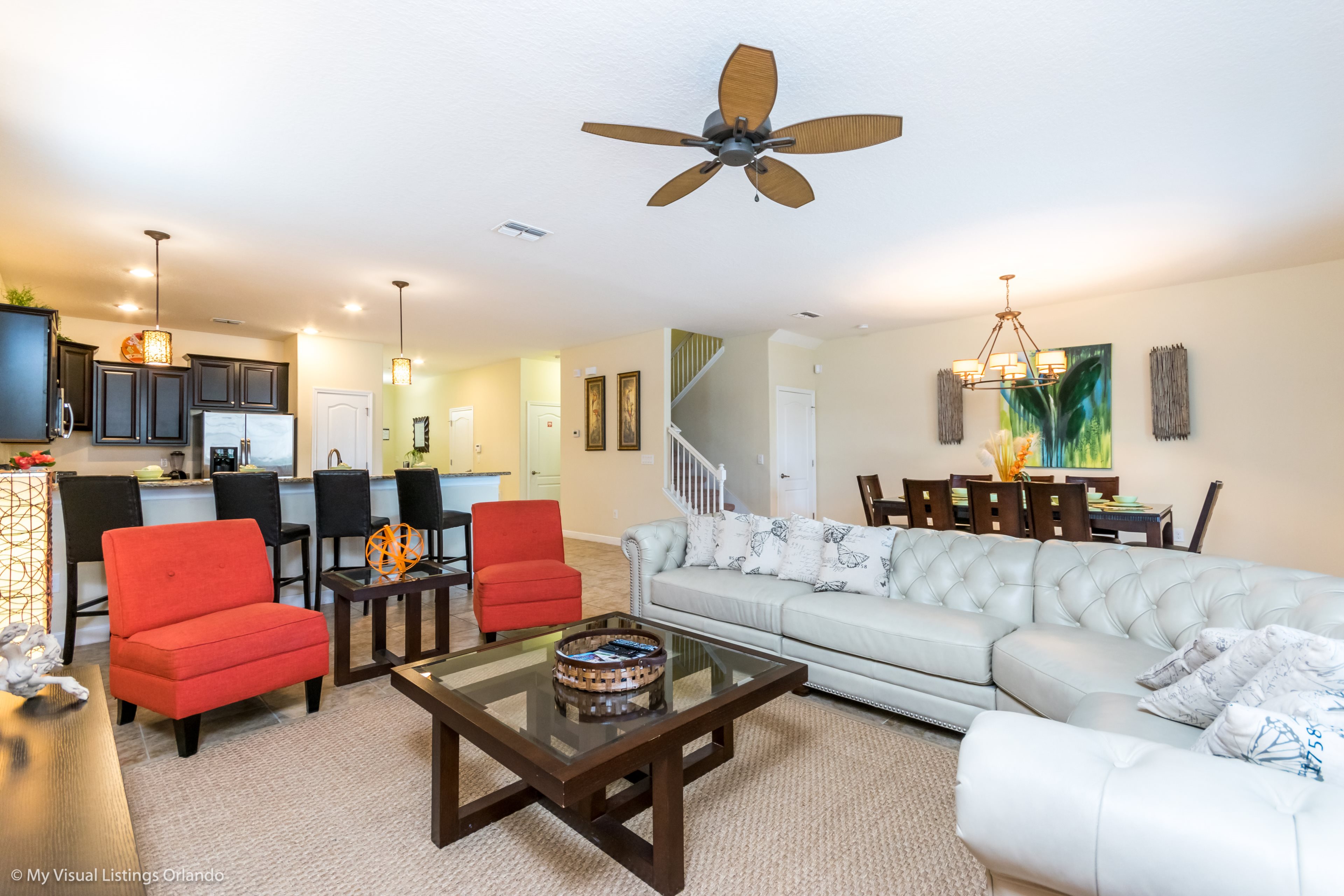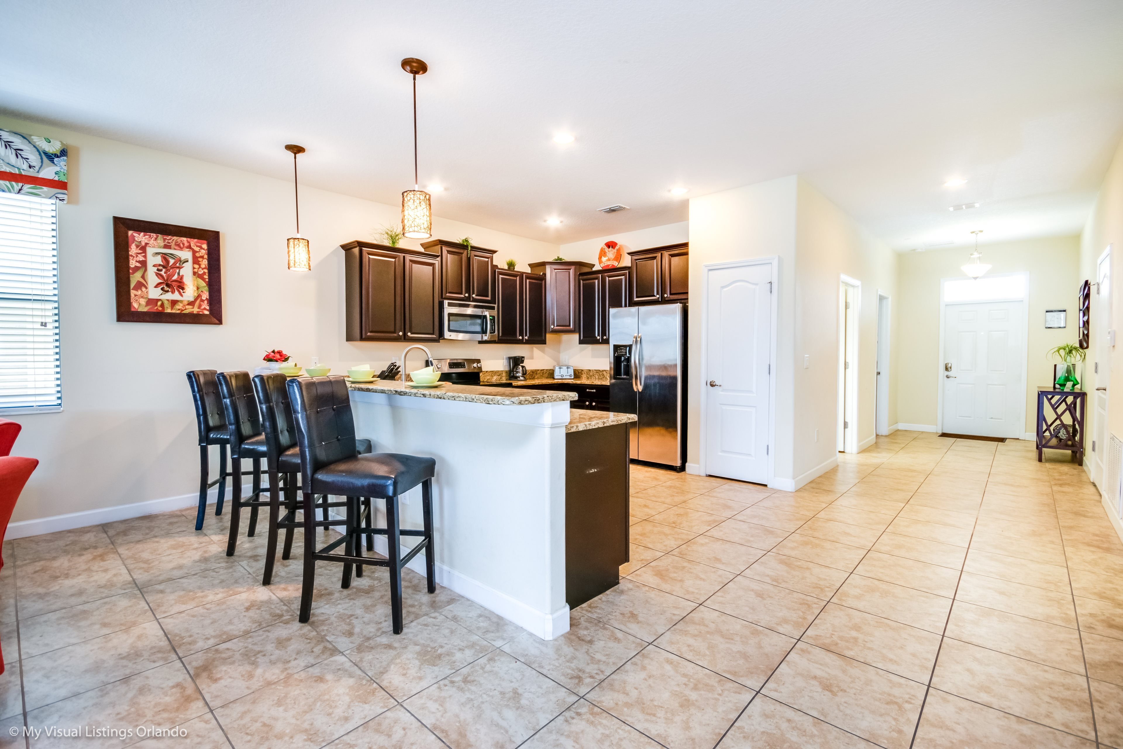 You will feel immediately relaxed as you enter our 8 bedroom, 5 bathroom executive home which sleeps up to 18 in style. We have paid great attention to every detail when we furnished this home and we hope you will enjoy it as much as we do with our own family. With 2 king bedrooms, 3 queen bedroom, 1 Room with two full beds and 2 room with 2 twins , there is plenty of room for everyone to spread out and relax after a day out or just to stay in and take it easy. Each room has a different feel so all guests should be equally happy with their room, and all have wall mounted flat screen LED Tv’s. The dining room and living area offers plenty of space to congregate and enjoy meals together, and the bright and airy kitchen has all the appliances that you would expect in your own home. (There is also a full-size washer and dryer). You can also enjoy a game of pool in the game room, or watch a movie in the huge loft area, or leave the kids to play on the PlayStation. Or why not take a dip in the large pool or relax in the spa, even in the evening as the pool area is south facing? This home will bring all the excitement of Orlando to you, and have the entire group talking about your trip for months to come.