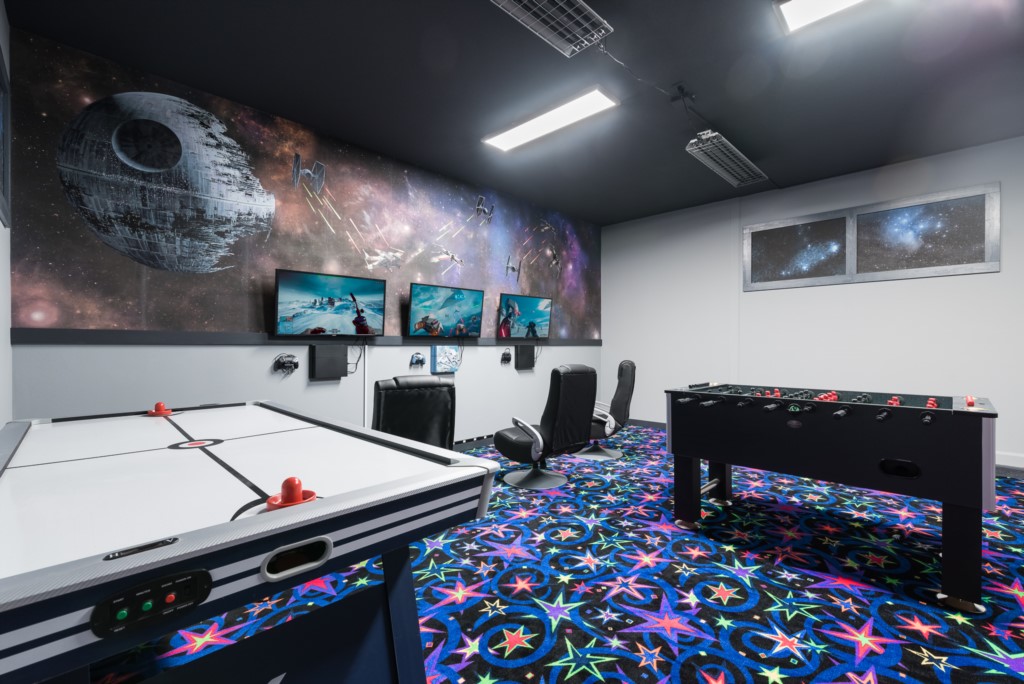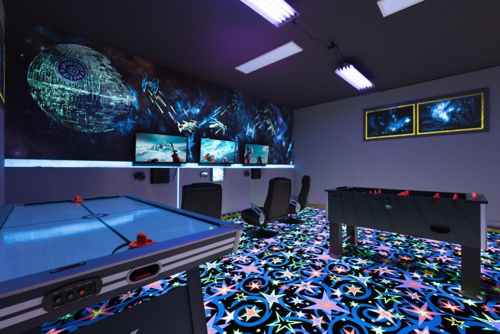 'Star Wars' themed games room PS4 video game consoles, air hockey and foosball table, black light