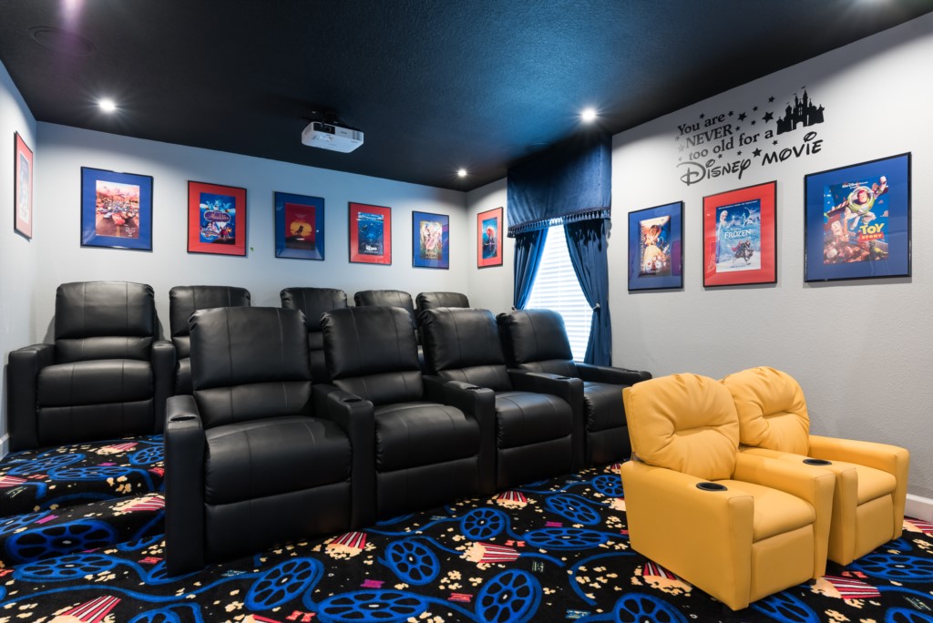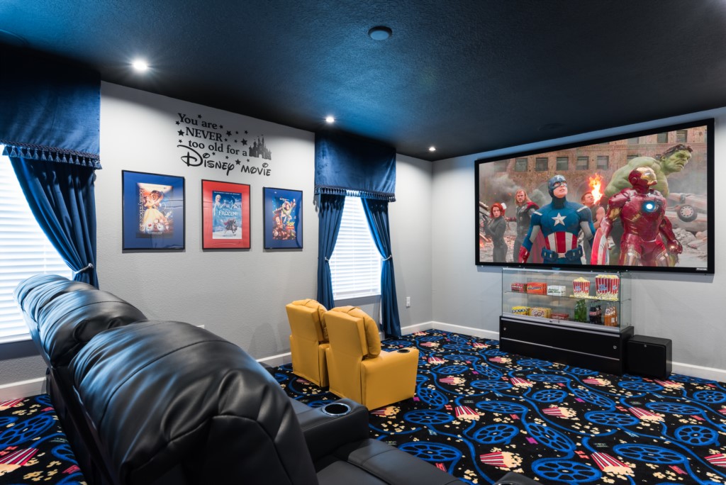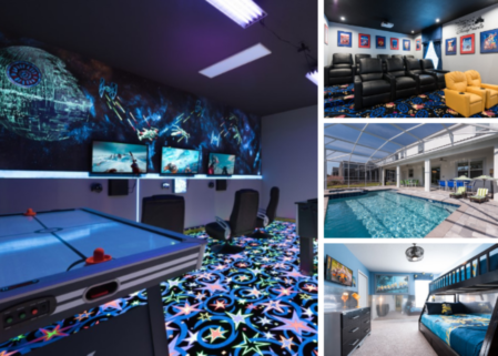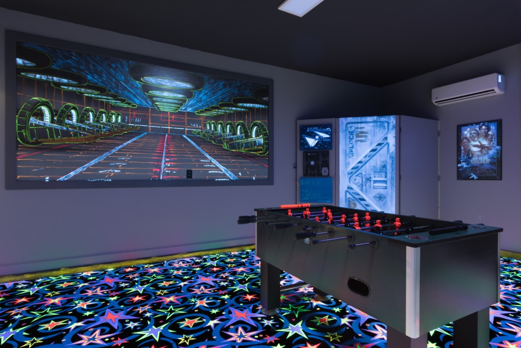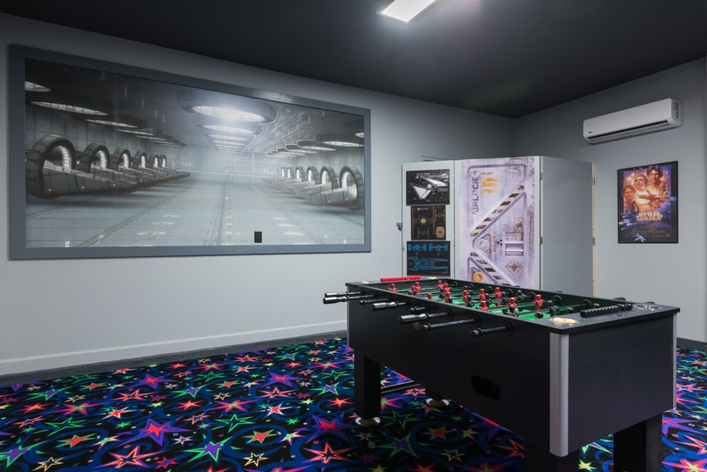 The fun never ends with a 'Star Wars' themed black light games room with video game consoles, a foosball and air hockey table, and a home theater with a large projection screen and black leather reclining chairs!