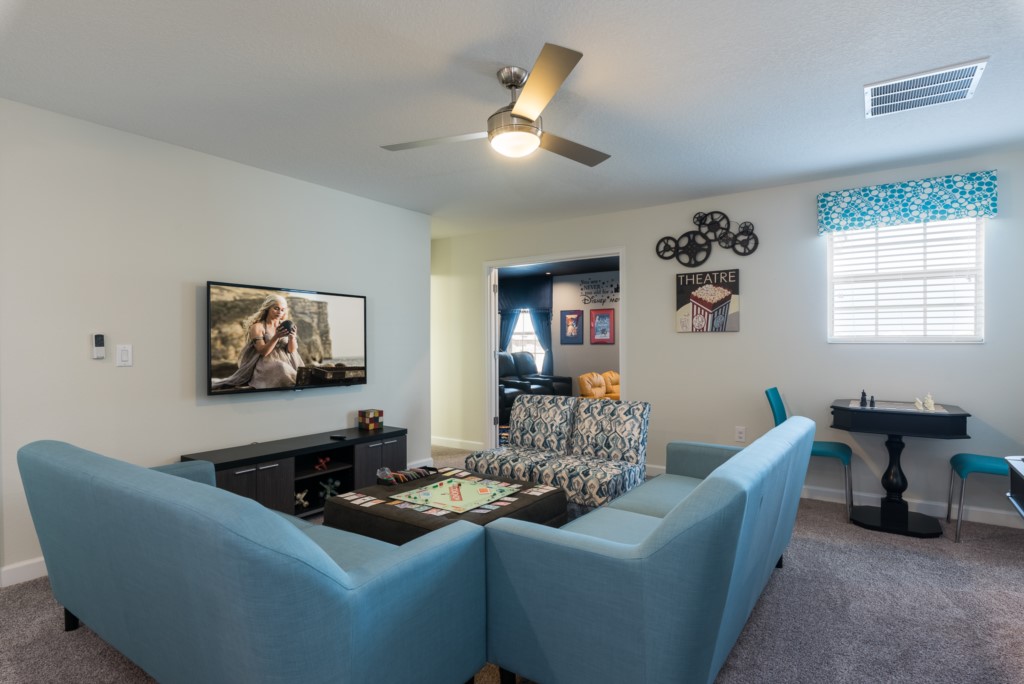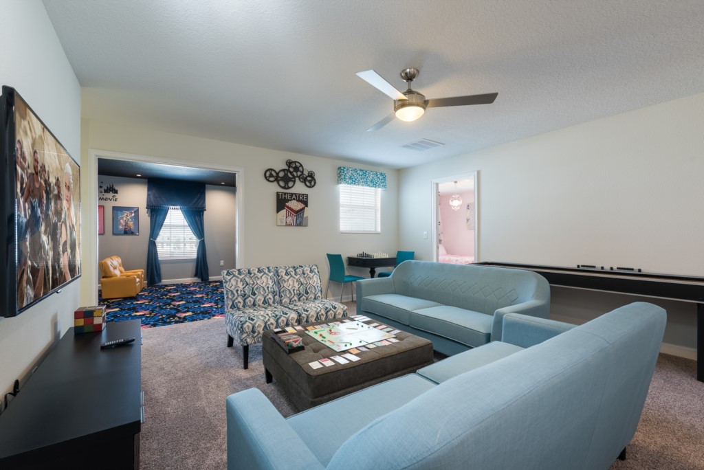 Upstairs loft area has a 55" TV, two sofas, two accent chairs, a chess table with two accompanying chairs, and a 9' shuffleboard table