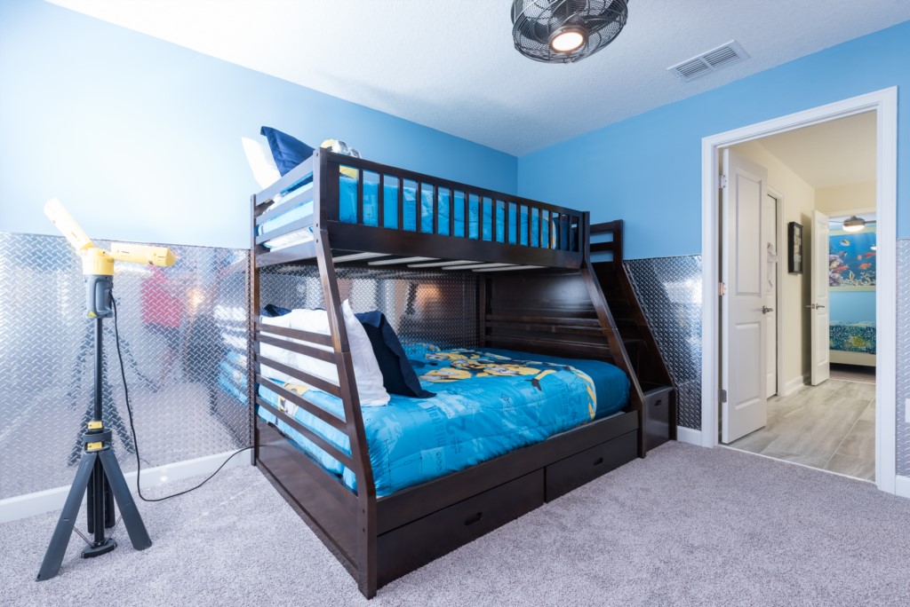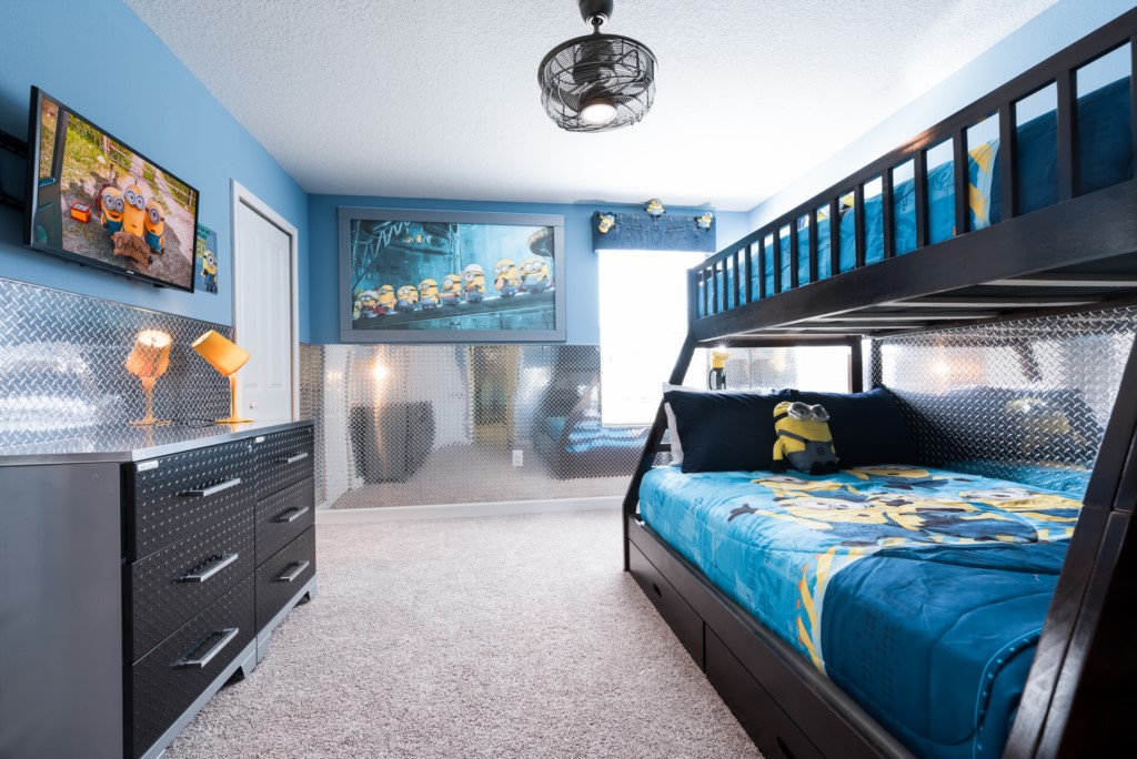 "Minions"- Bunk Beds with a Full and Twin sized bed and a Minions theme; jack and jill style bathroom