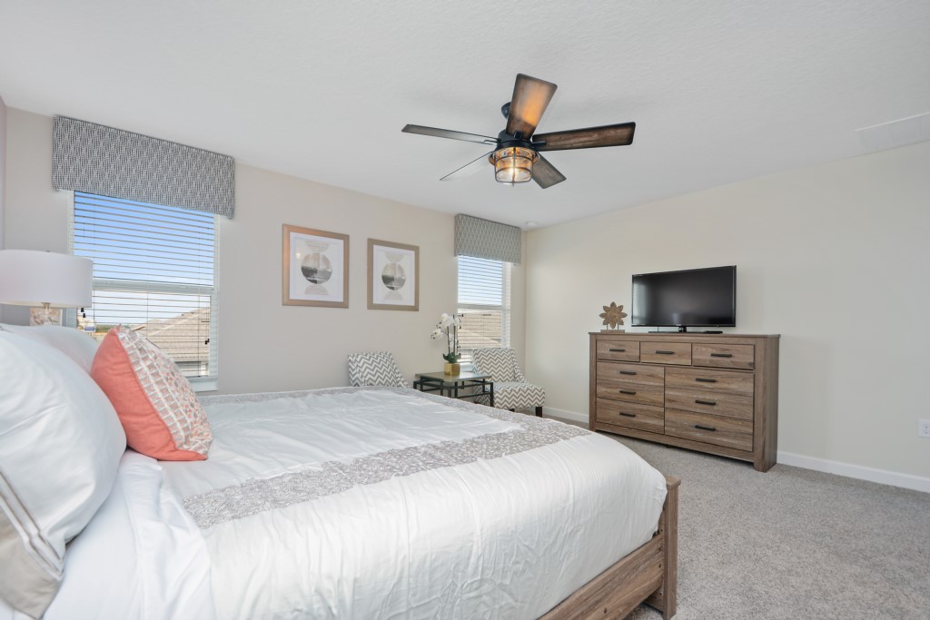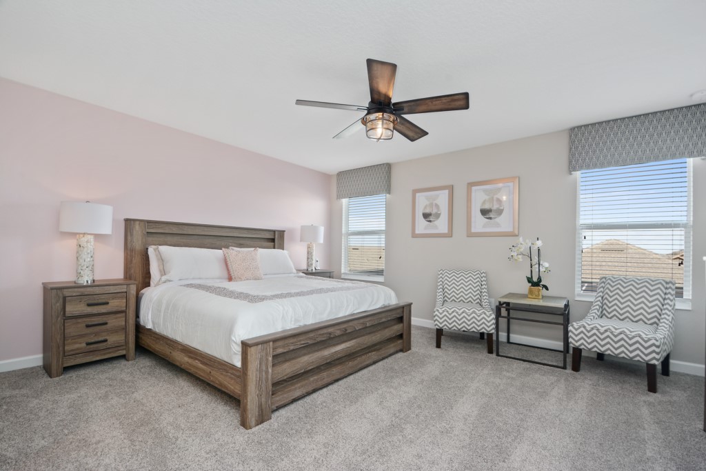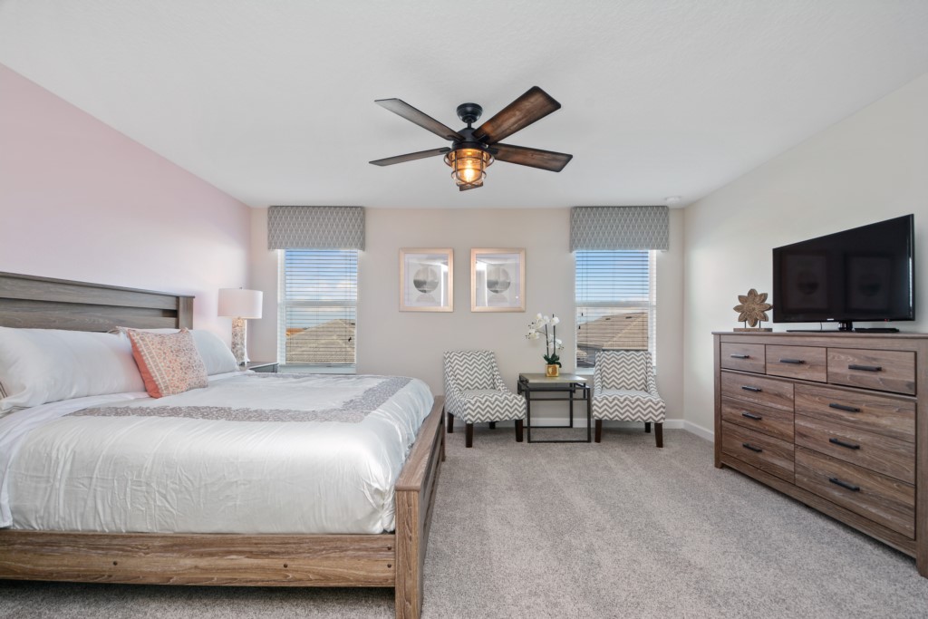 King sized Master with en suite (shower, tub, twin vanities), 2x accent chairs, and a walk in closet