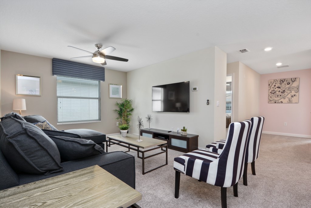 Upstairs loft area has a large flat screen TV, 2x accent chairs, and a sectional